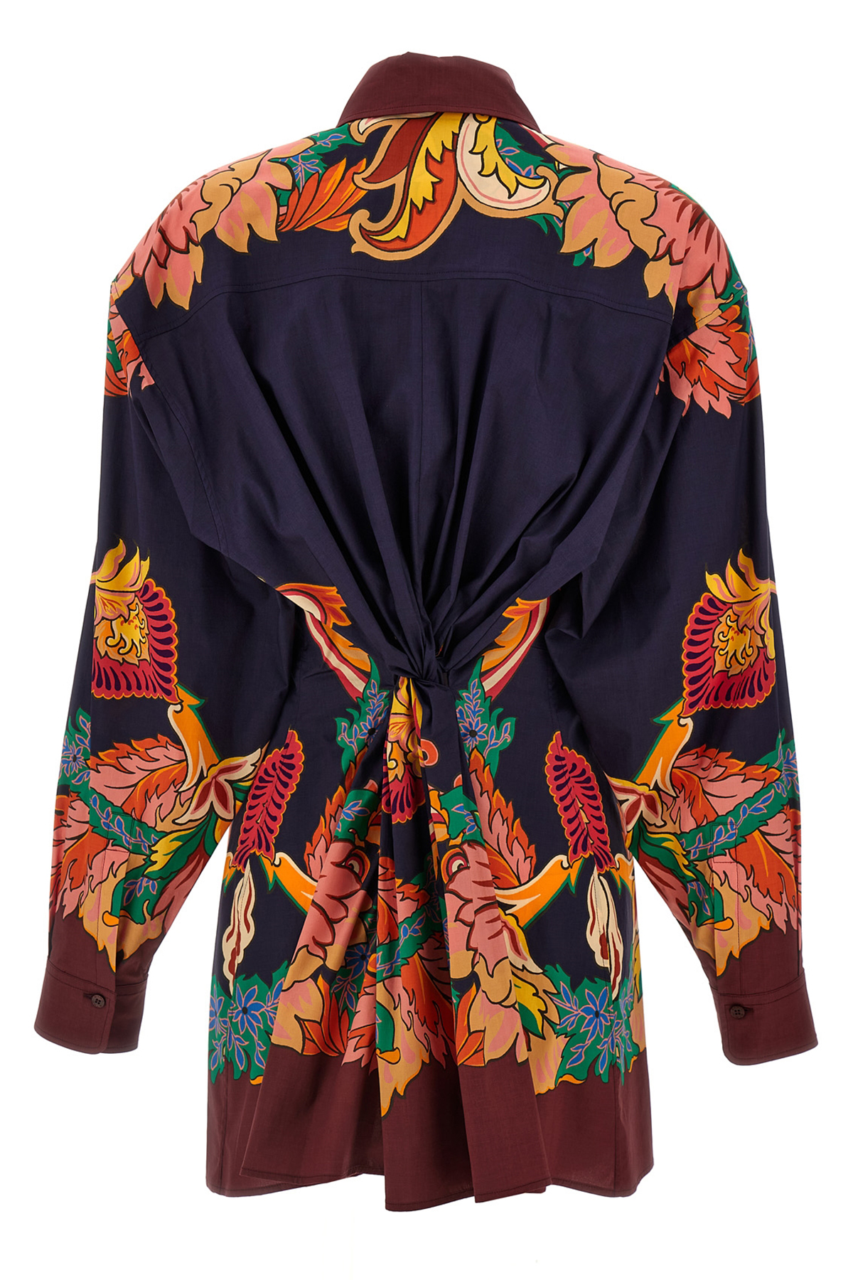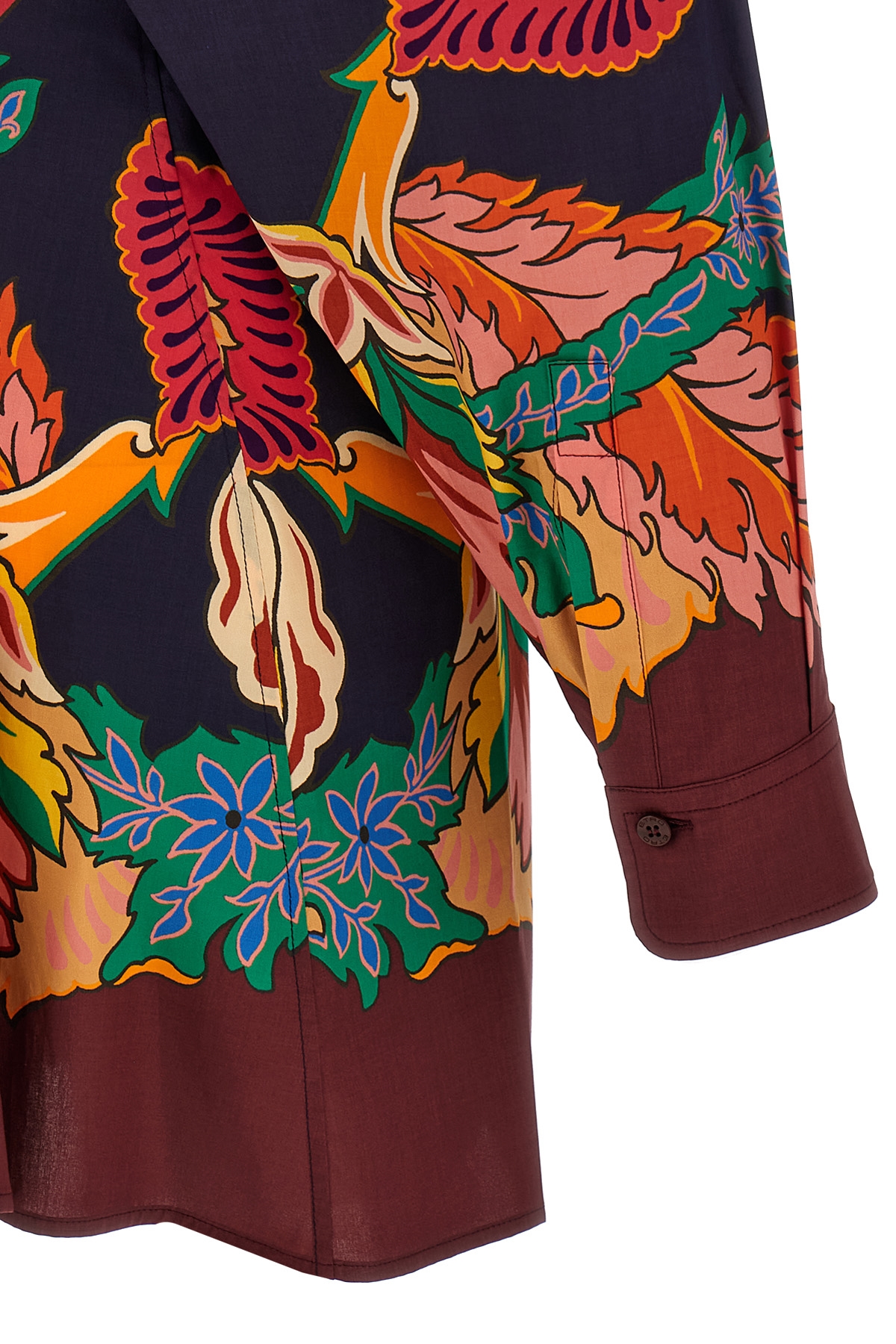 Light stretch cotton poplin shirt with maxi floral placed print inspired by the scarf, sidecut model with scarf detail and back knot, front button closure, breast pocket, long cuffed sleeves.