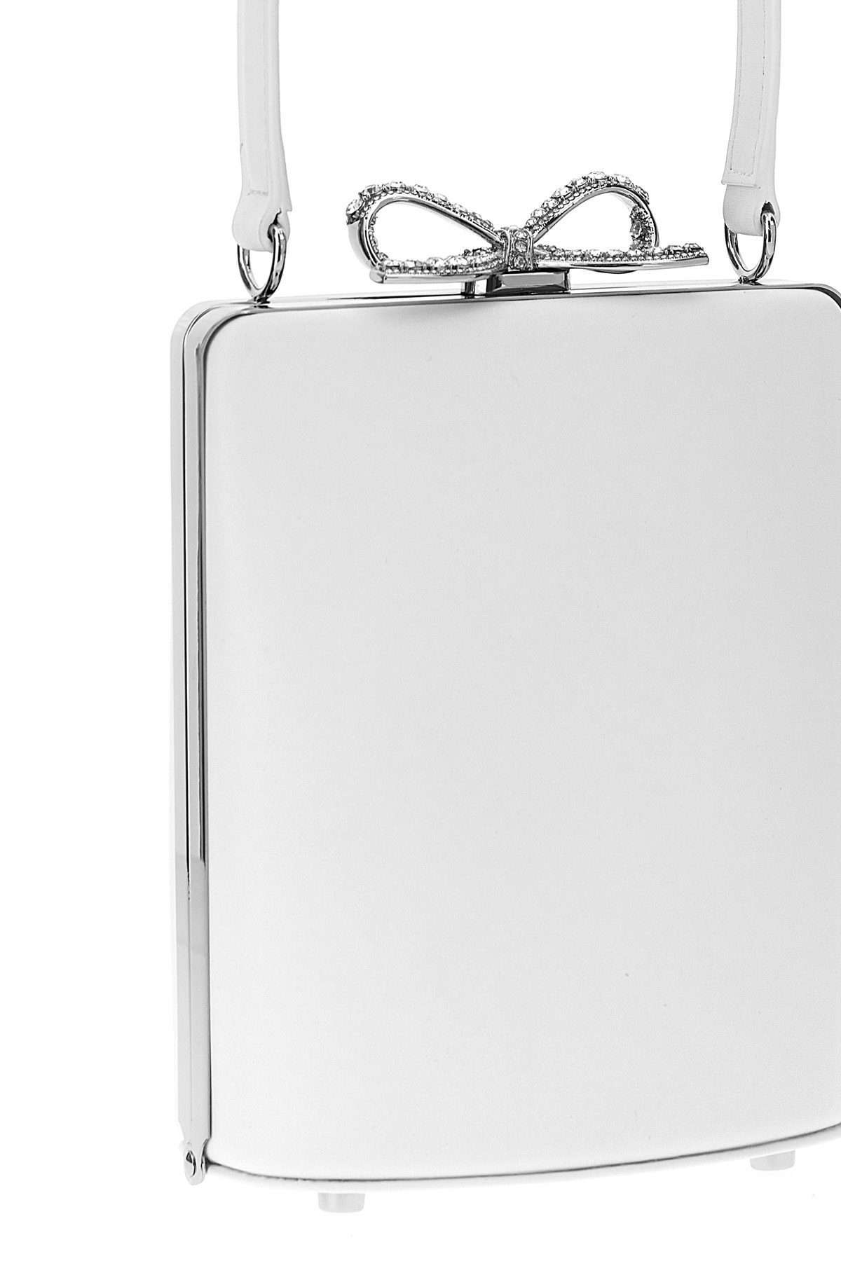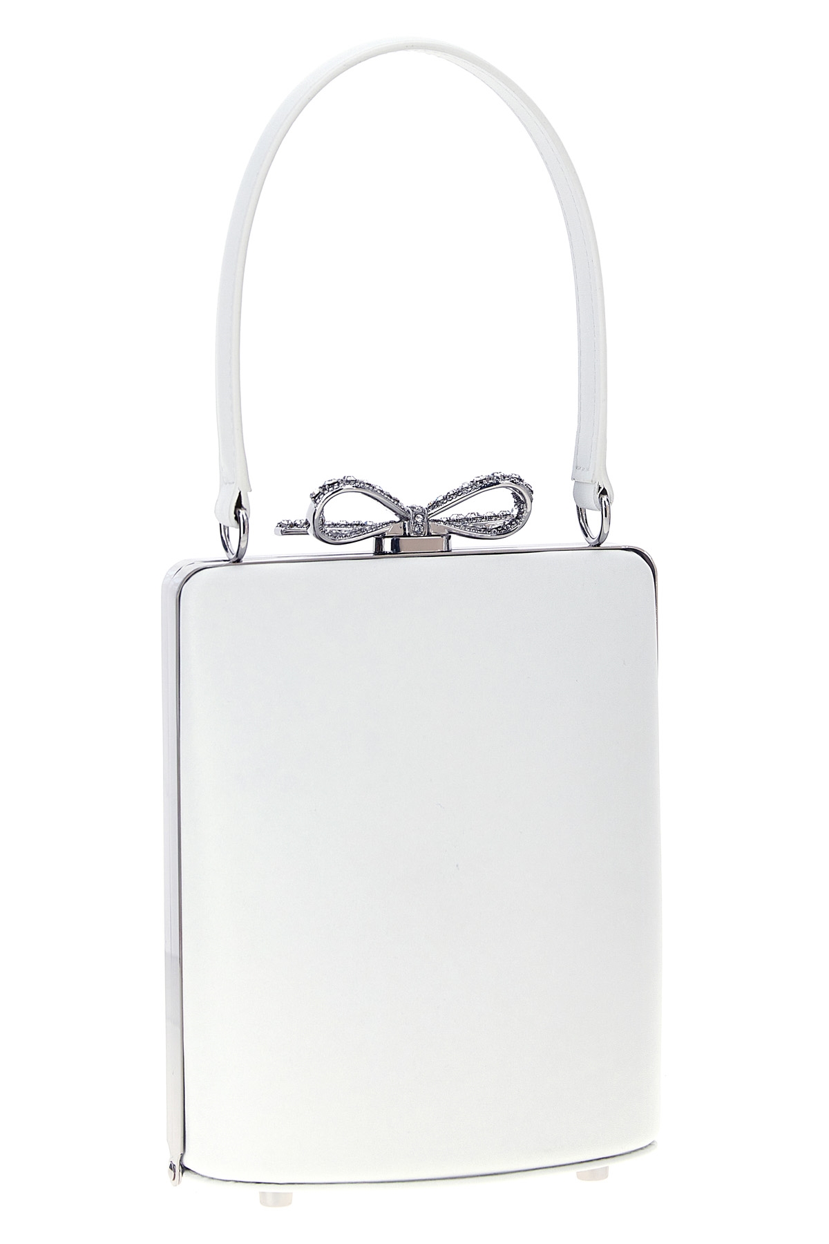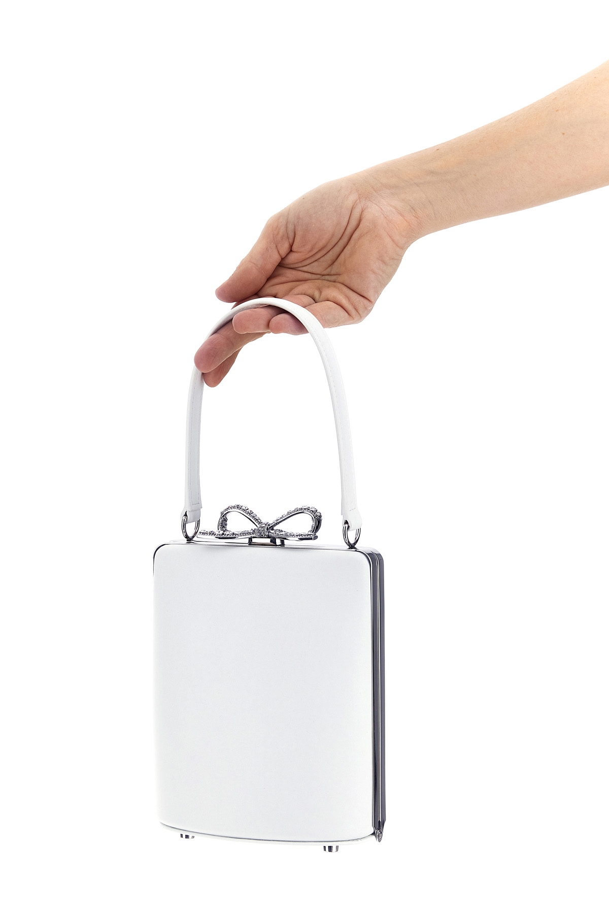 'Cream Leather Mini Bow' leather handbag with metal details, fixed handle, snap closure with rhinestone bow detail.