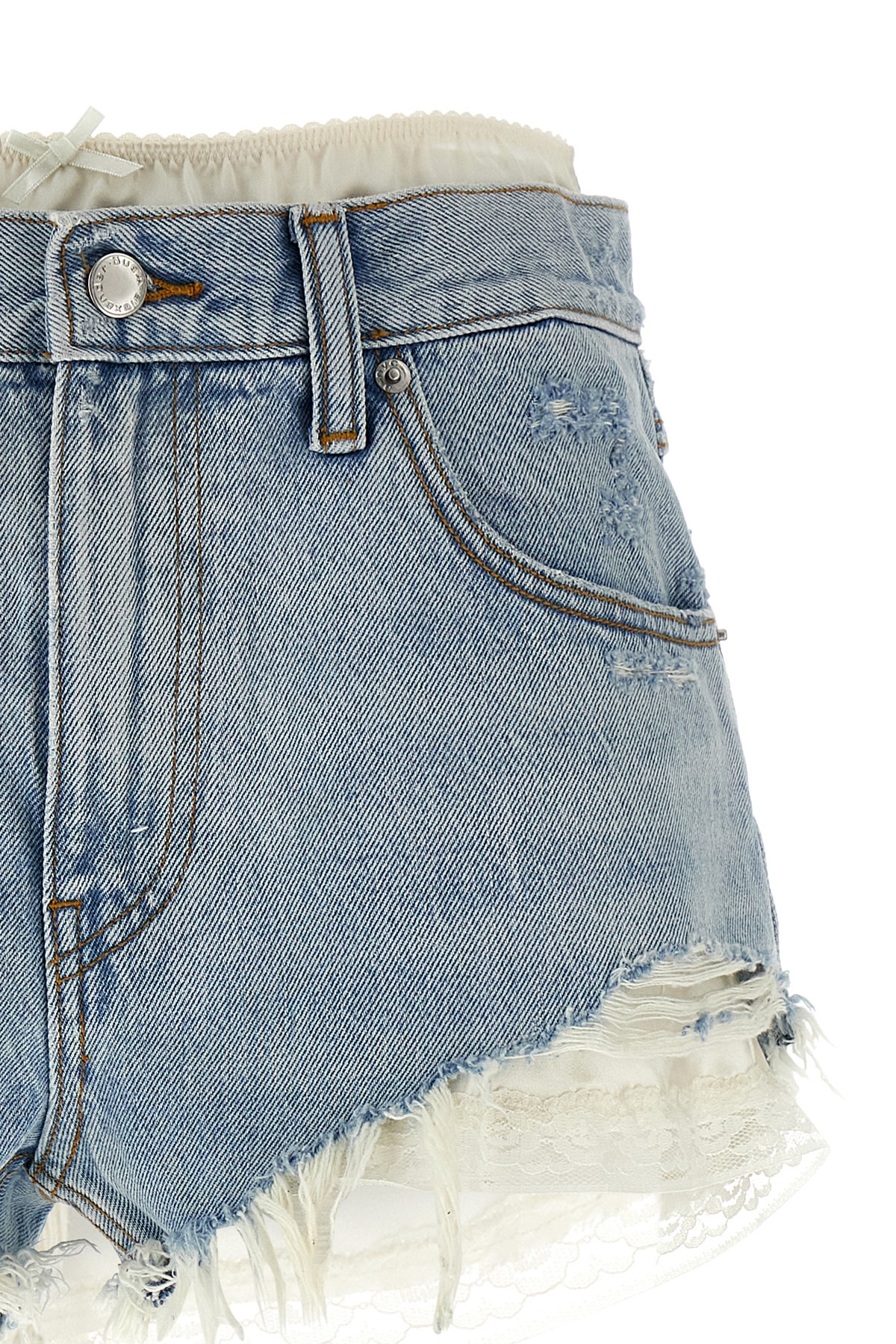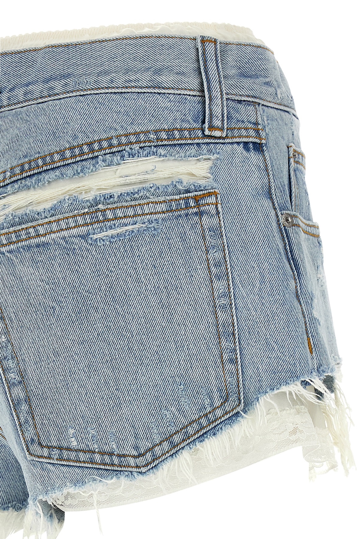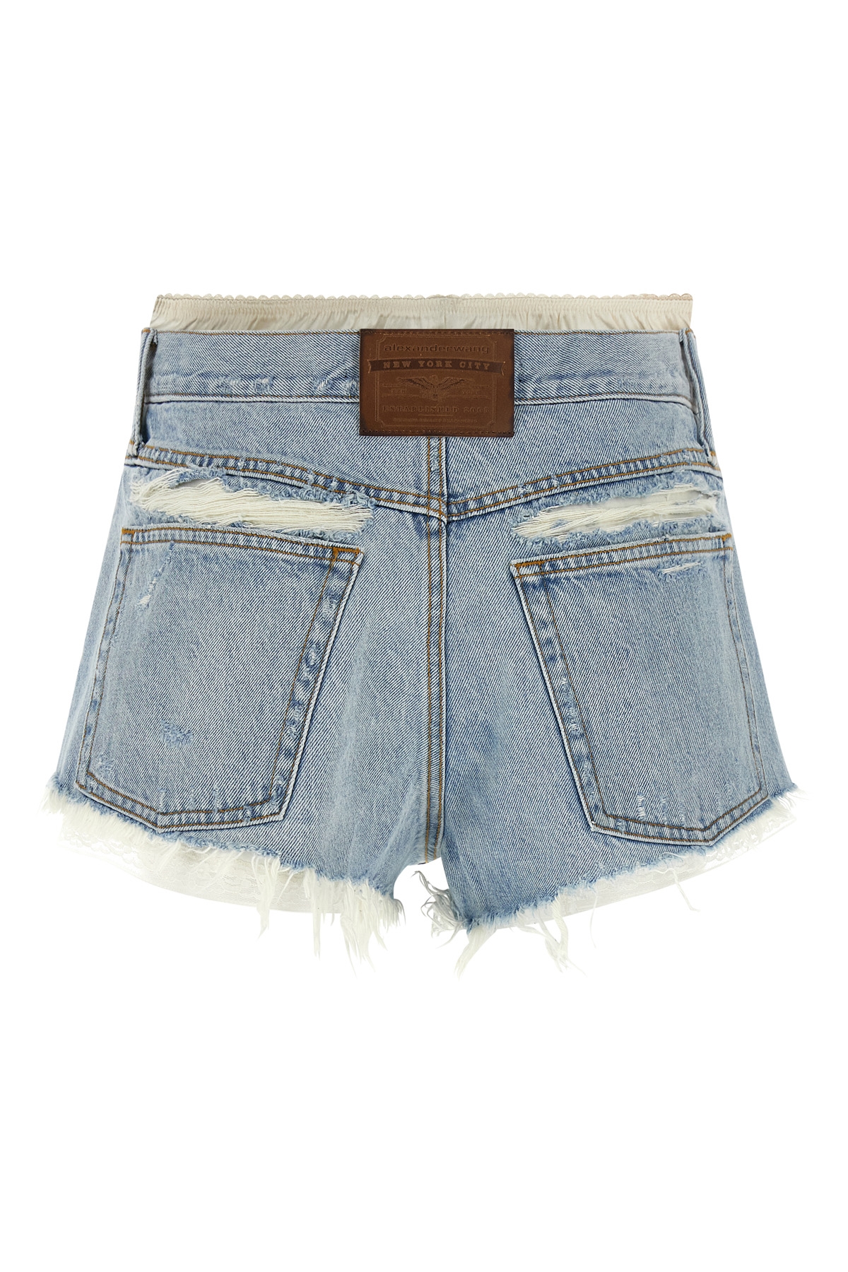 Cotton denim shorts with rips, zip and button closure, five pockets, layered detail with silk briefs with lace piping, and leather logo label at the back.
