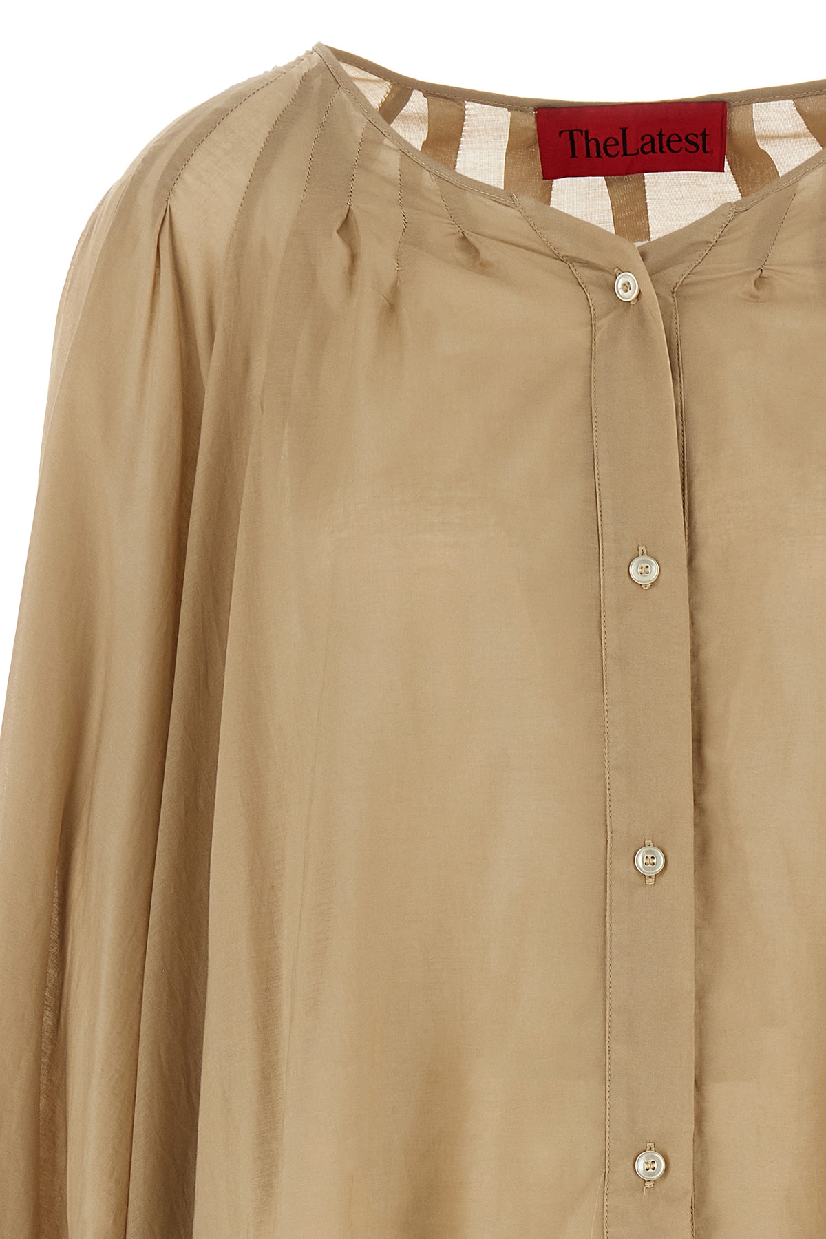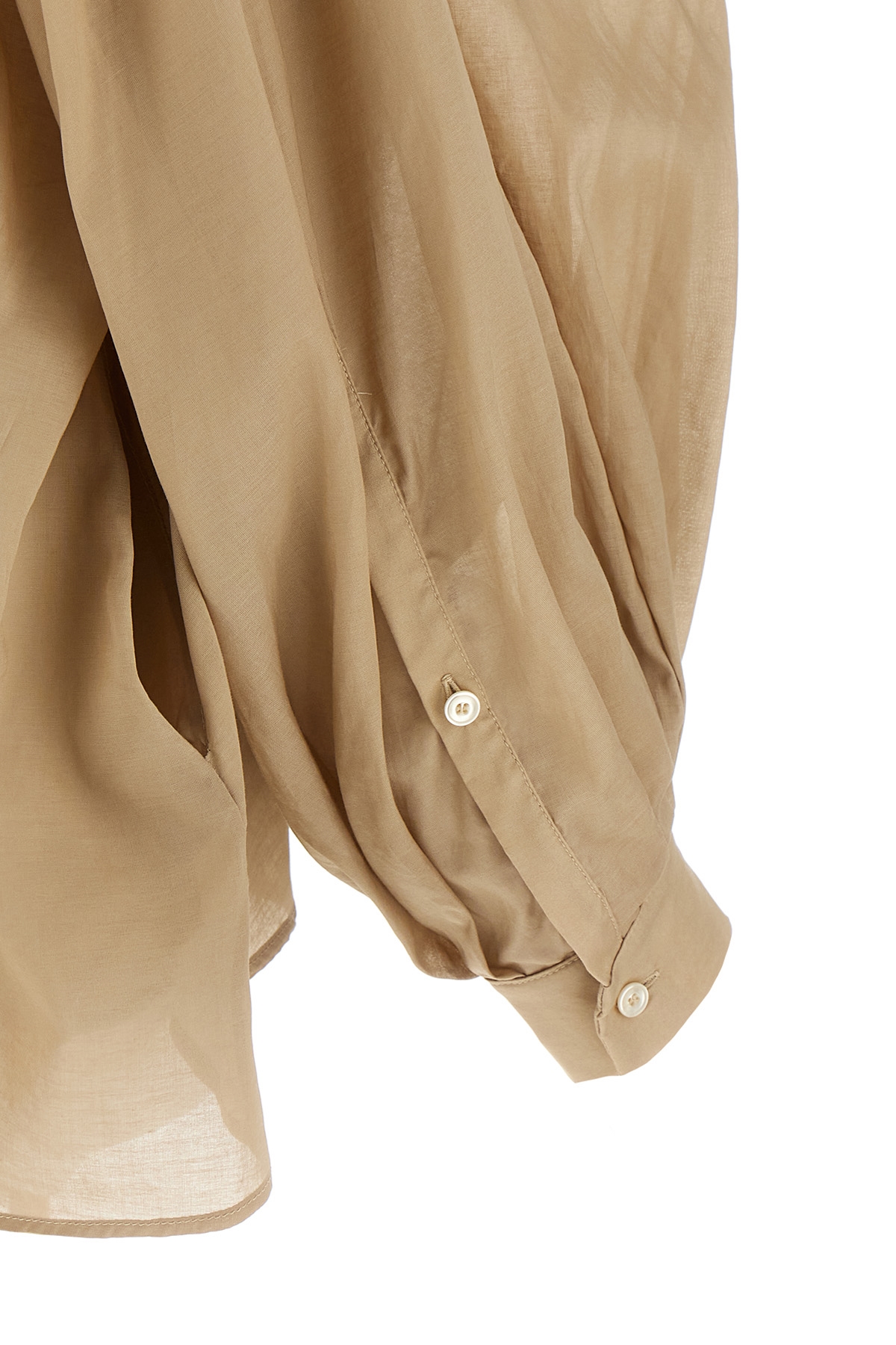'Biro' cotton blend overshirt with round pleated neckline, button closure, long wide cuffed sleeves.