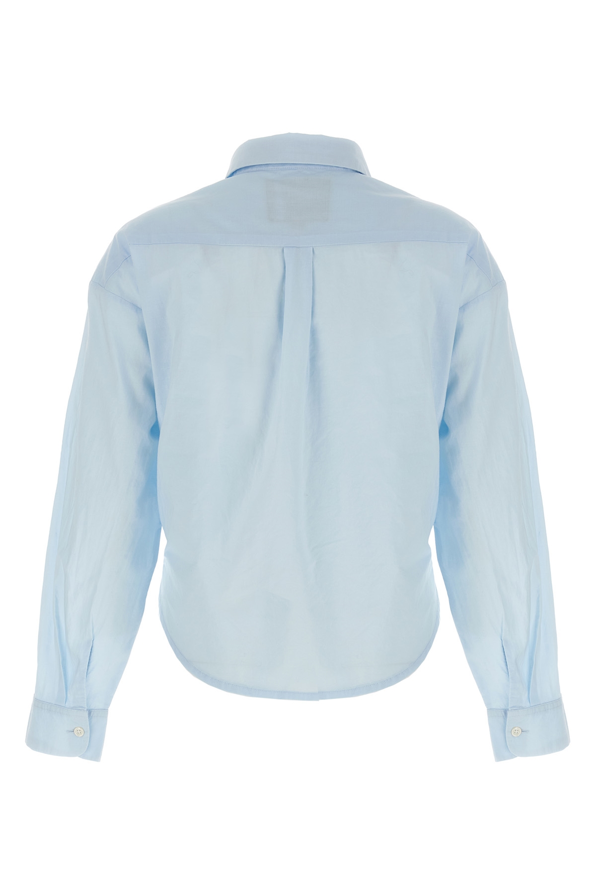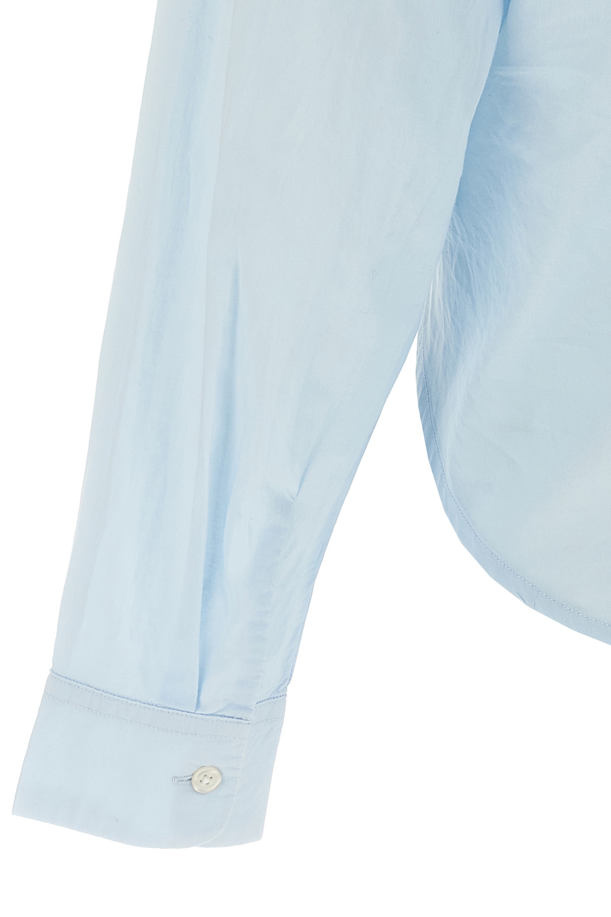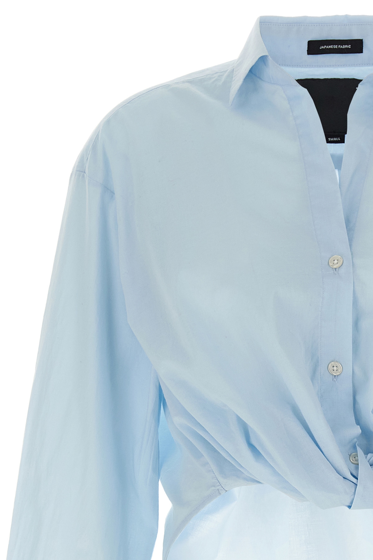 'Twisted Front' asymmetrical shirt in light cotton with front curl, button closure, long cuffed sleeves and dropped shoulders.