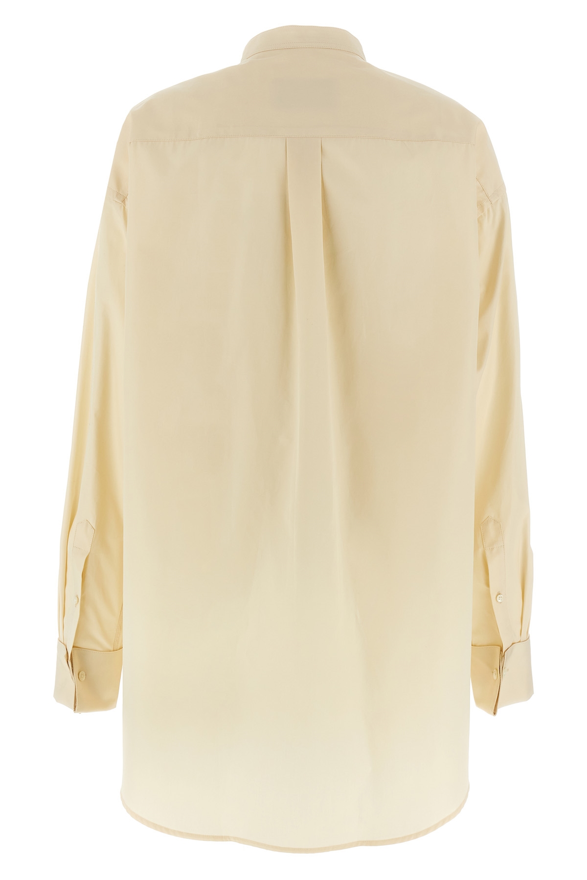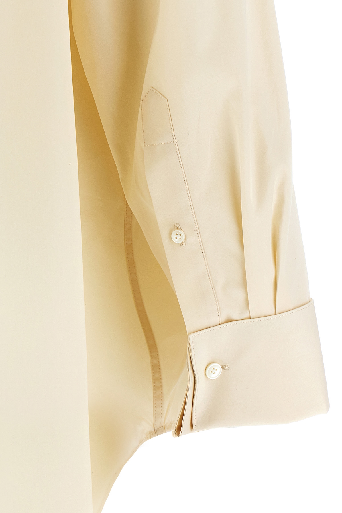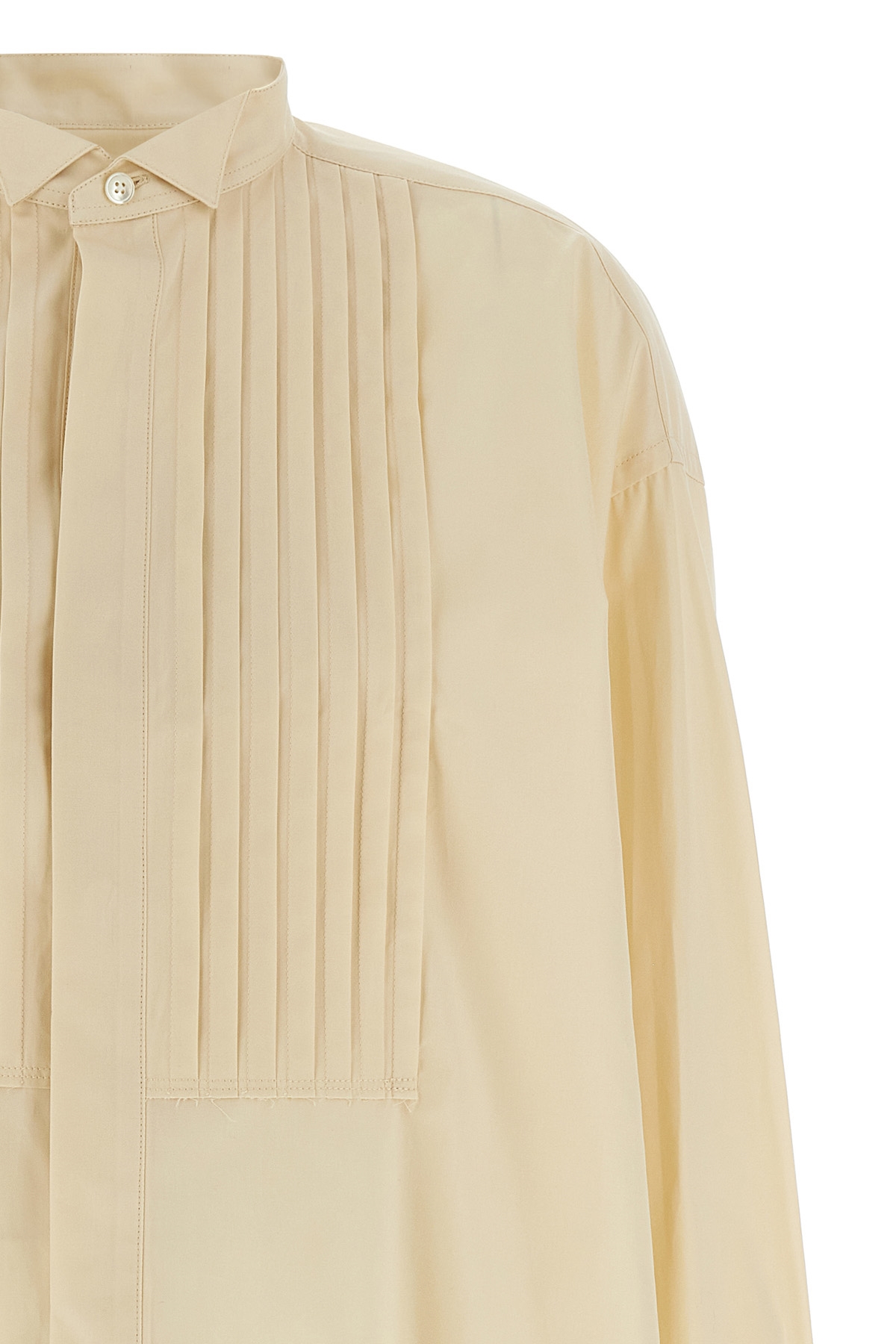 Cotton poplin shirt with pleated bib, front button closure, flap collar, long wide sleeves with cufflinks.