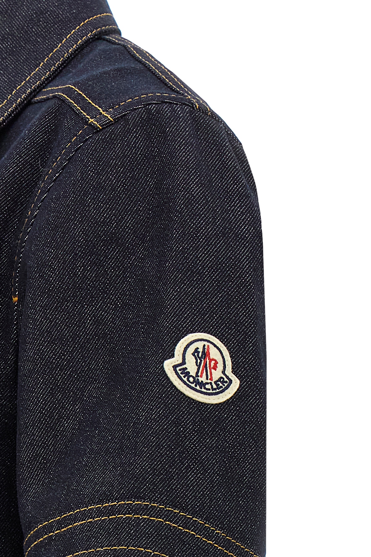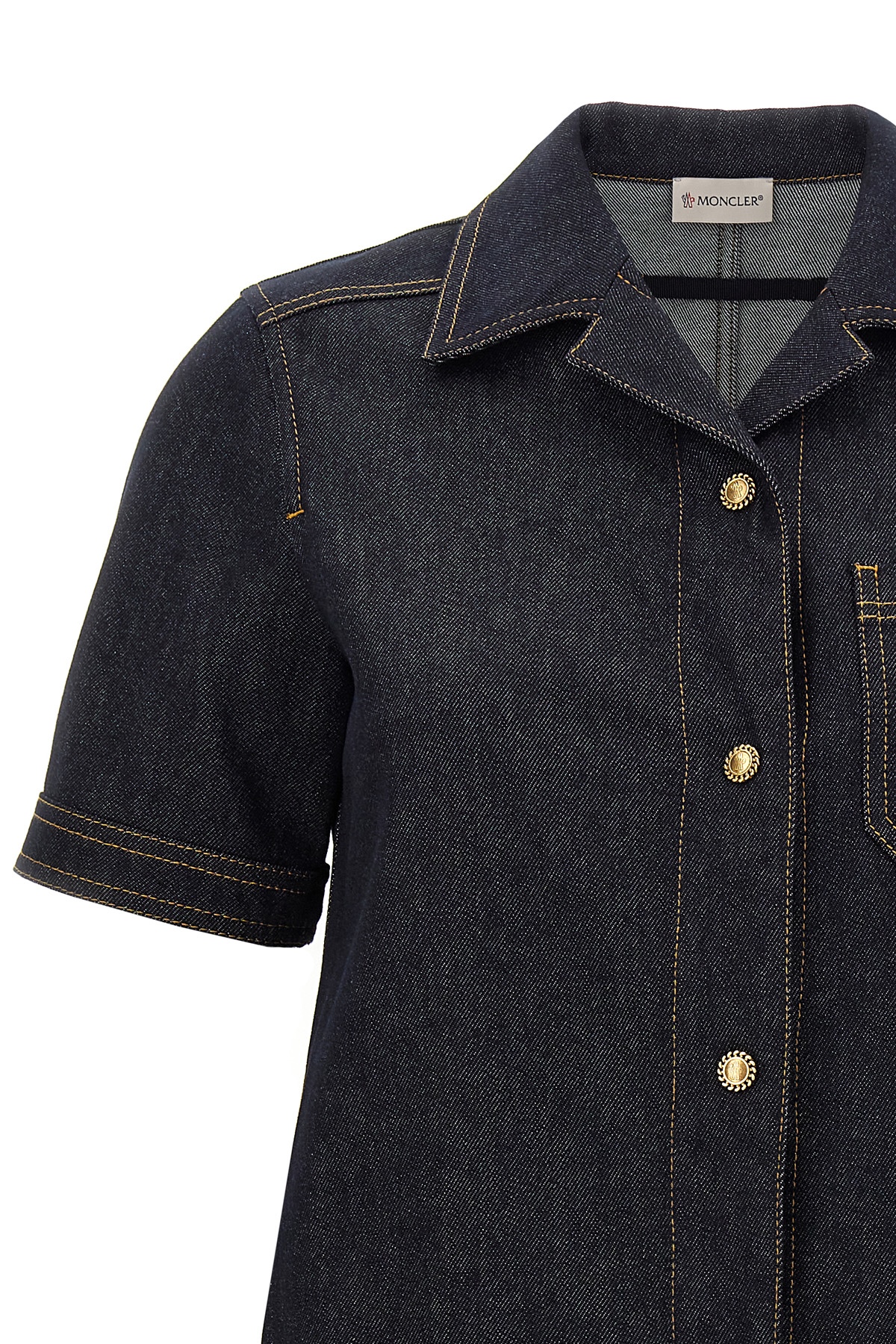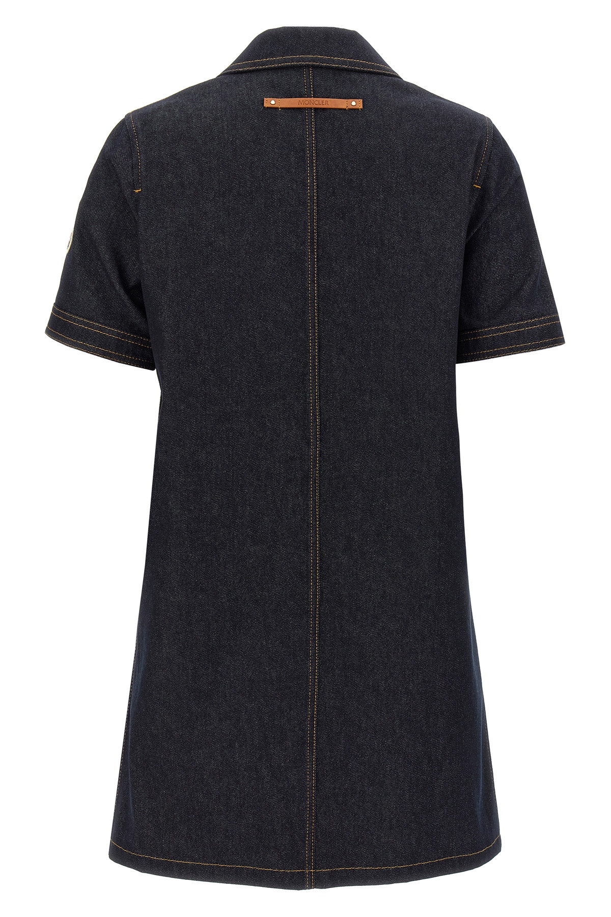 Chemisier denim mini dress with front snap button closure, contrast stitching, pockets, cotton lining, short sleeves with felt logo patch.