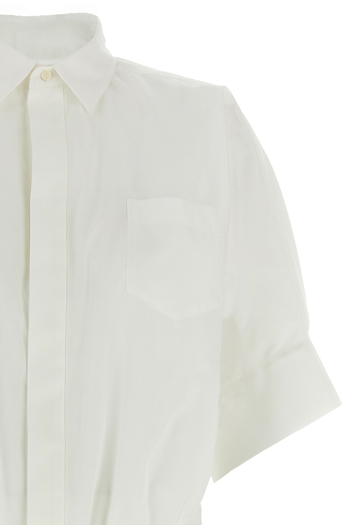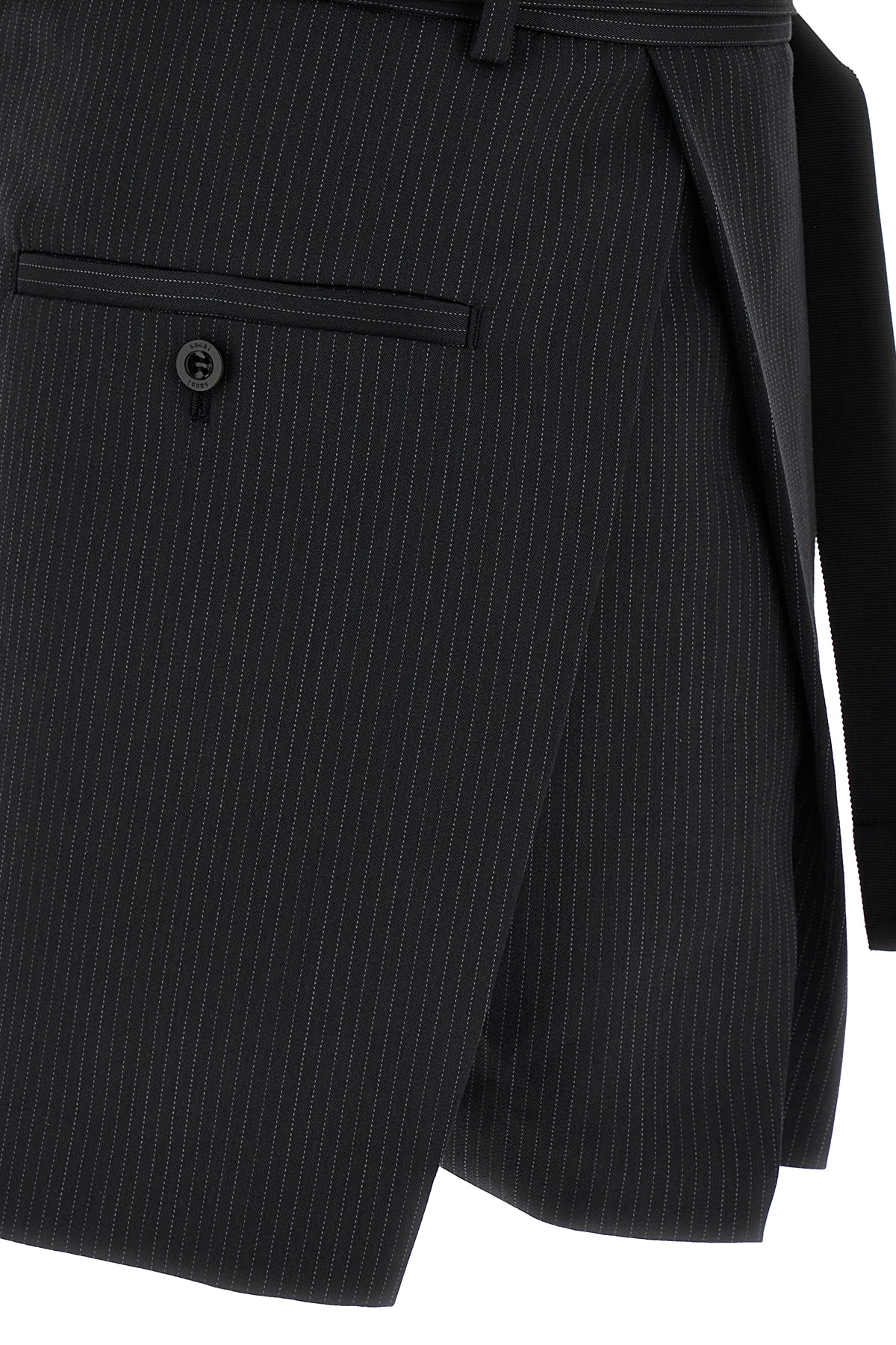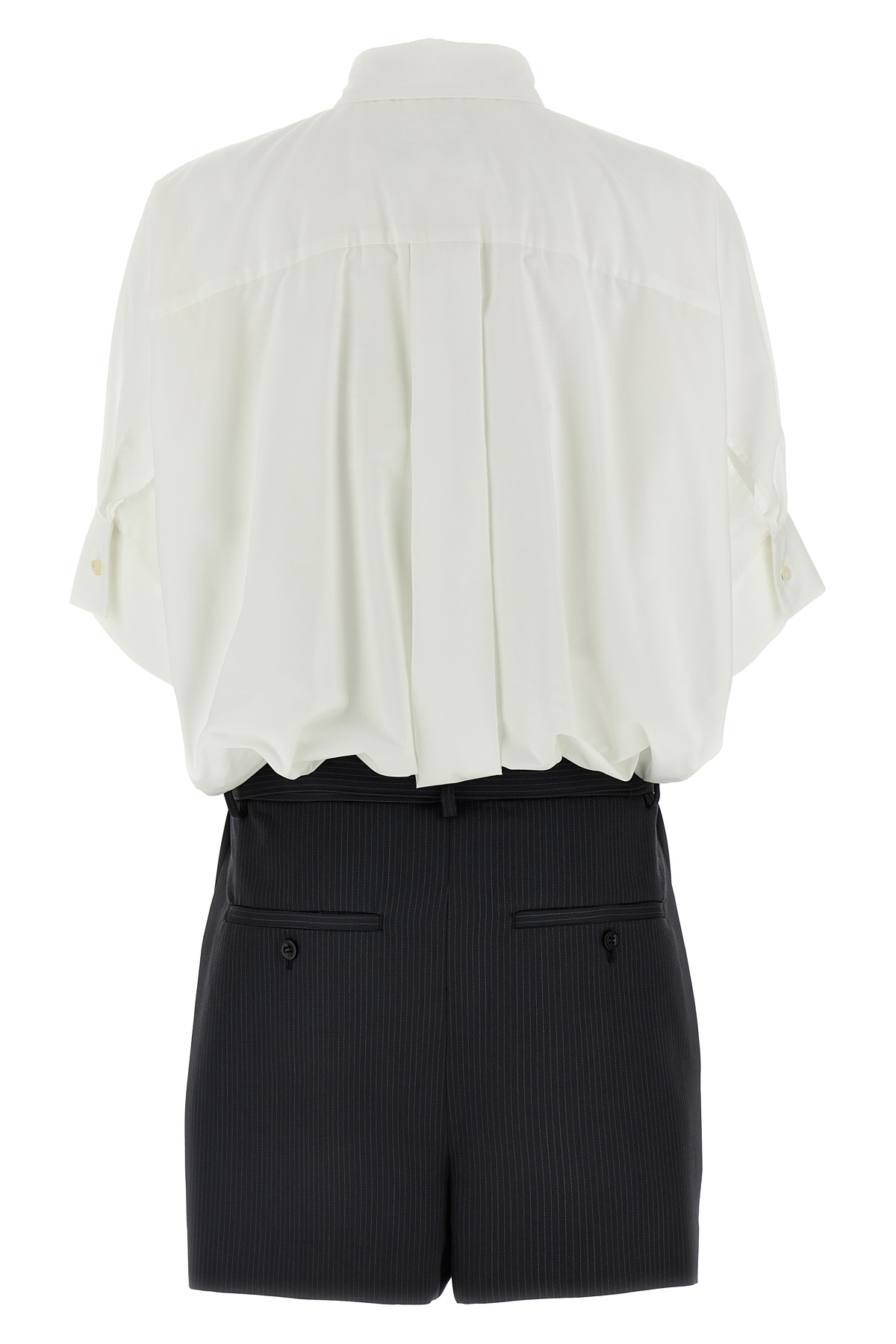 Mini dress consisting of shirt and skirt with solid poplin shirt, chest pocket, short bat sleeves, front button closure and mini skirt in pinstriped wool with panel construction, pockets, zip and front hook closure, adjustable and removable belt.