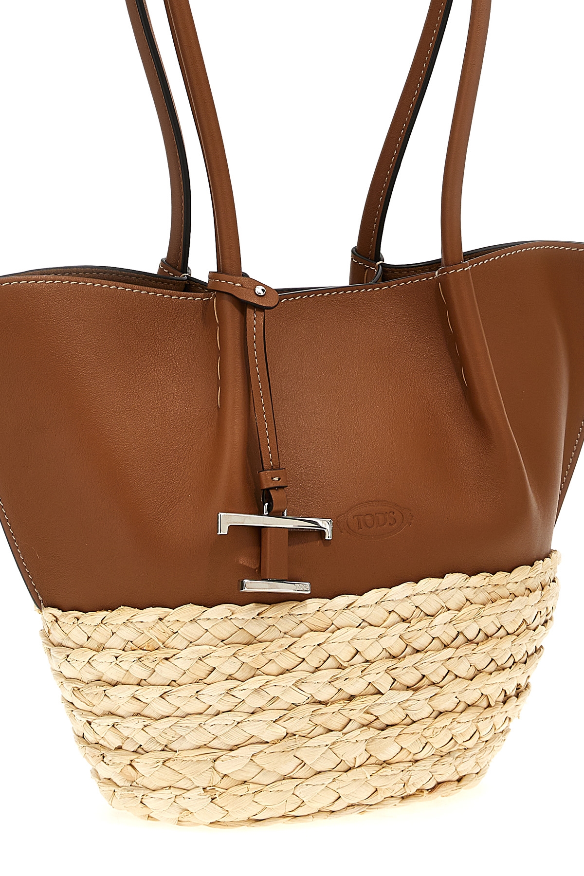 'Bux' small leather shopping bag with woven straw bottom, front embossed logo, double fixed handle, magnetic closure.