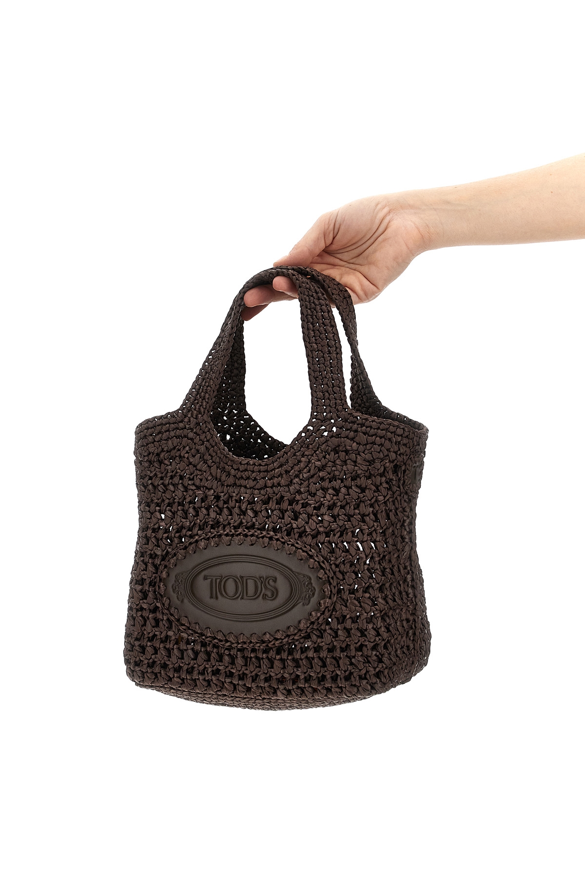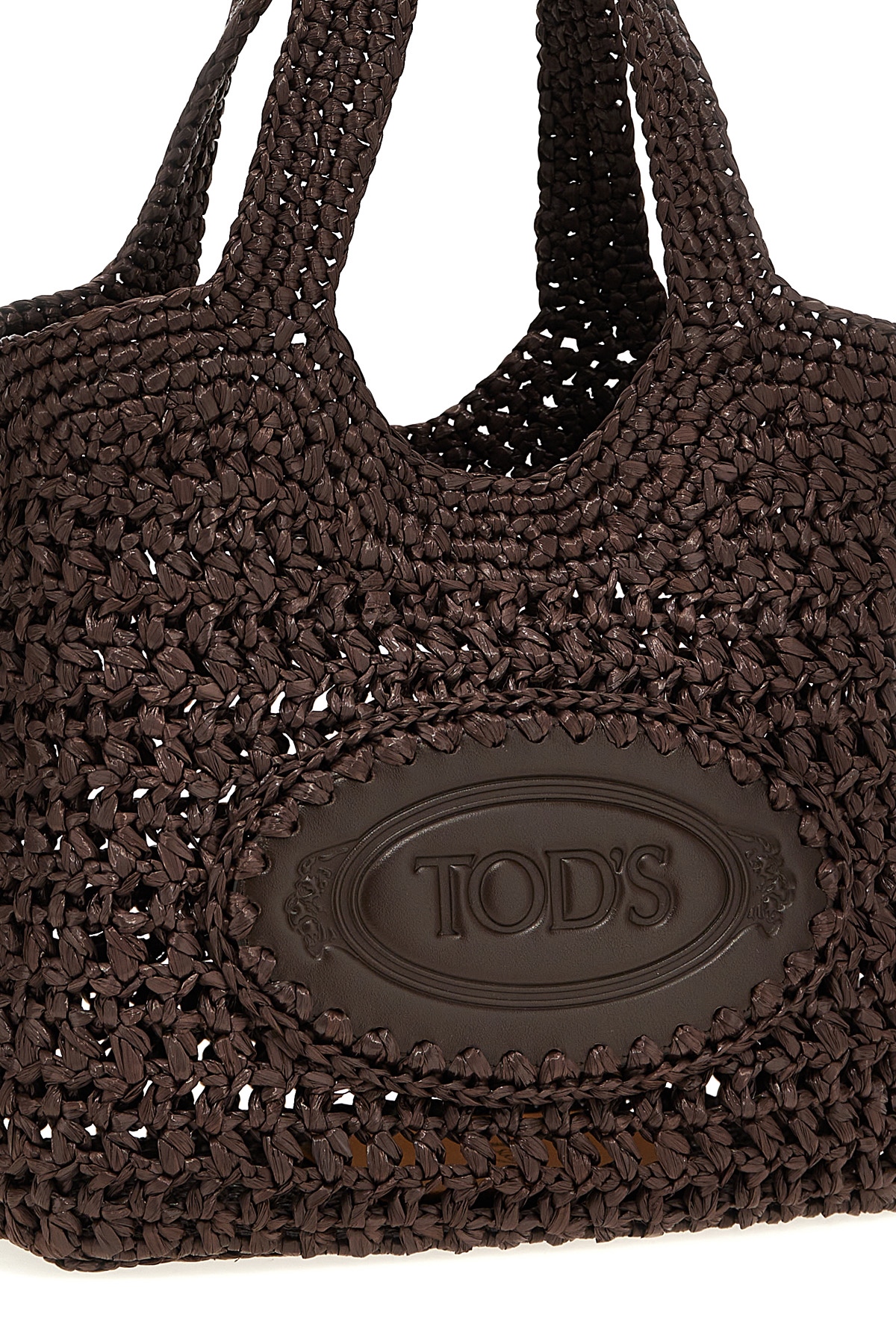 Small viscose raffia shopping bag with handcrafted crochet processing, leather oval with embossed logo, double fixed handle, adjustable and removable leather shoulder strap.