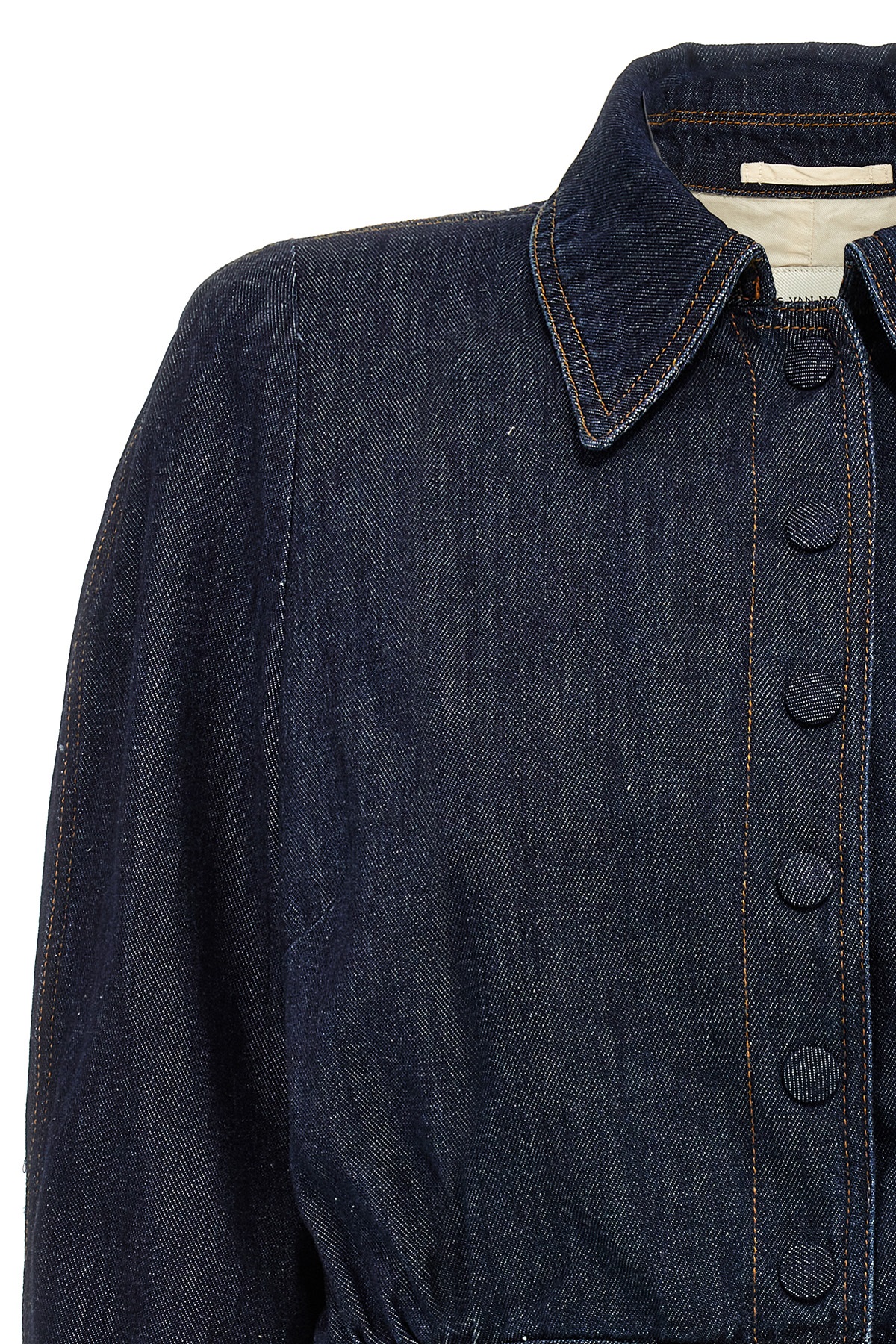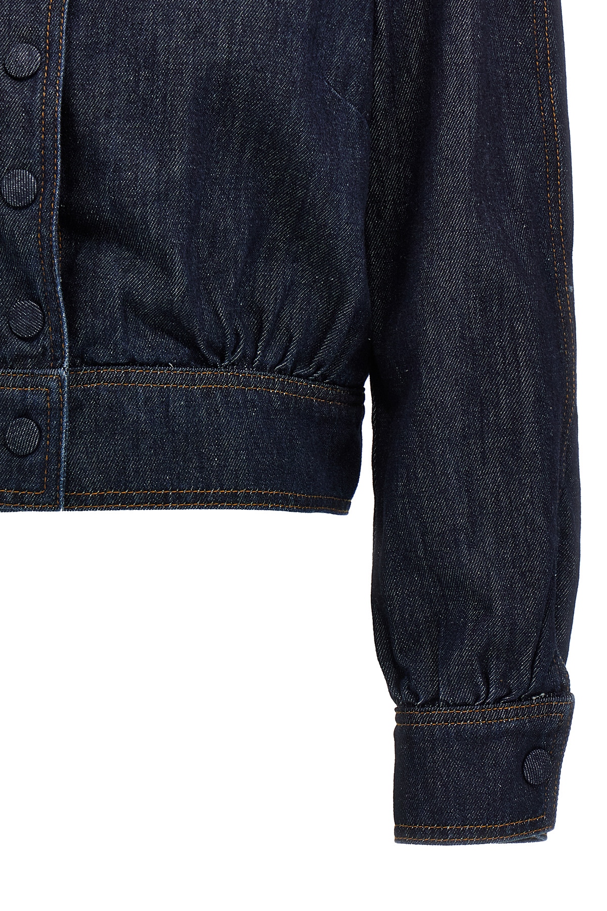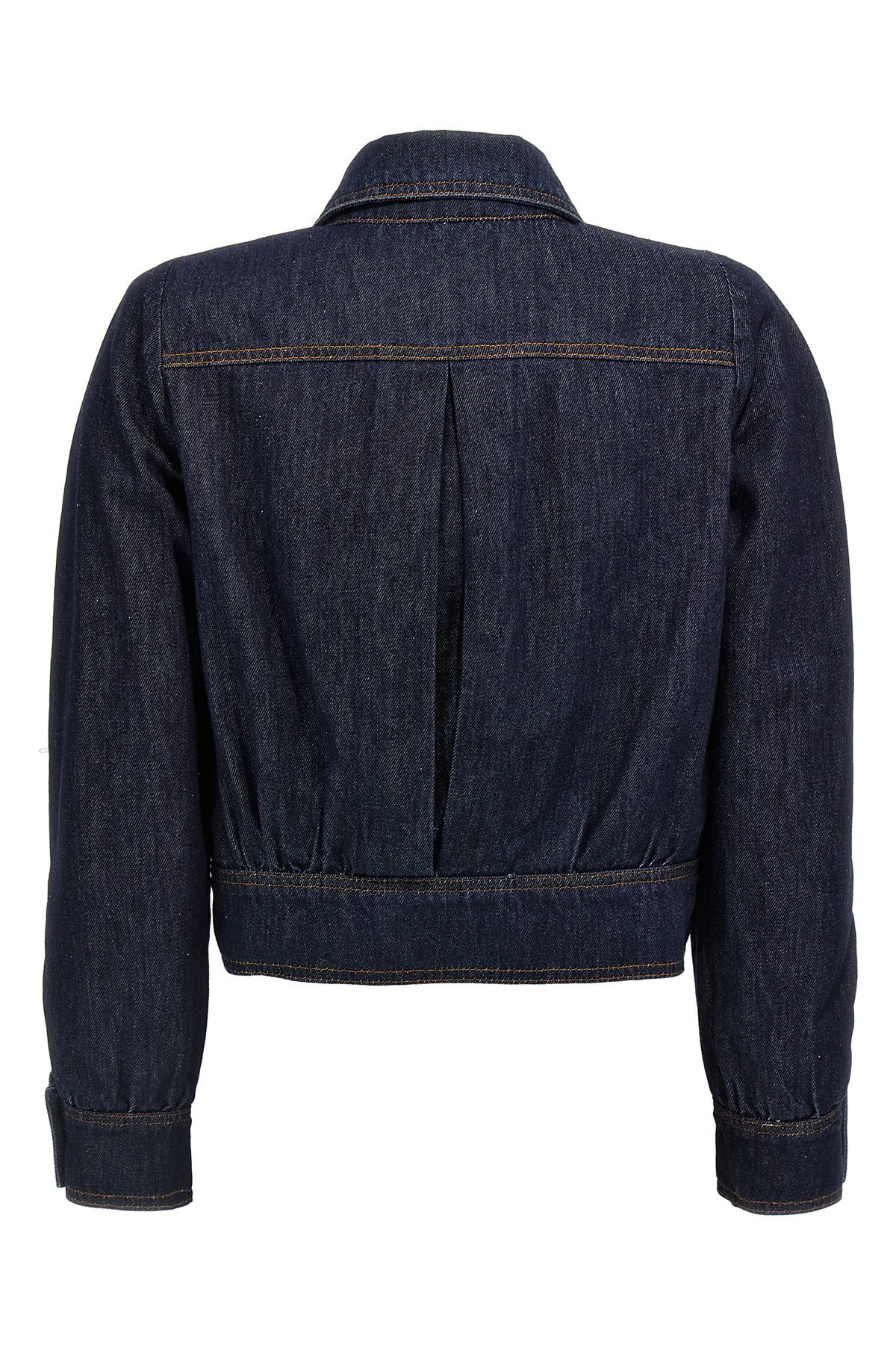 'Vistam' crop jacket in cotton denim with contrast stitching, front snap button closure, shirt collar, long cuffed sleeves, padded shoulders.