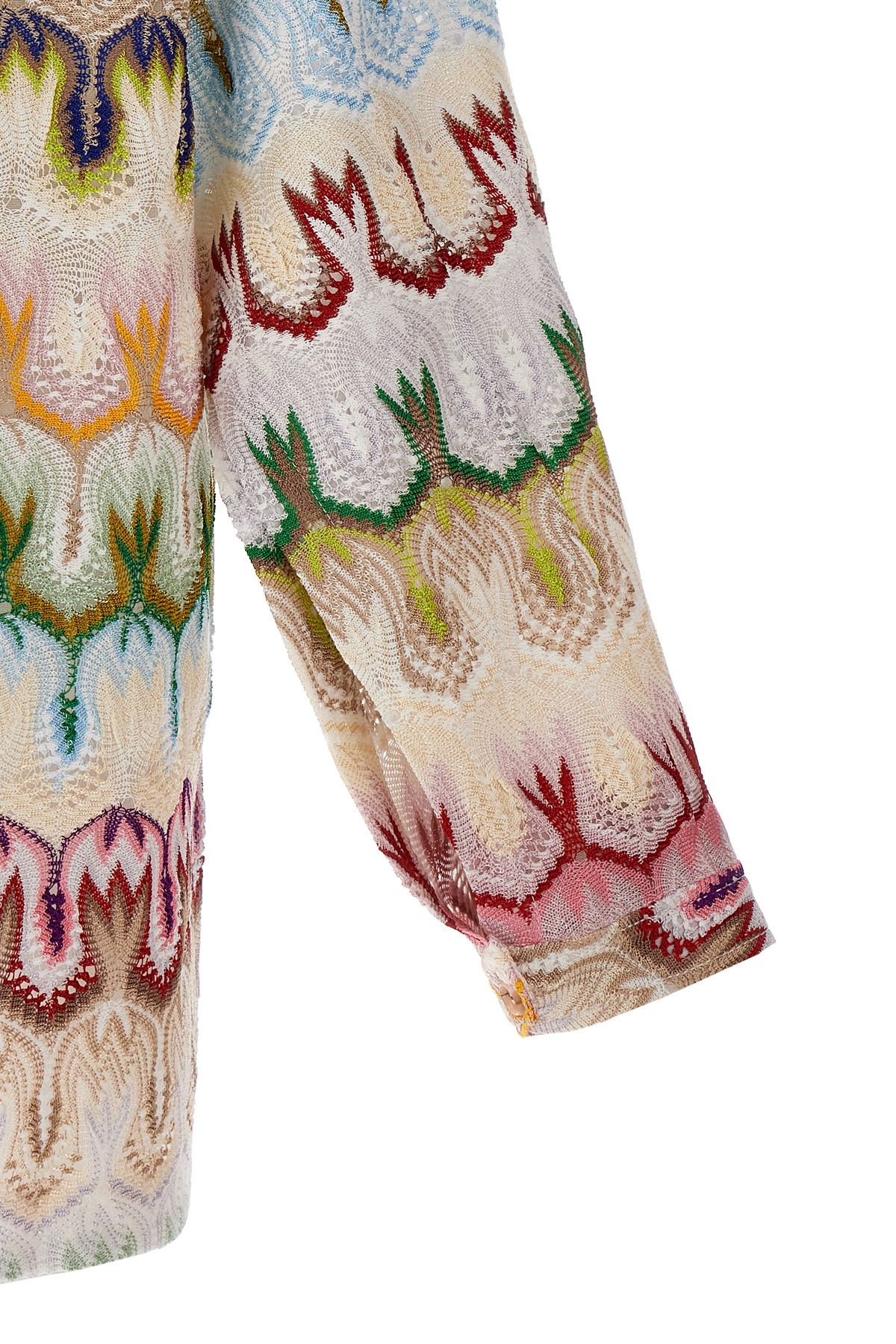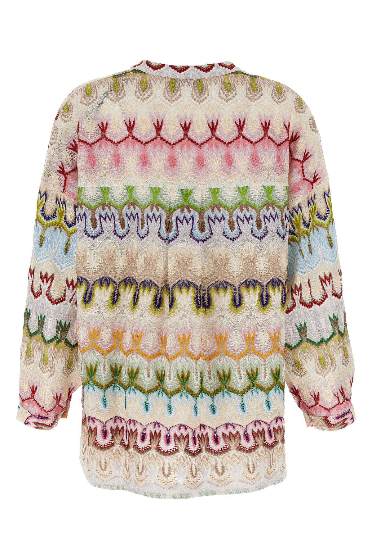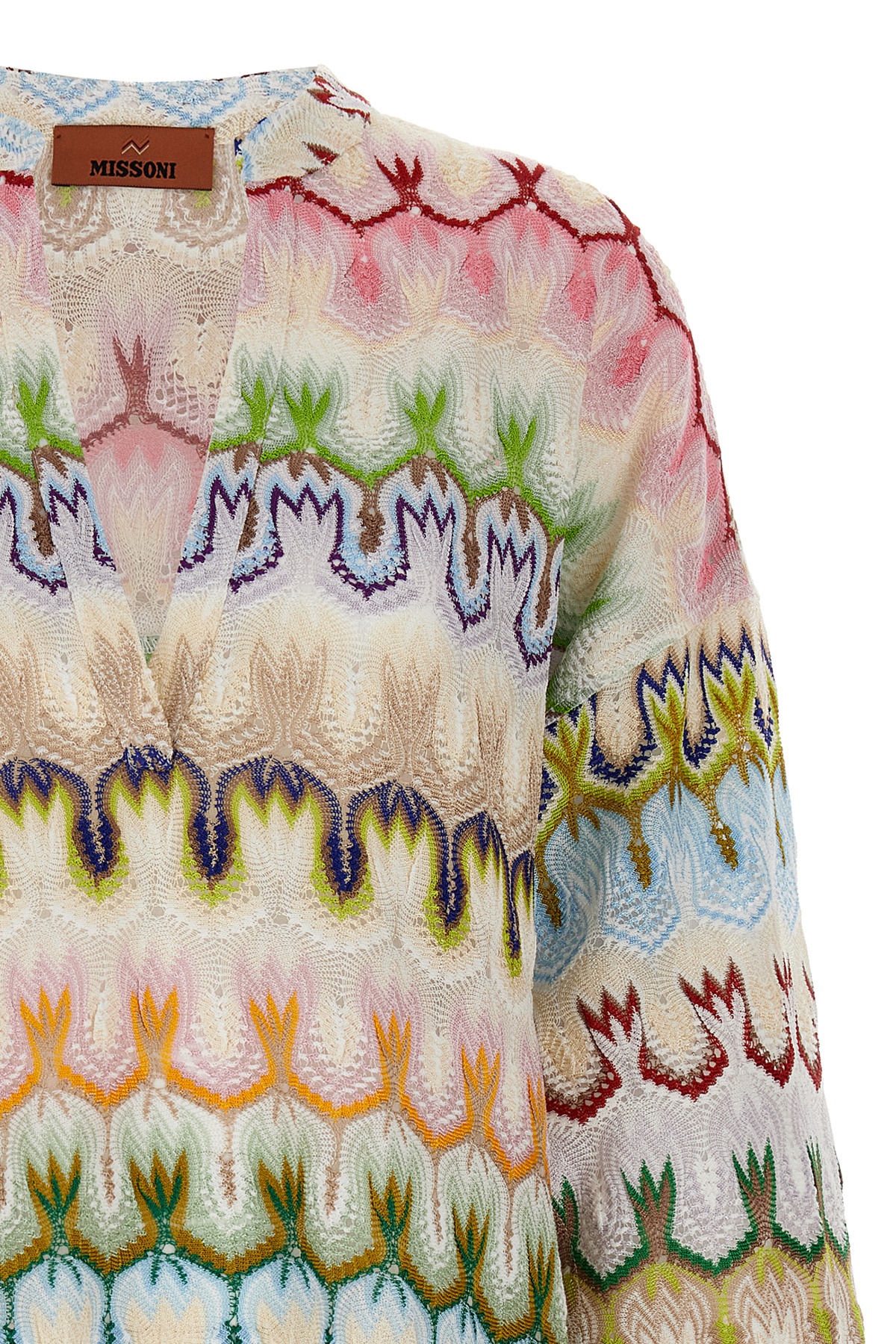 Knitted degrade lace effect viscose blouse, V-neck, 3/4 sleeves with dropped shoulder, side slits.