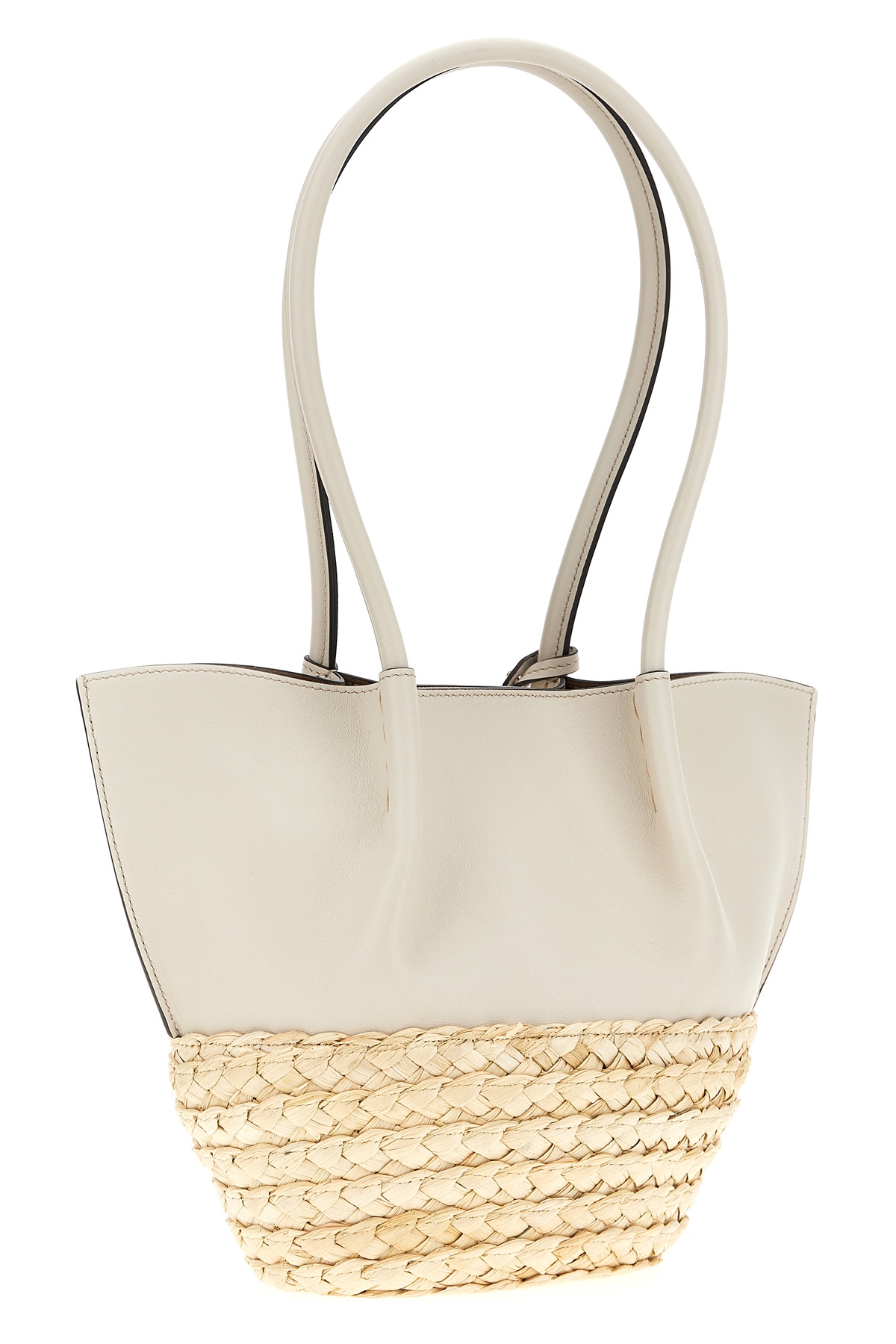 'Bux' small leather shopping bag with woven straw bottom, front embossed logo, double fixed handle, magnetic closure.