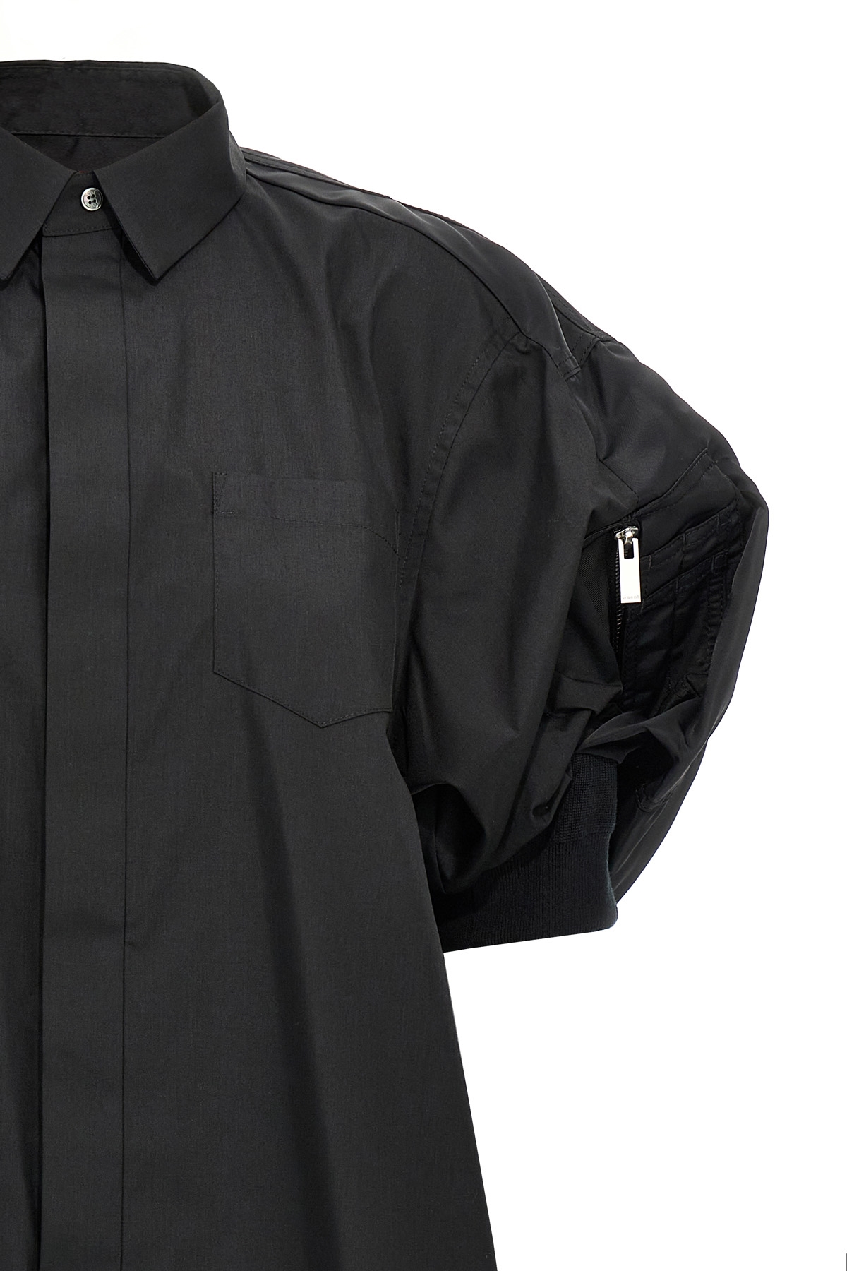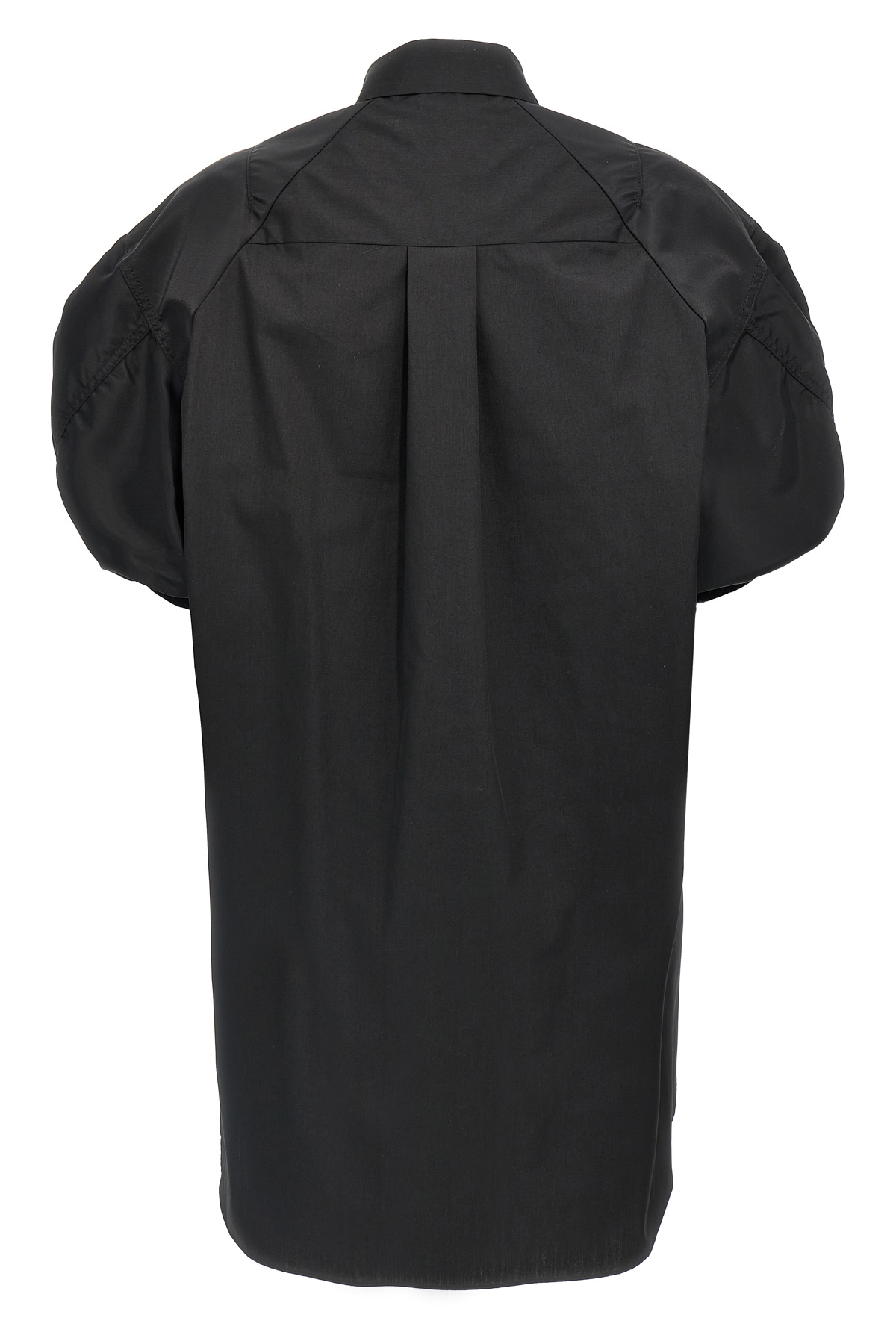Mini dress in cotton poplin with nylon inserts, chemisier model, front button closure, pockets, short sleeves with elastic cuffs.