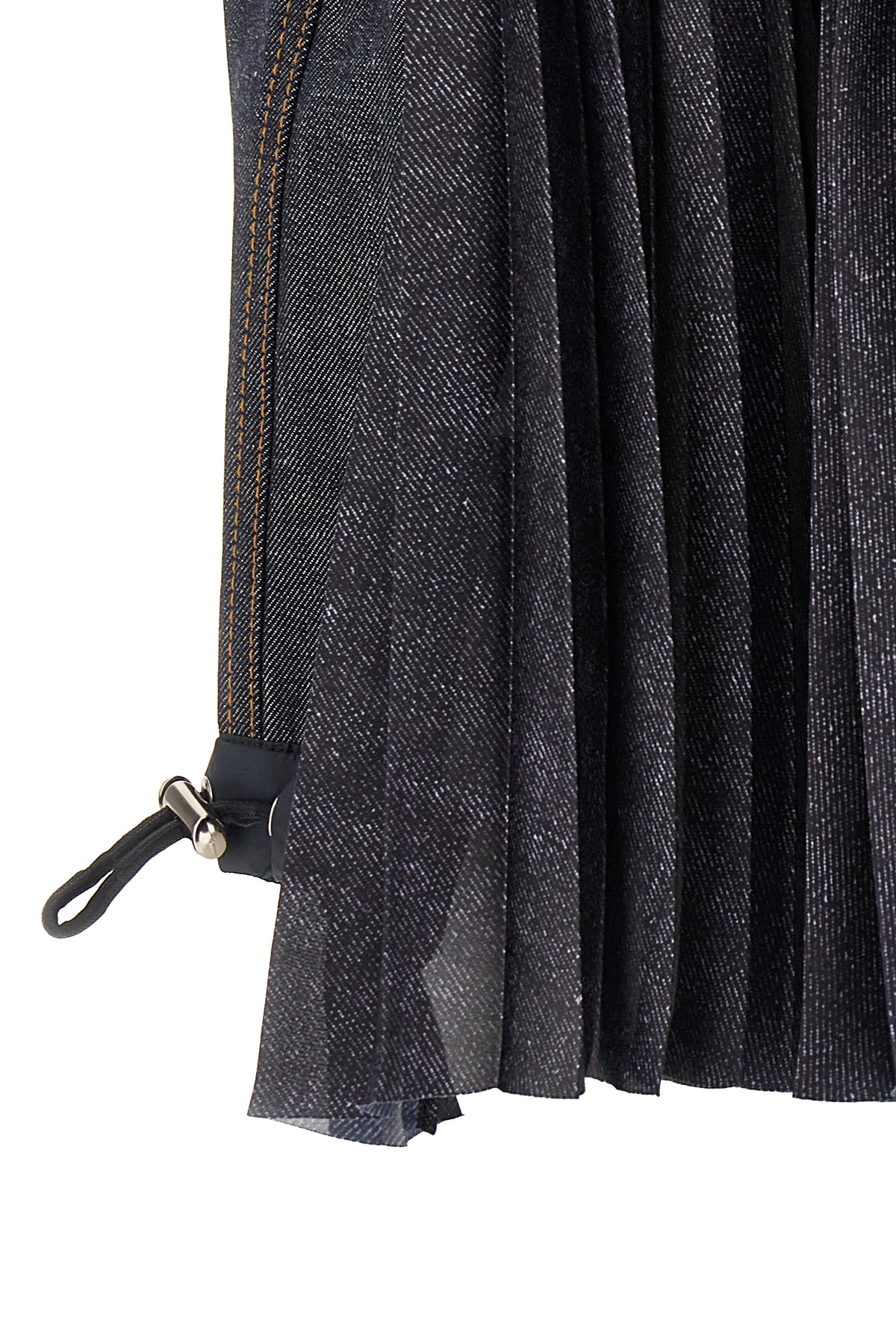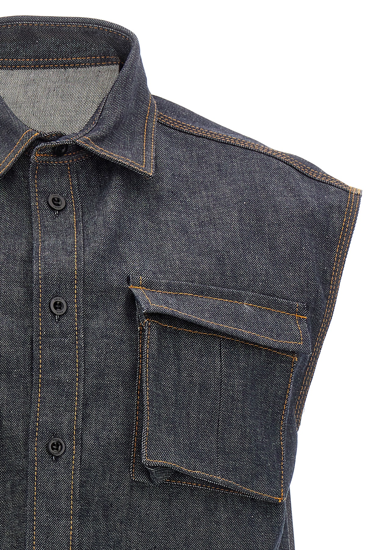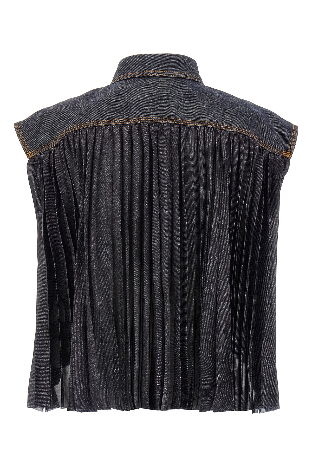 Cotton denim shirt with back insert in pleated denim print, cropped model, front button closure, pockets, sleeveless, drawstring on the hem.