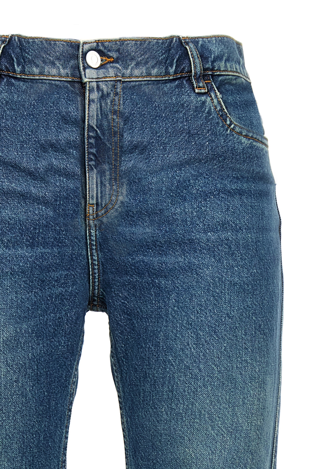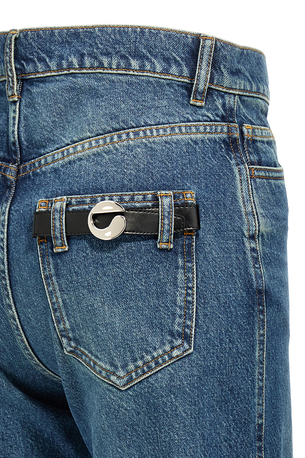 High-waisted cotton denim jeans with straight leg, strap detail with metal logo on the back, zip and button closure, five pockets.