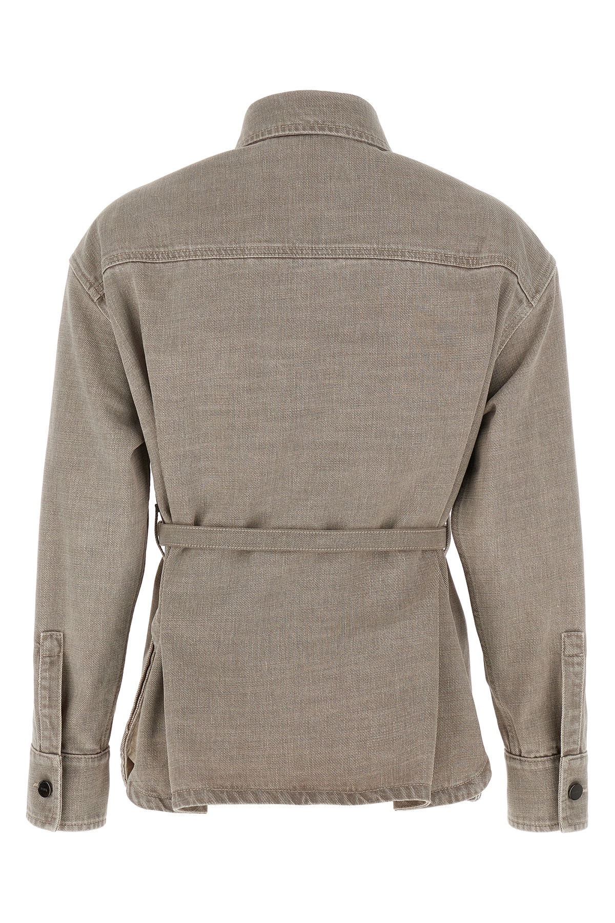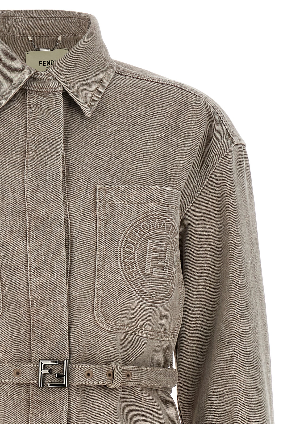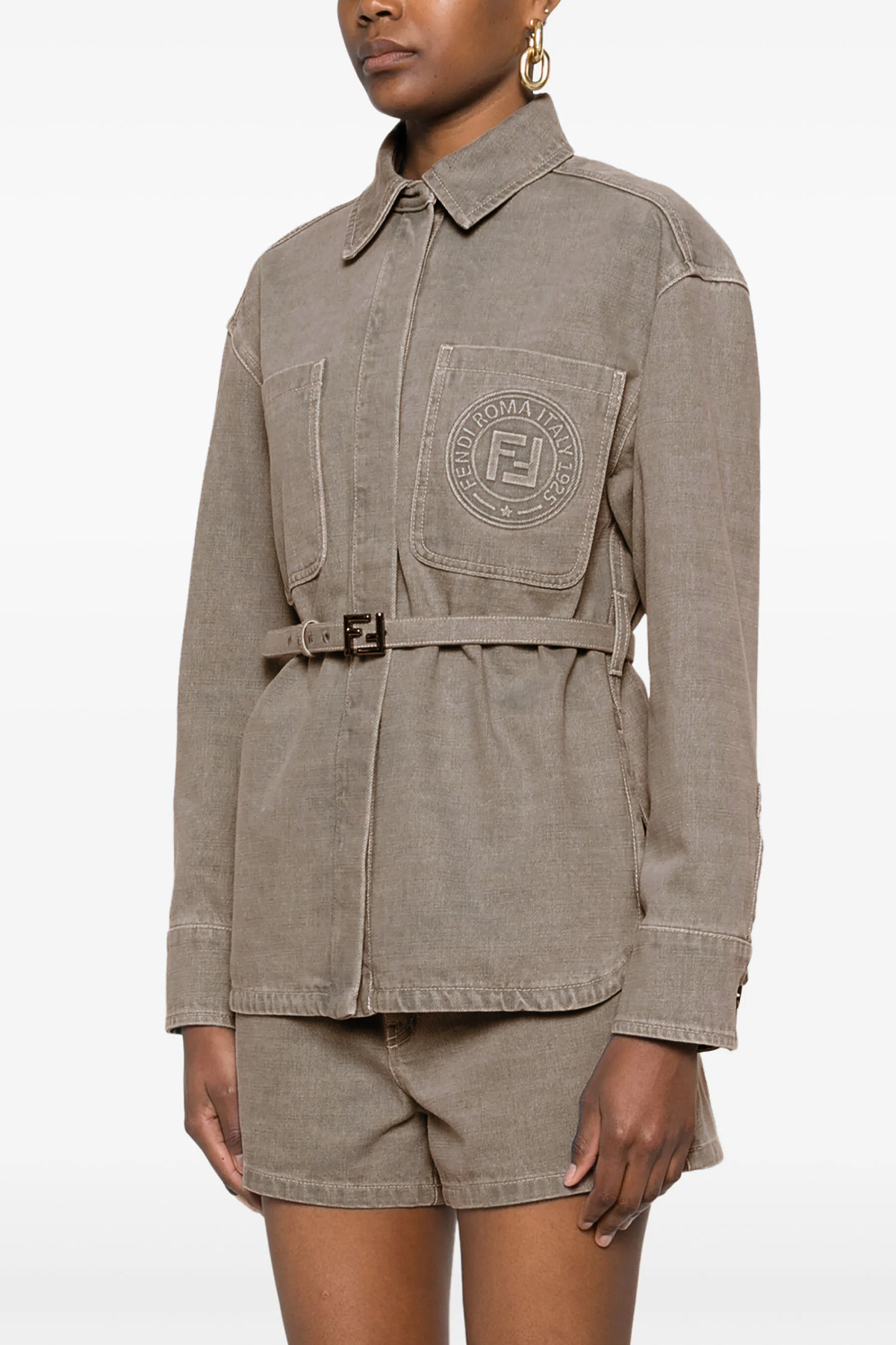 'Go-To' cotton denim jacket with embossed Fendi Stamp 1925 print on the front, snap button closure, pockets, long sleeves with low turn with cuffs, adjustable and removable metal logo buckle belt.