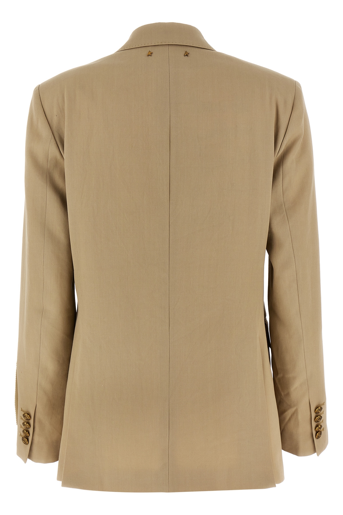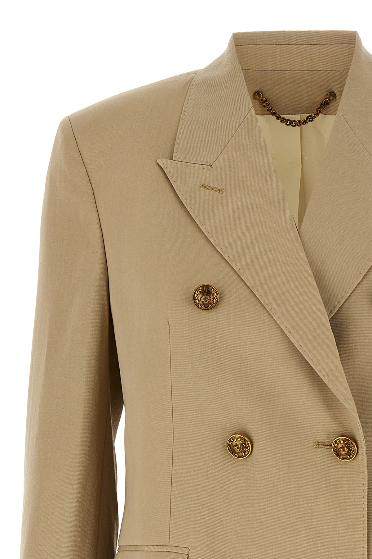 Double-breasted wool blazer with front heraldic button closure, viscose blend lining with written print, peak lapels, pockets, long sleeves with logo patch, side slits, slightly padded shoulders.