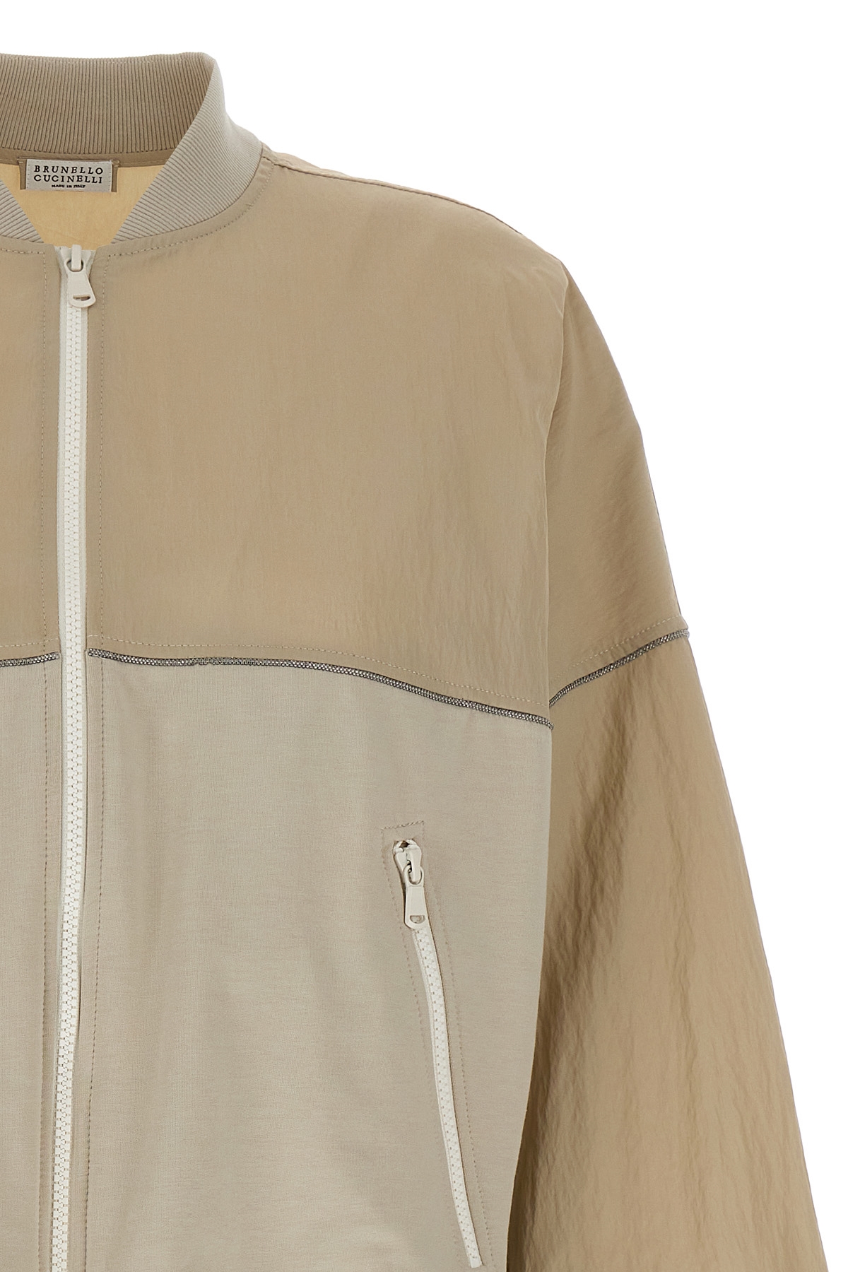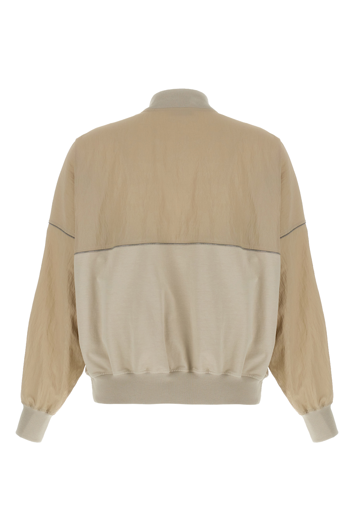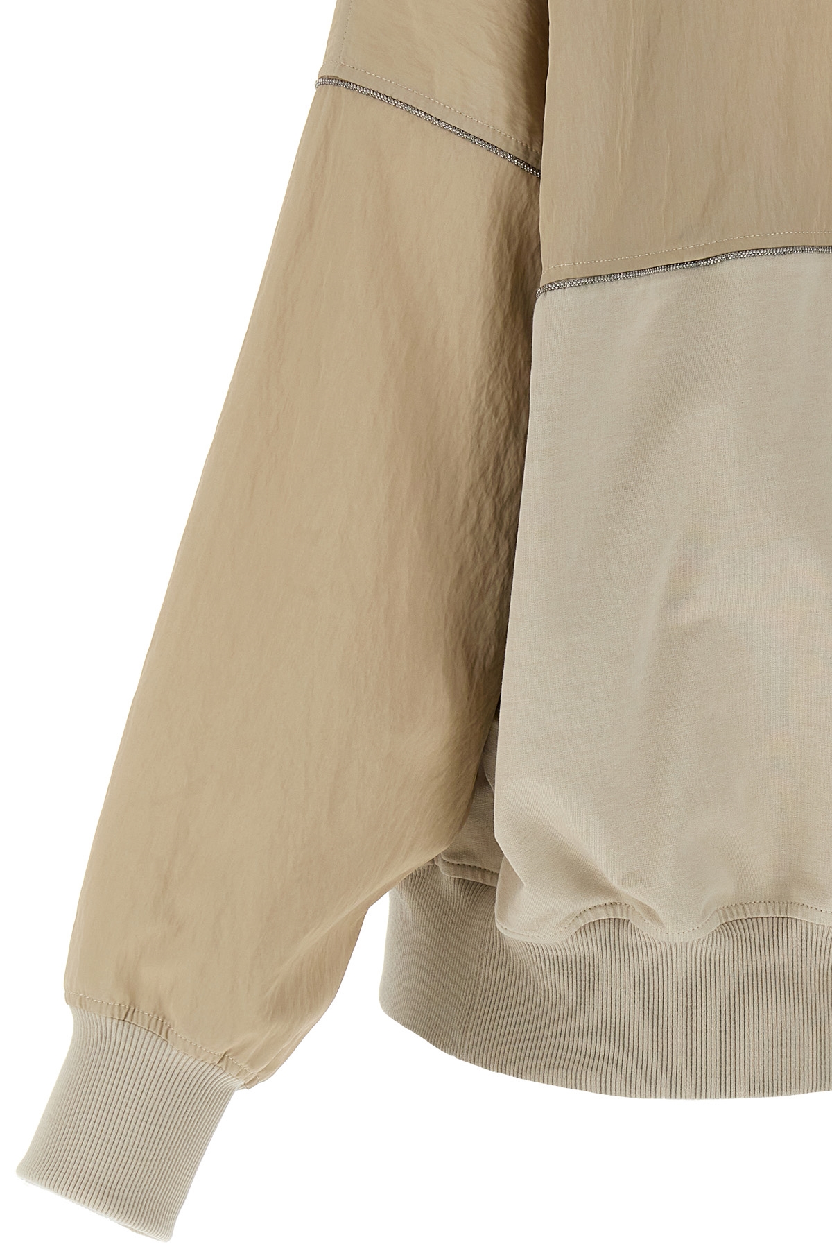 Two-material sweatshirt in stretch cotton technical fabric and jersey with Monile detail, front zip closure, pockets, long cuffed sleeves, and stretch ribbed cotton trims.