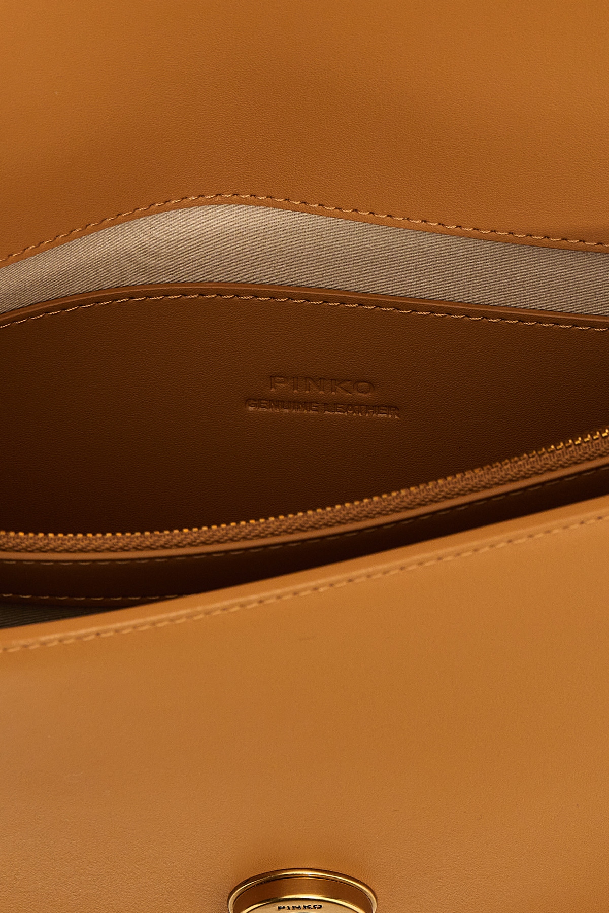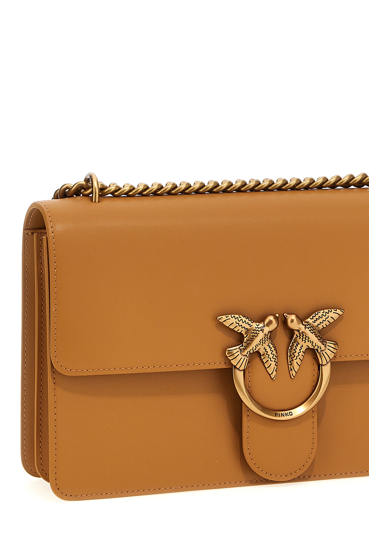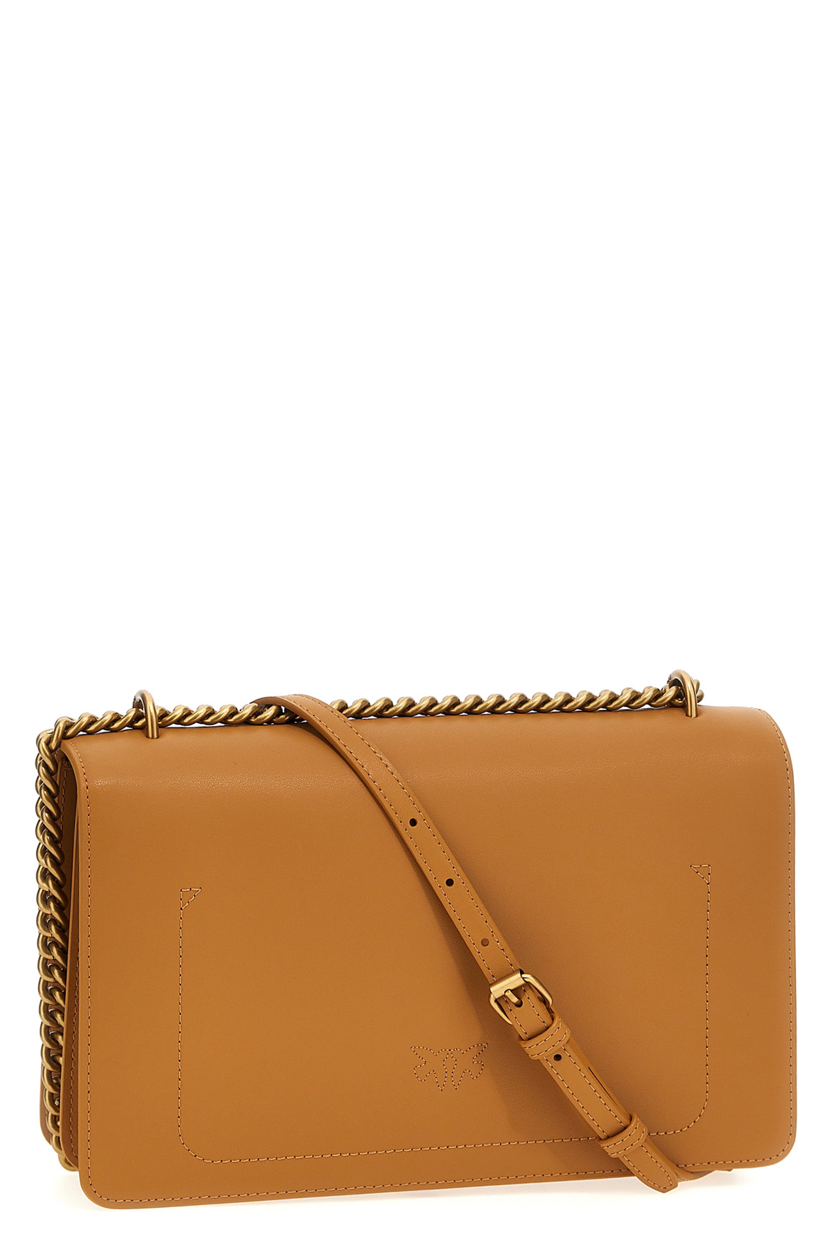 'Love One Classic Simply' leather crossbody bag, magnetic flap closure with front metal logo applique, adjustable leather and chain shoulder strap.