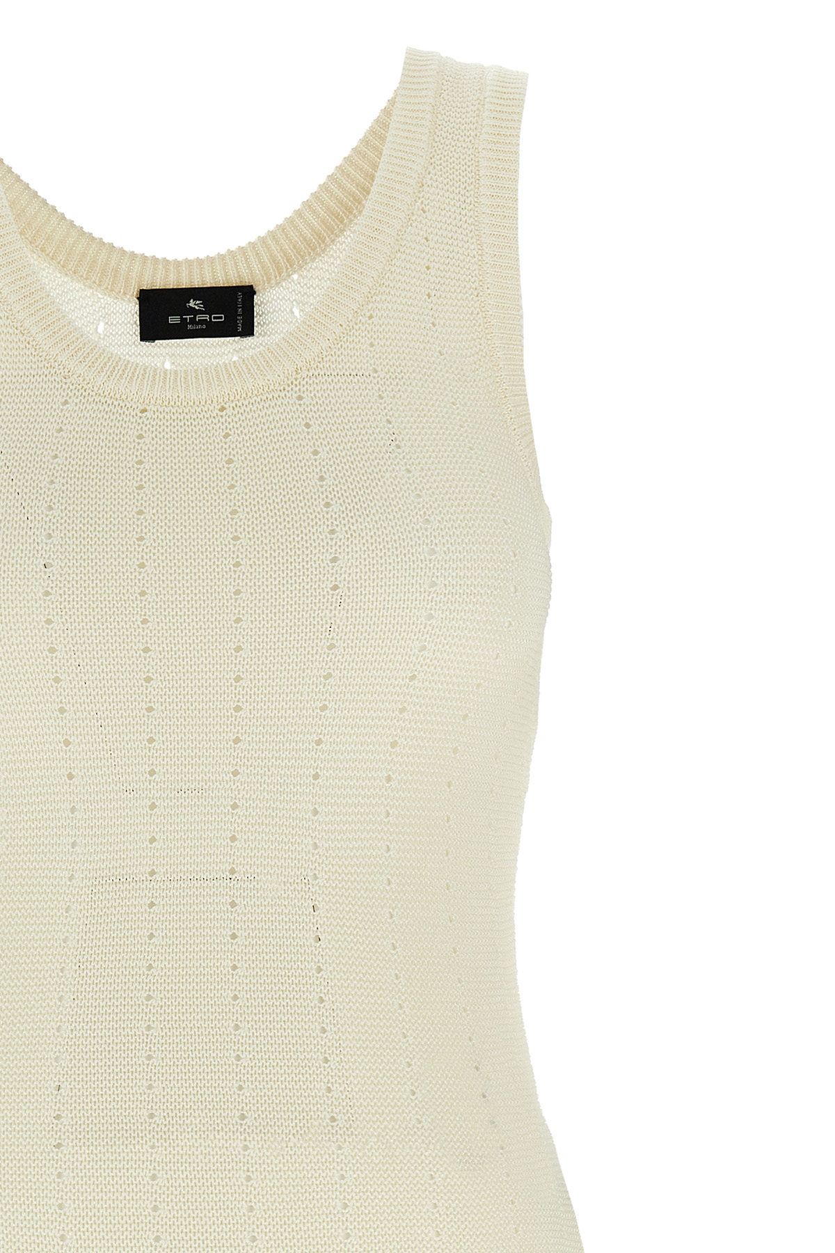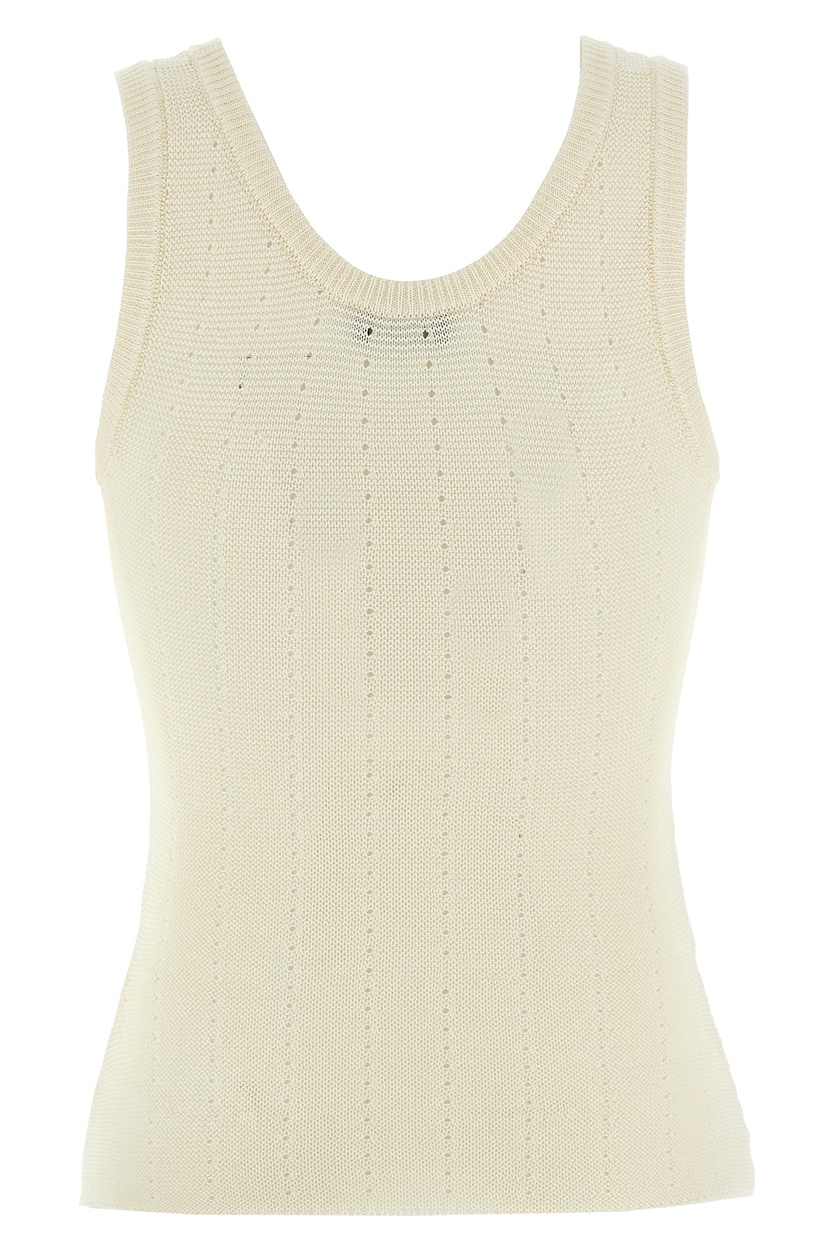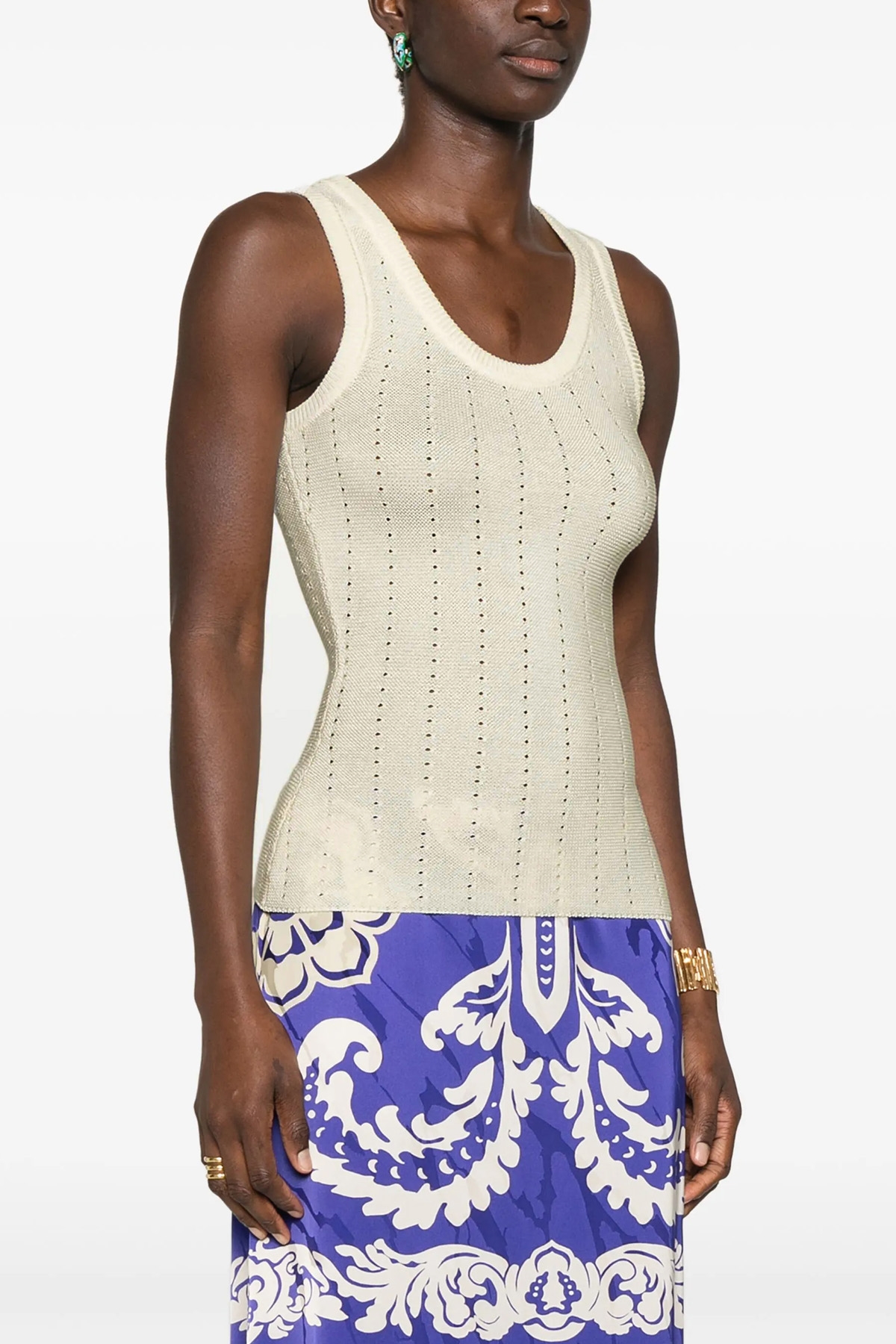 Silk blend knit top with vertical punched pattern, wide round neckline.