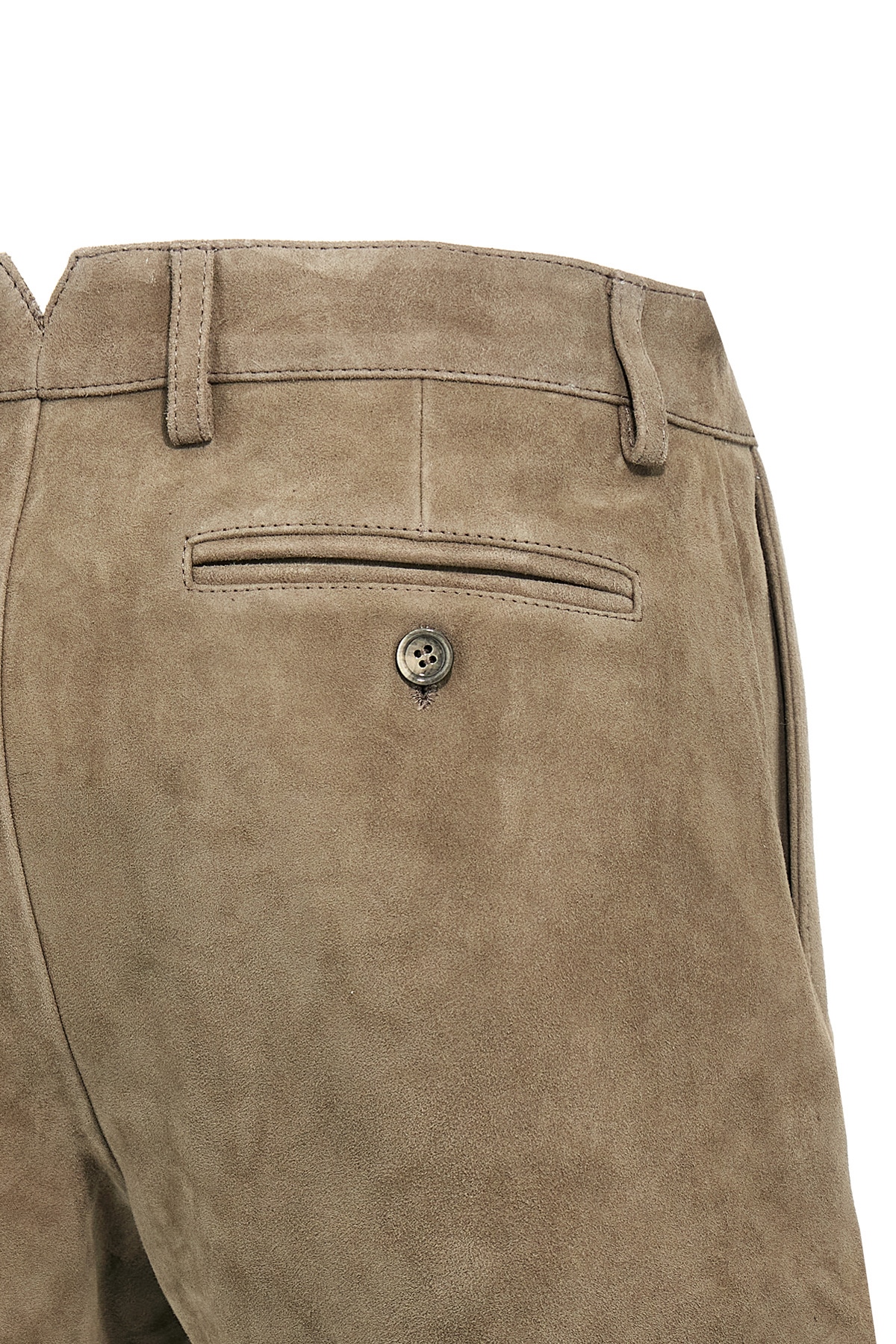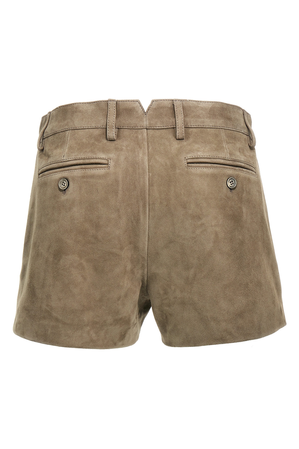 Suede shorts, zip, hook and front button closure, pockets, side slits.