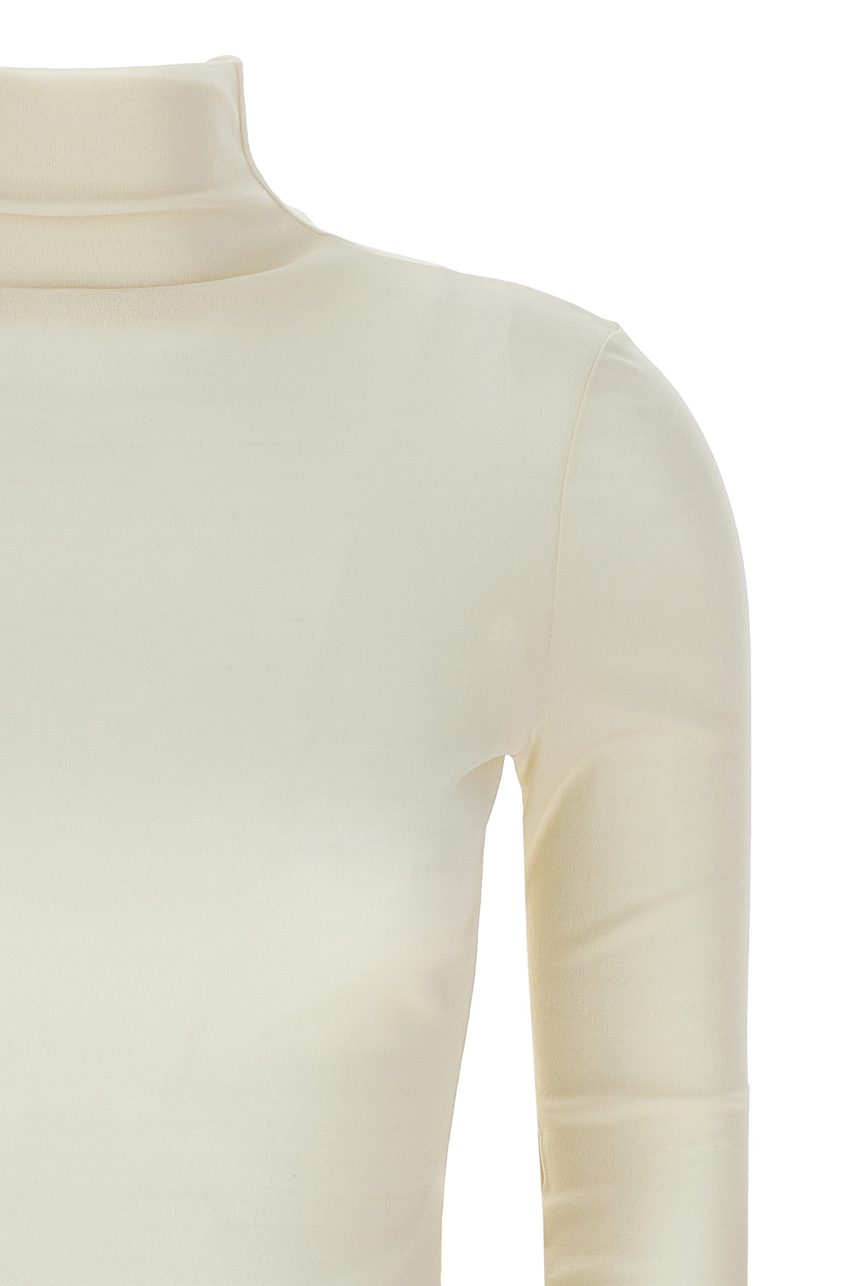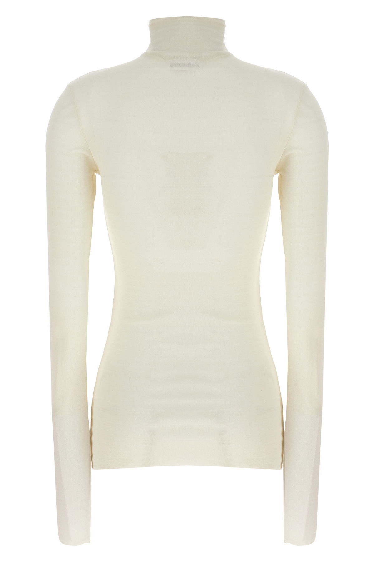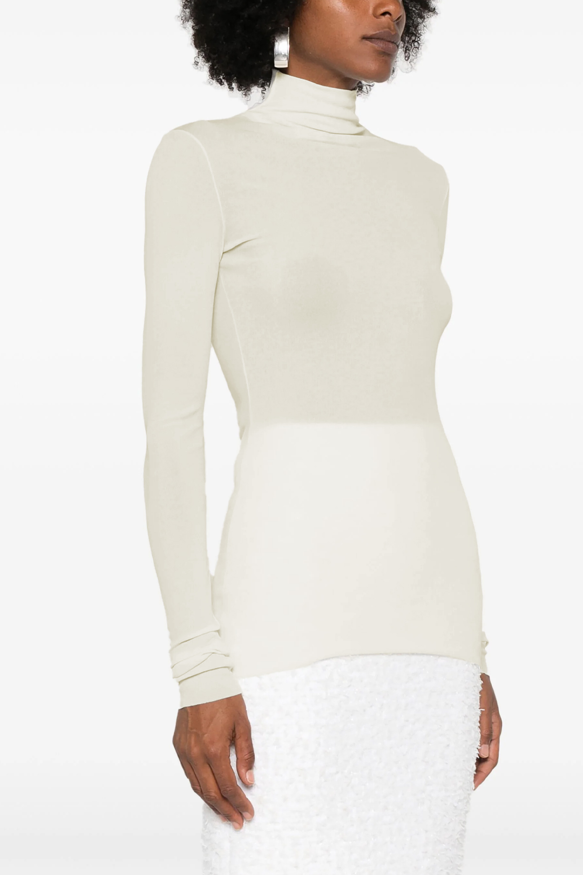 Silk turtleneck top, high neck, long sleeves, laser-cut hem.