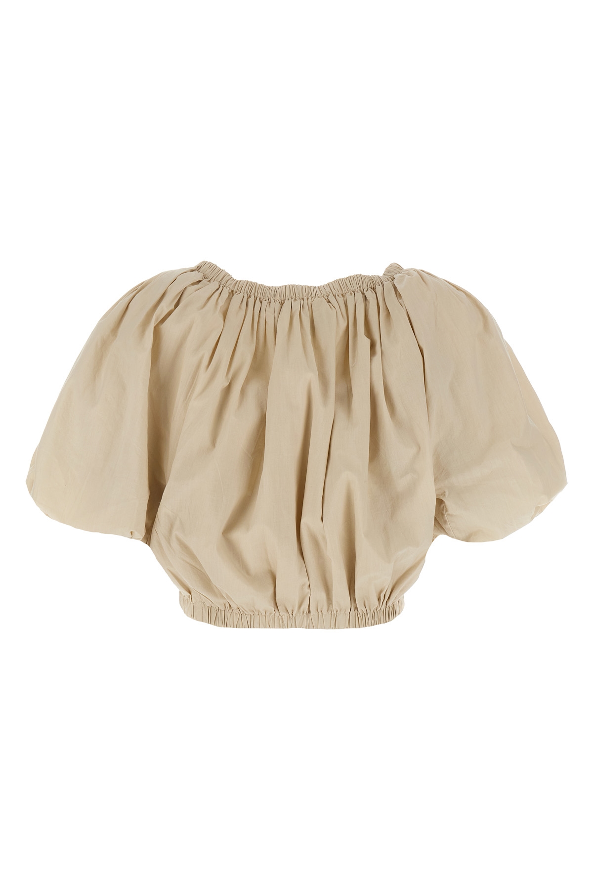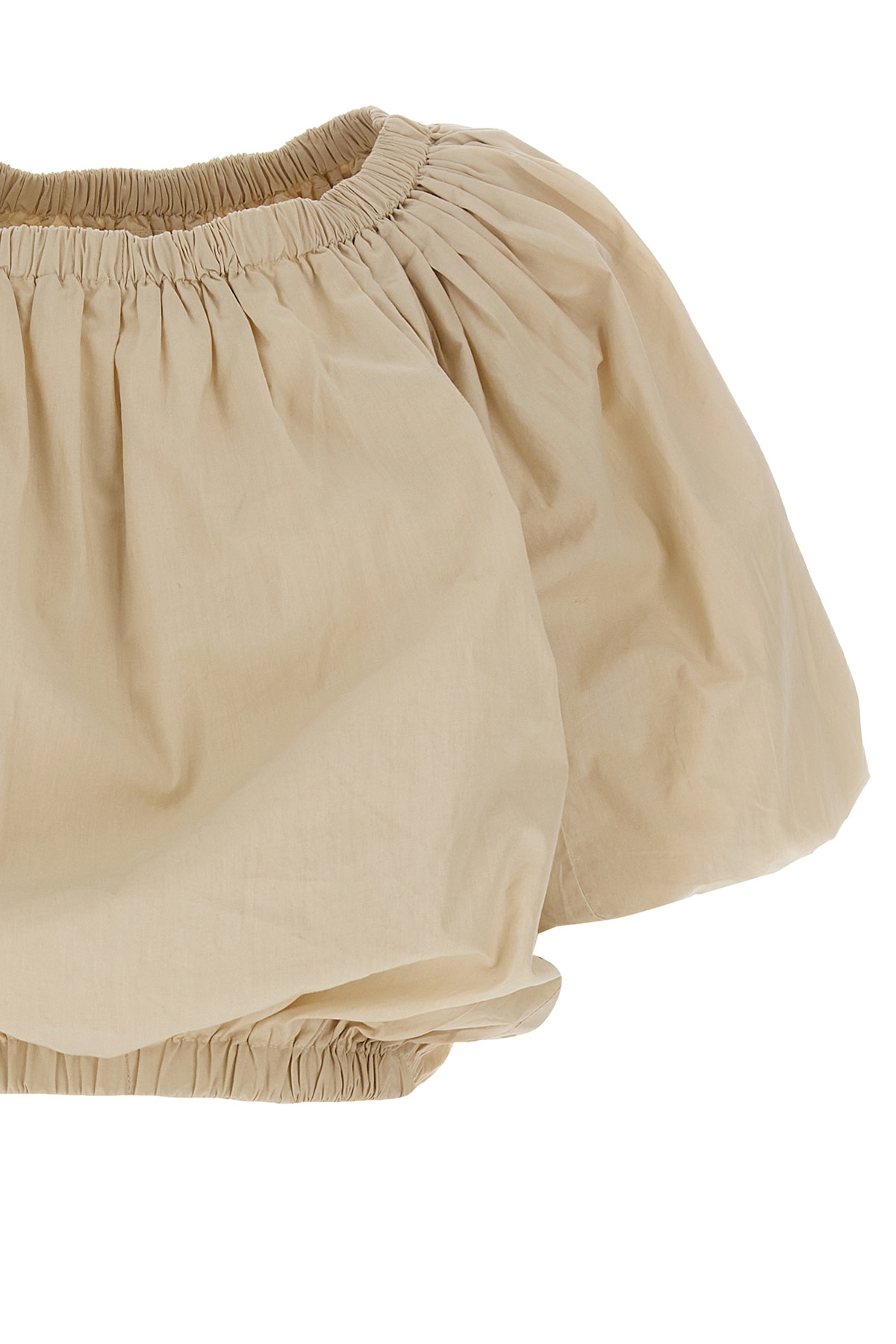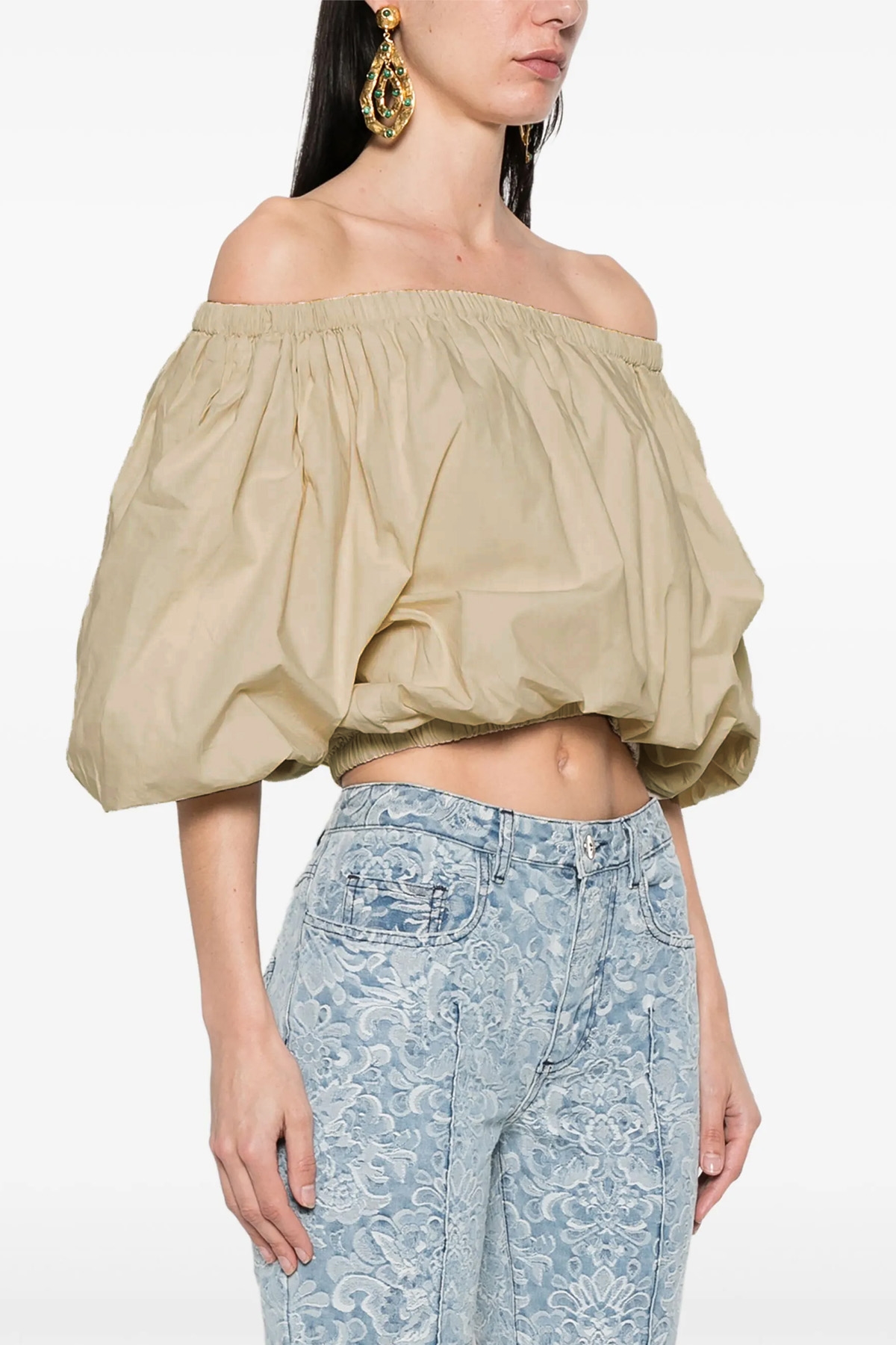 'Bertille' crisp cotton top, off the shoulder model curled like a balloon with wide short sleeves and elastic on the hem.
