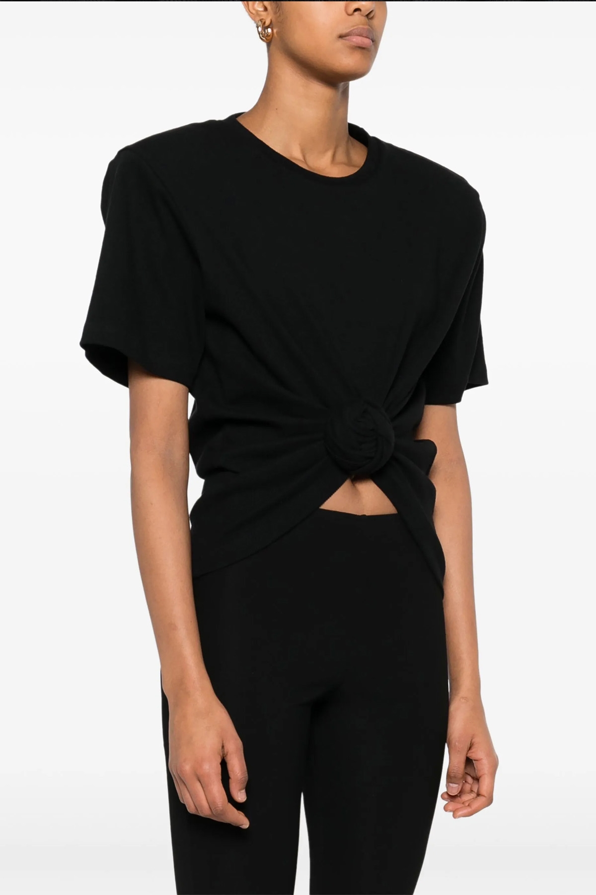 '01' stretch ribbed cotton t-shirt with front knot detail, crew neck, removable padded shoulders, short sleeves.