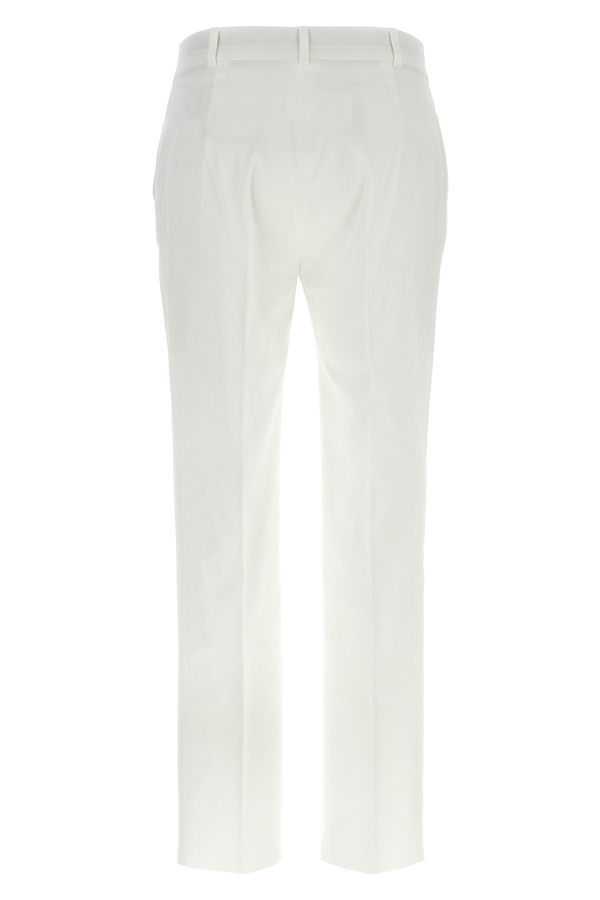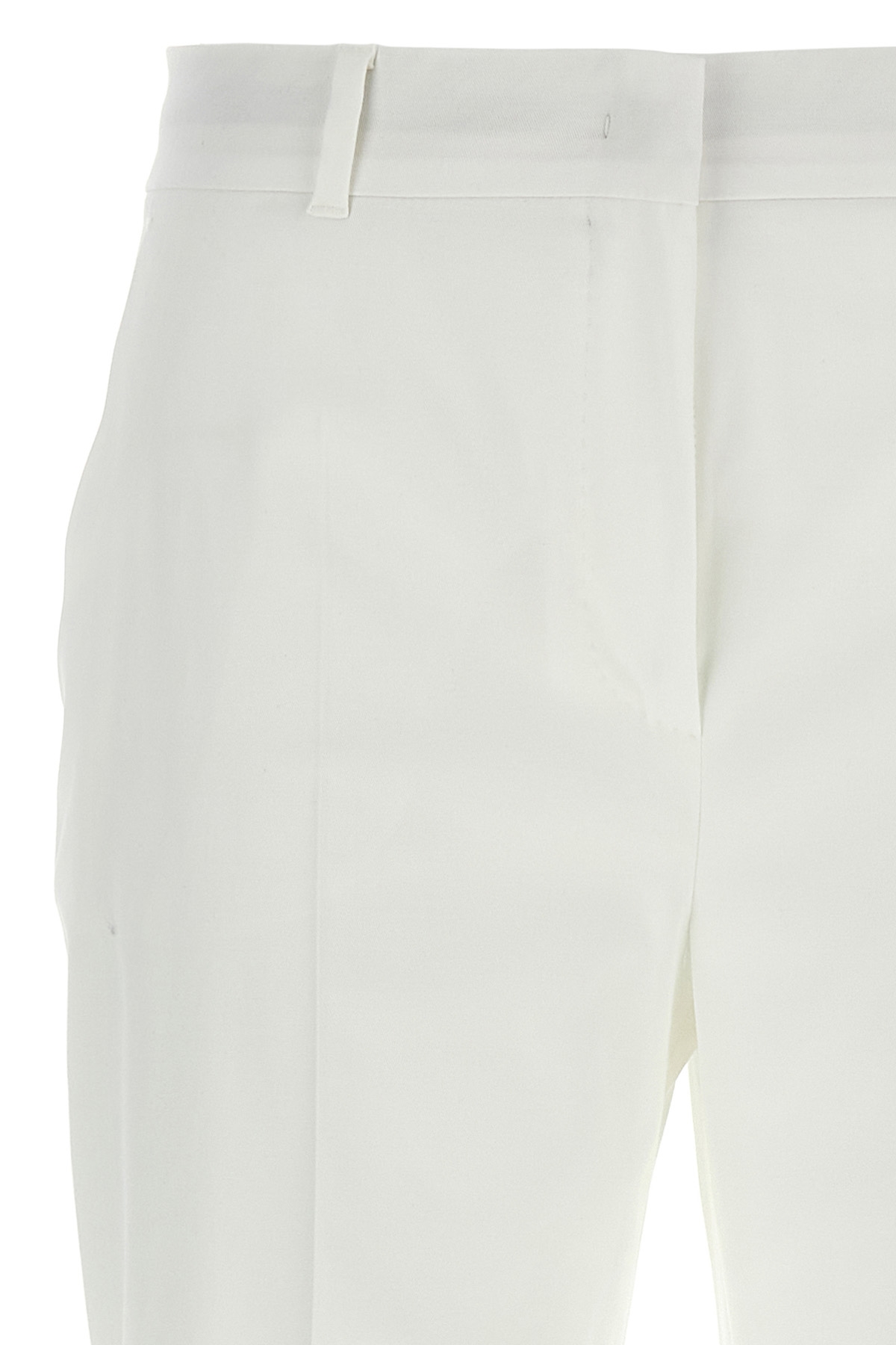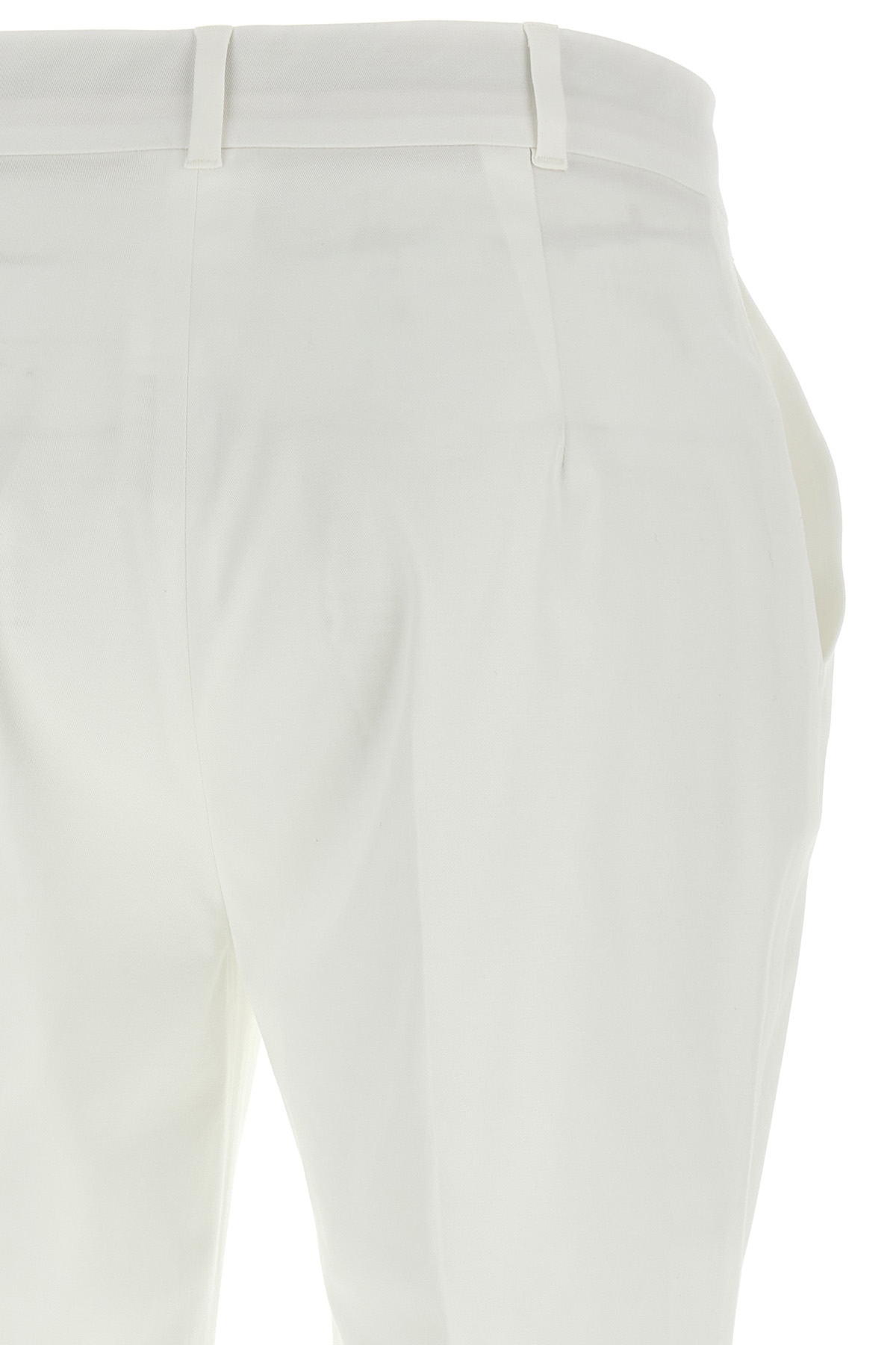 'David' stretch cotton gabardine trousers, cigarette style, expanded pleat, pockets, zip hook and front button closure.