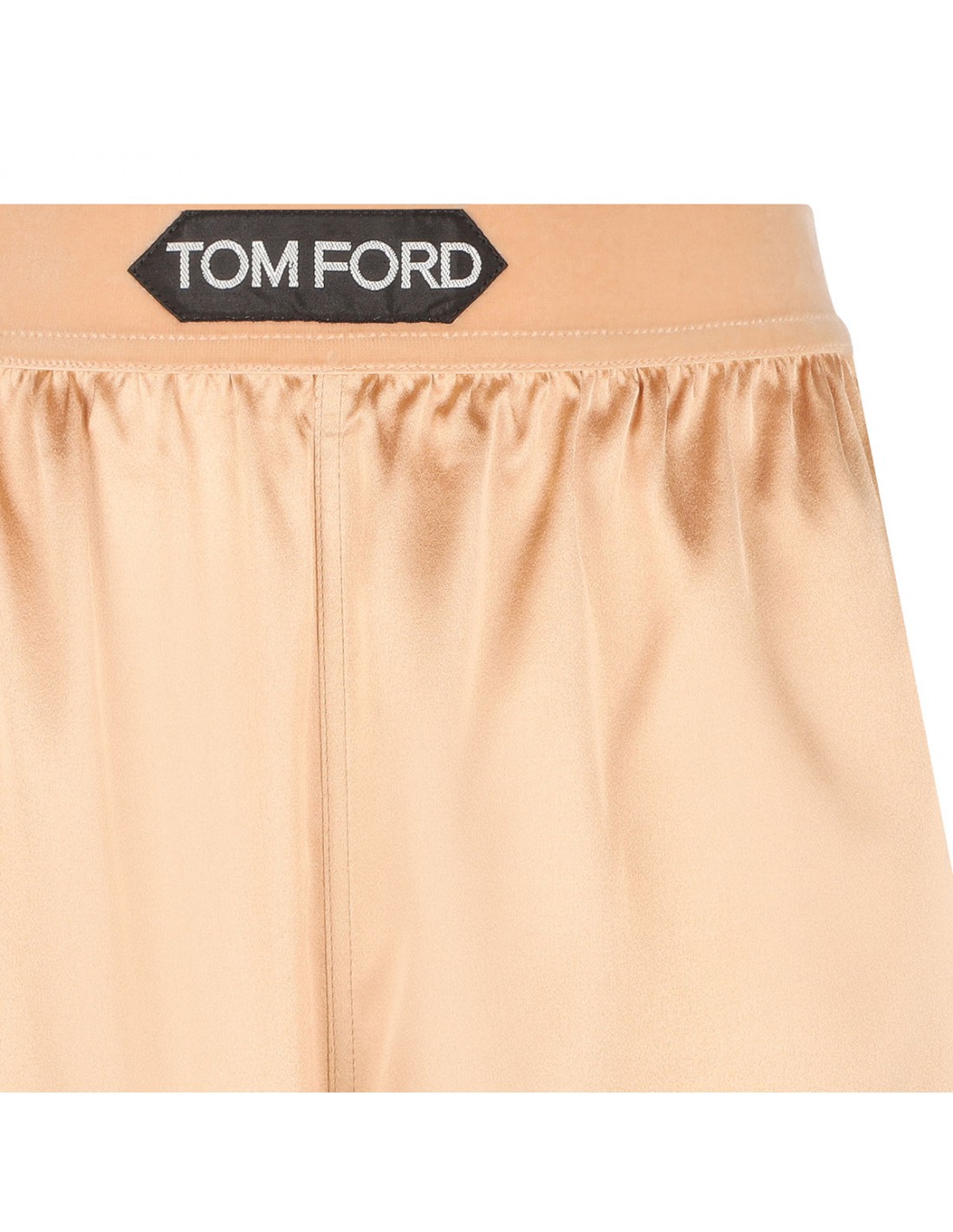 Pale beige stretch silk satin boxer shorts from Tom Ford featuring velvet elastic waistband with contrasting white logo patch.?