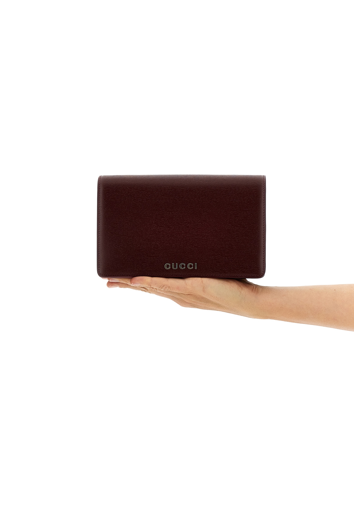 Gucci Rosso Ancora leather wallet on chain, front metal logo, flap closure with snap button, removable chain shoulder strap.