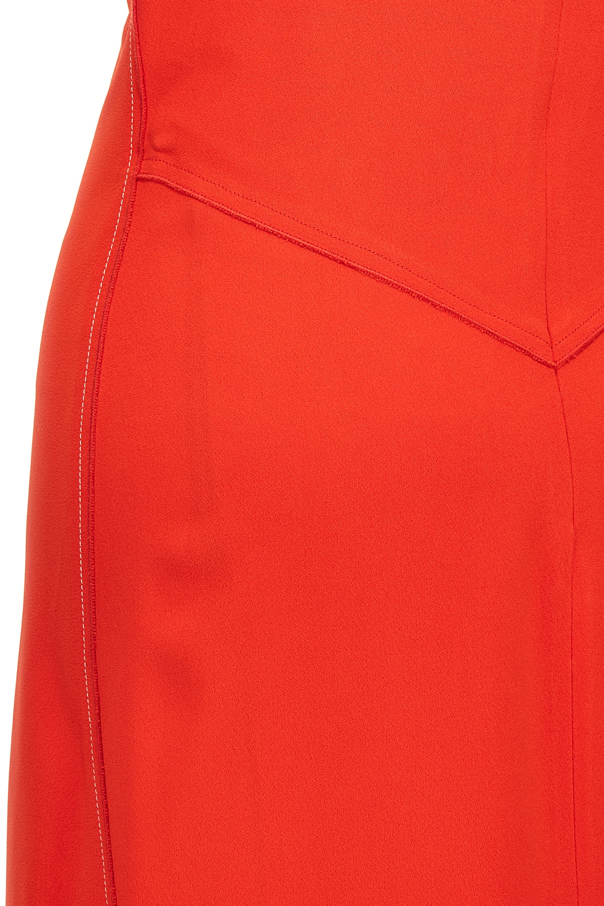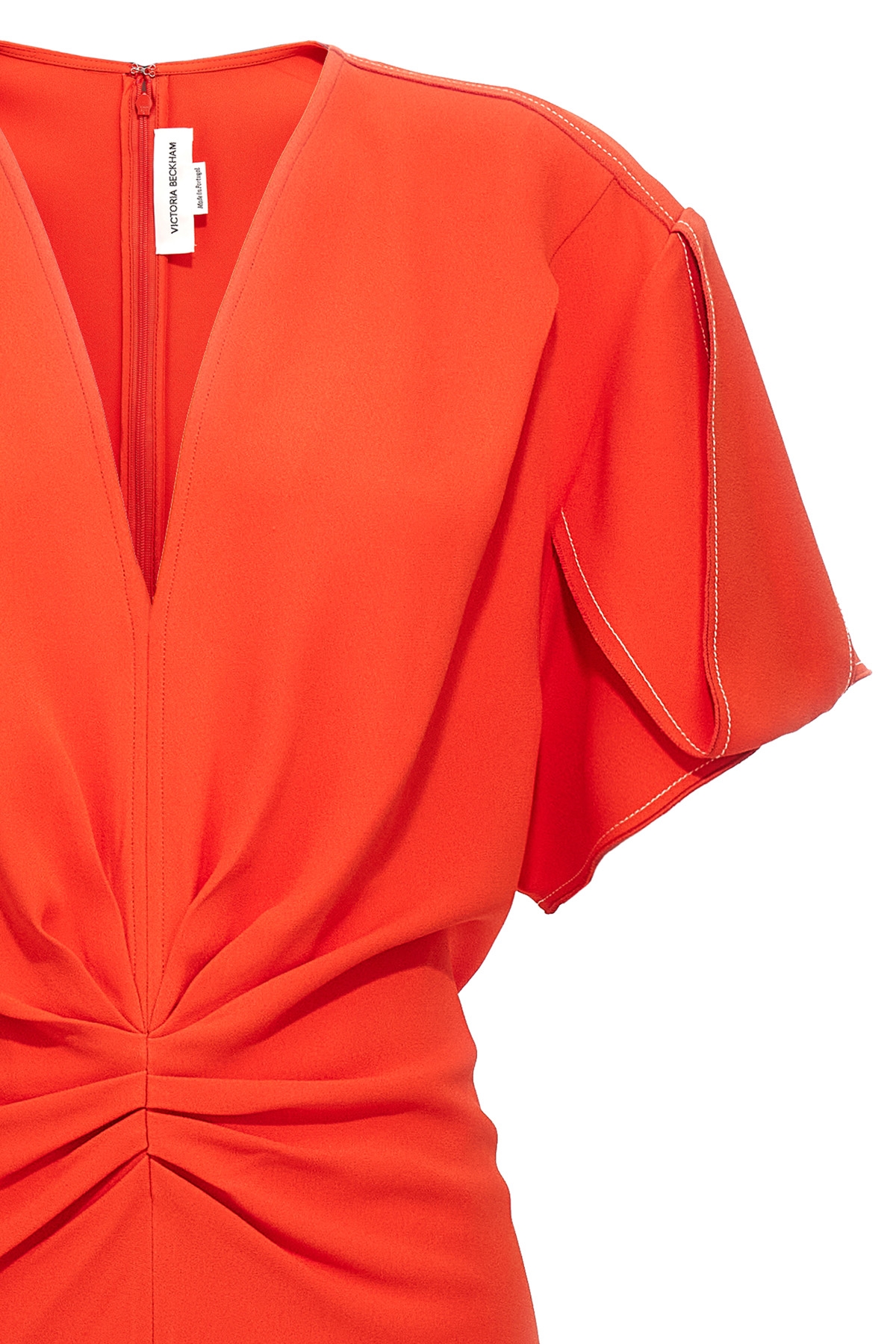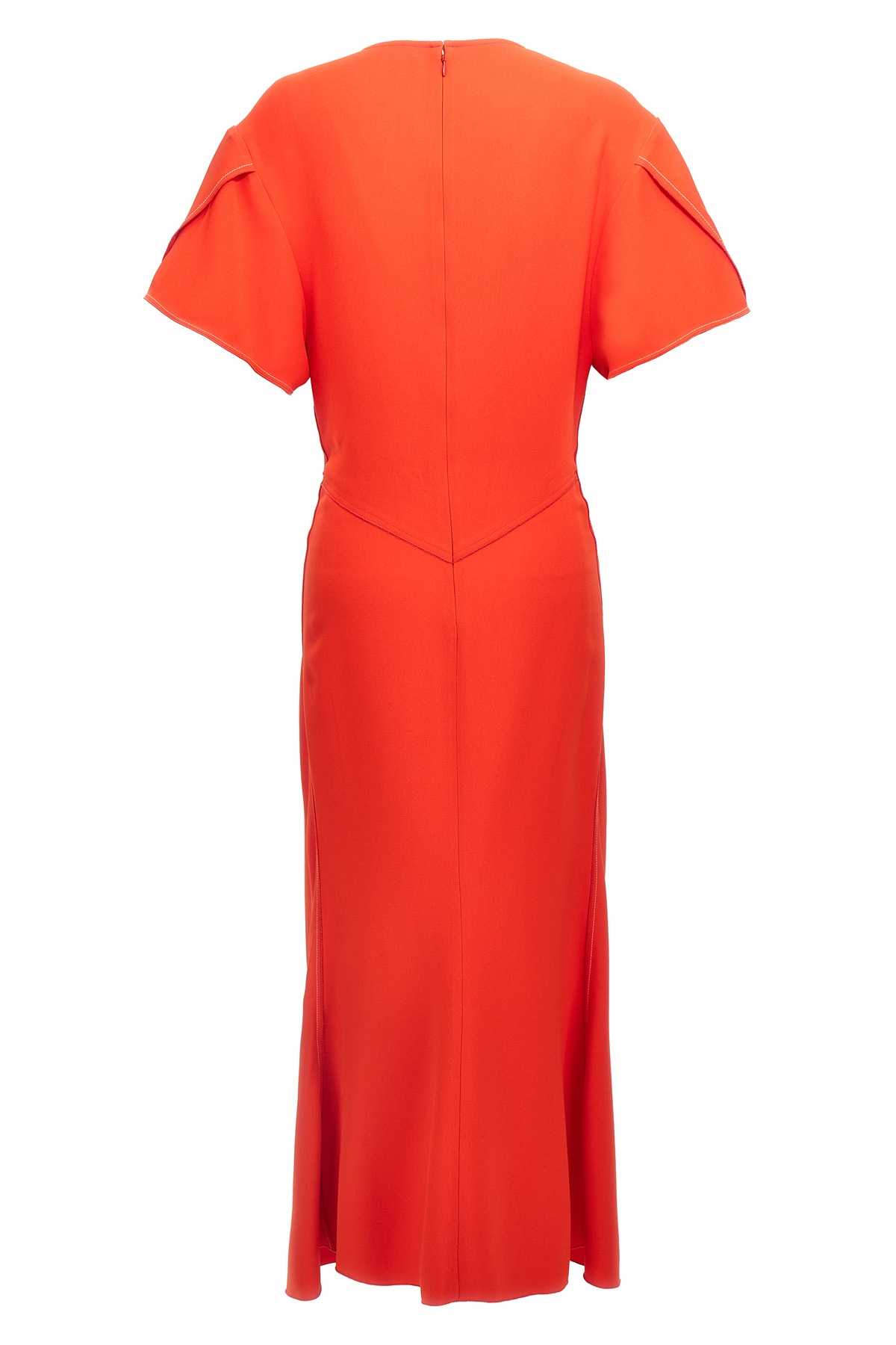 'Gathered Waist Midi' dress in fluid cady fabric tight at the waist with draping detail, V-neck, short sleeves with drape, contrast stitching, back zip closure.