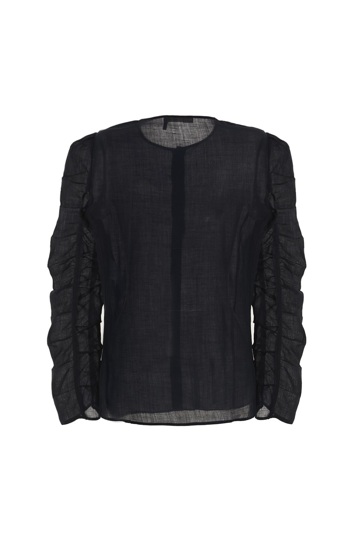 Ramie blouse with long gathered sleeves, a crew neck, and button closure.losure.