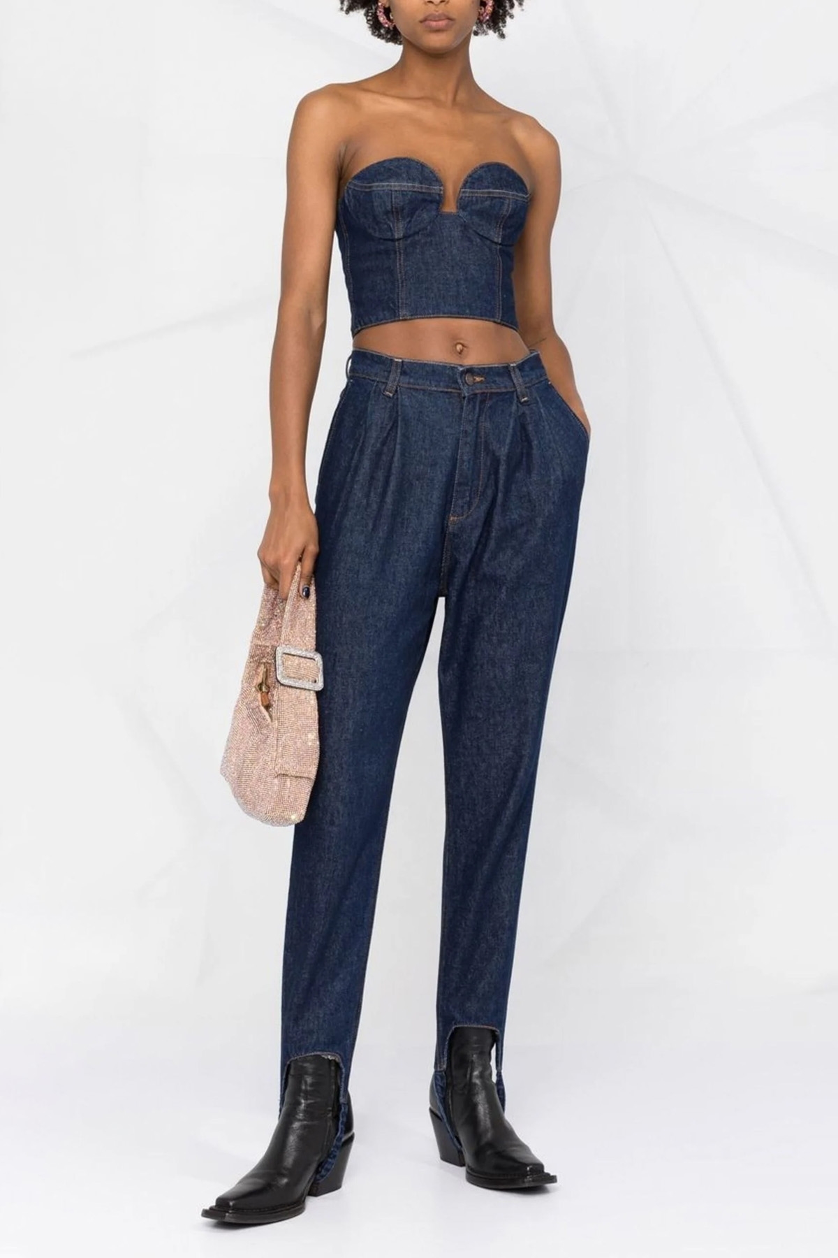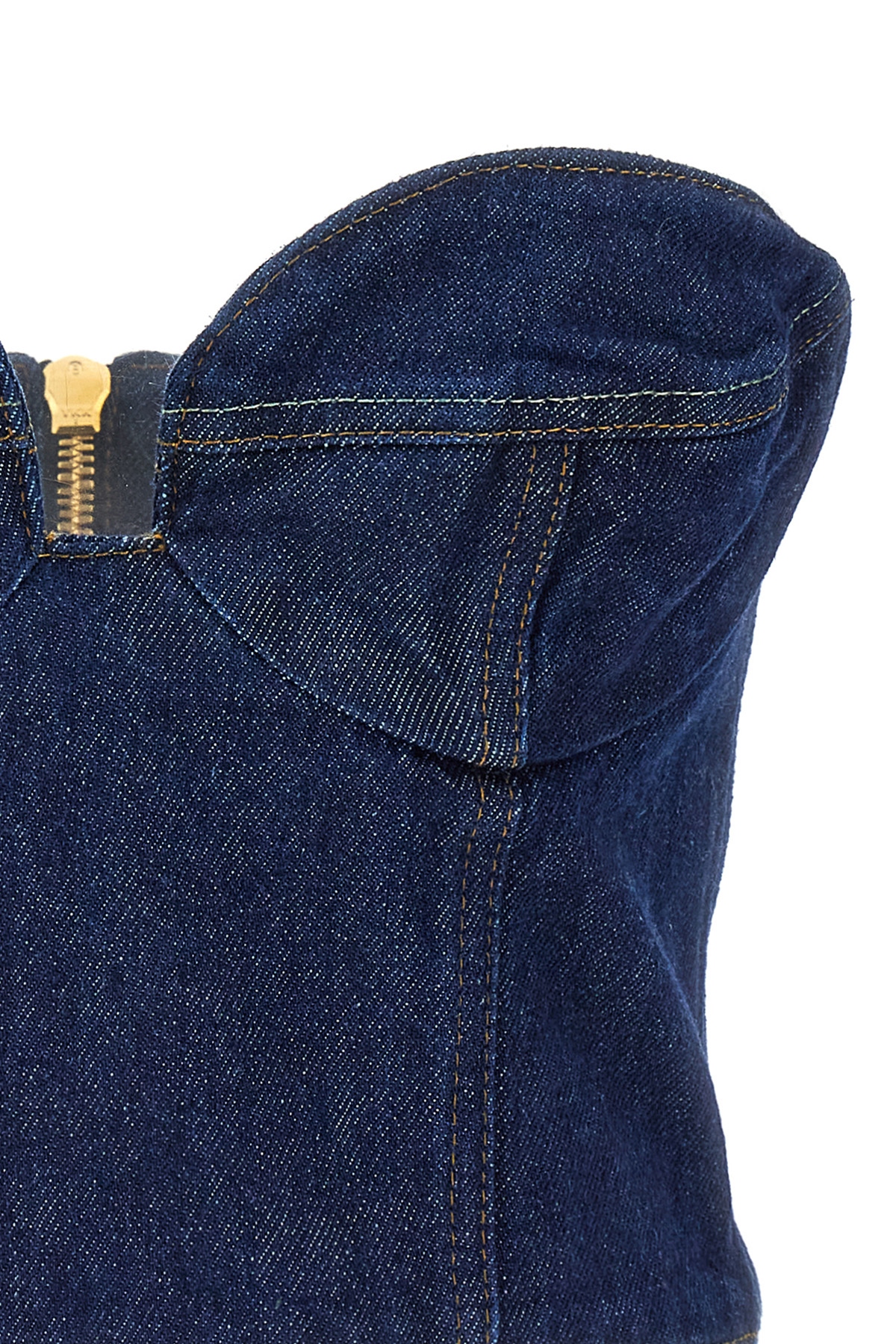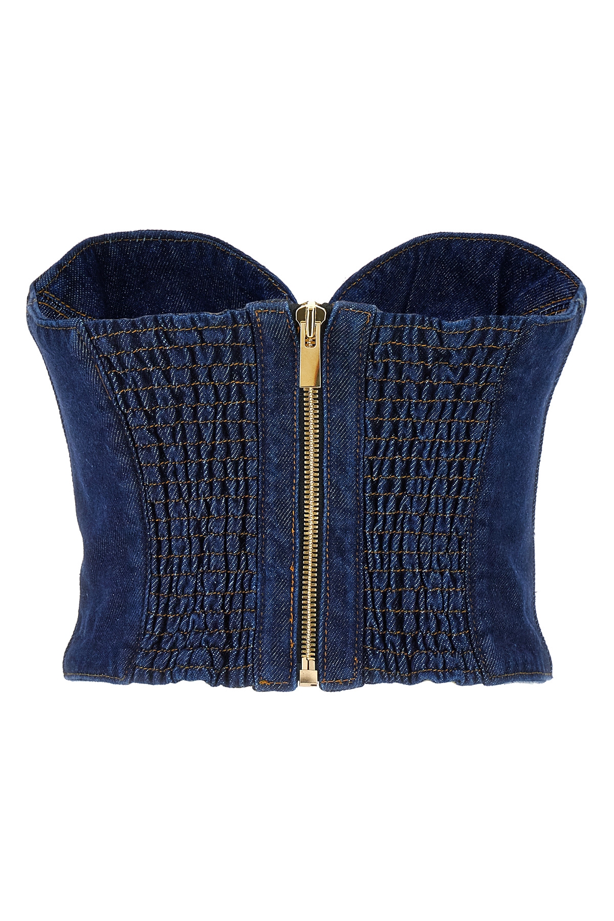 '04' cotton denim top, off-the-shoulder cropped style with sweetheart neckline, zip closure and smock stitching at the back.