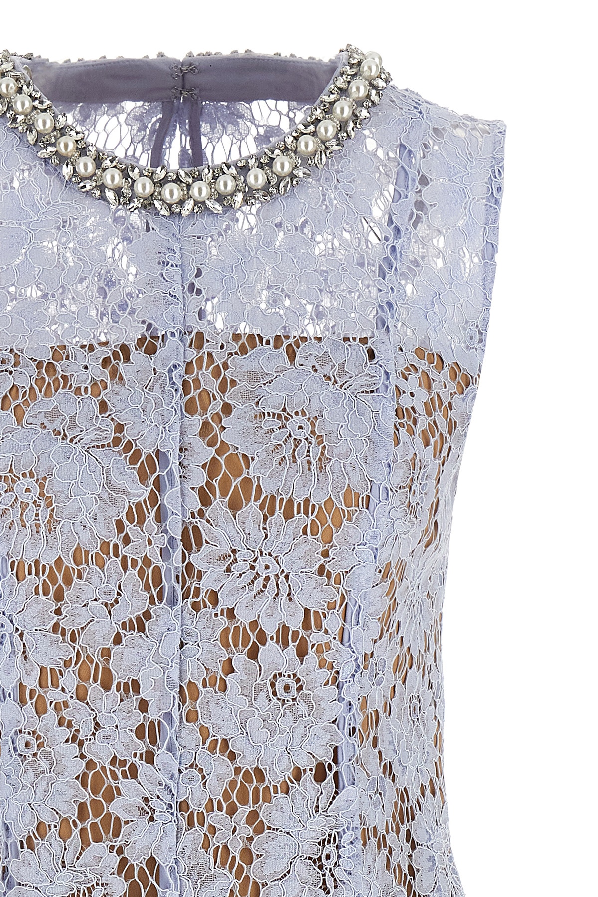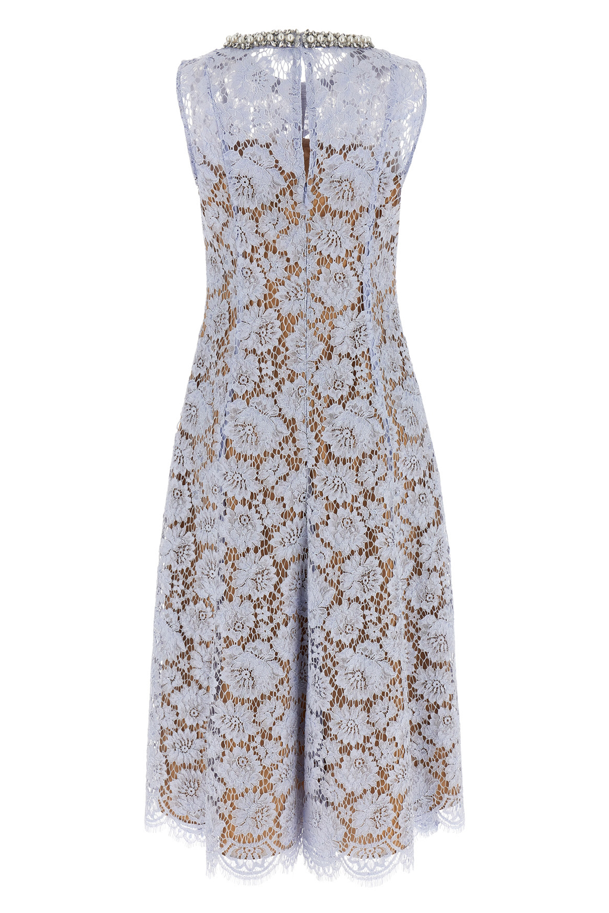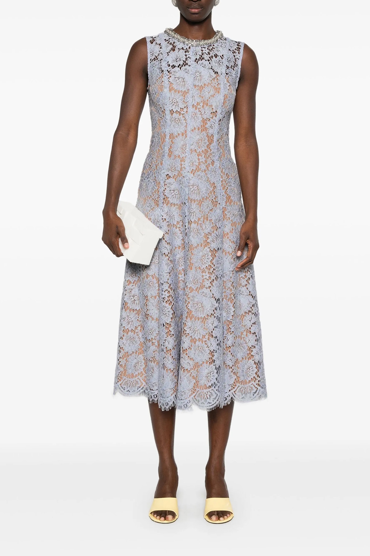 'Blue Fine Lace Pearl Midi' lace dress, crew neck with pearl and crystal decoration, flared skirt, lining, sleeveless, zip and back hook closure with cut-out teardrop detail.