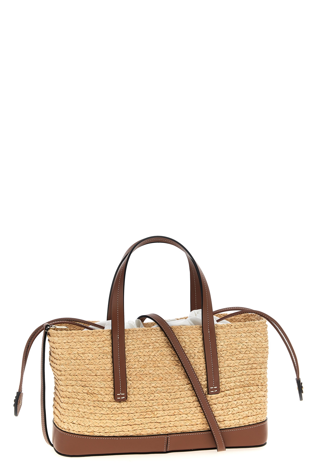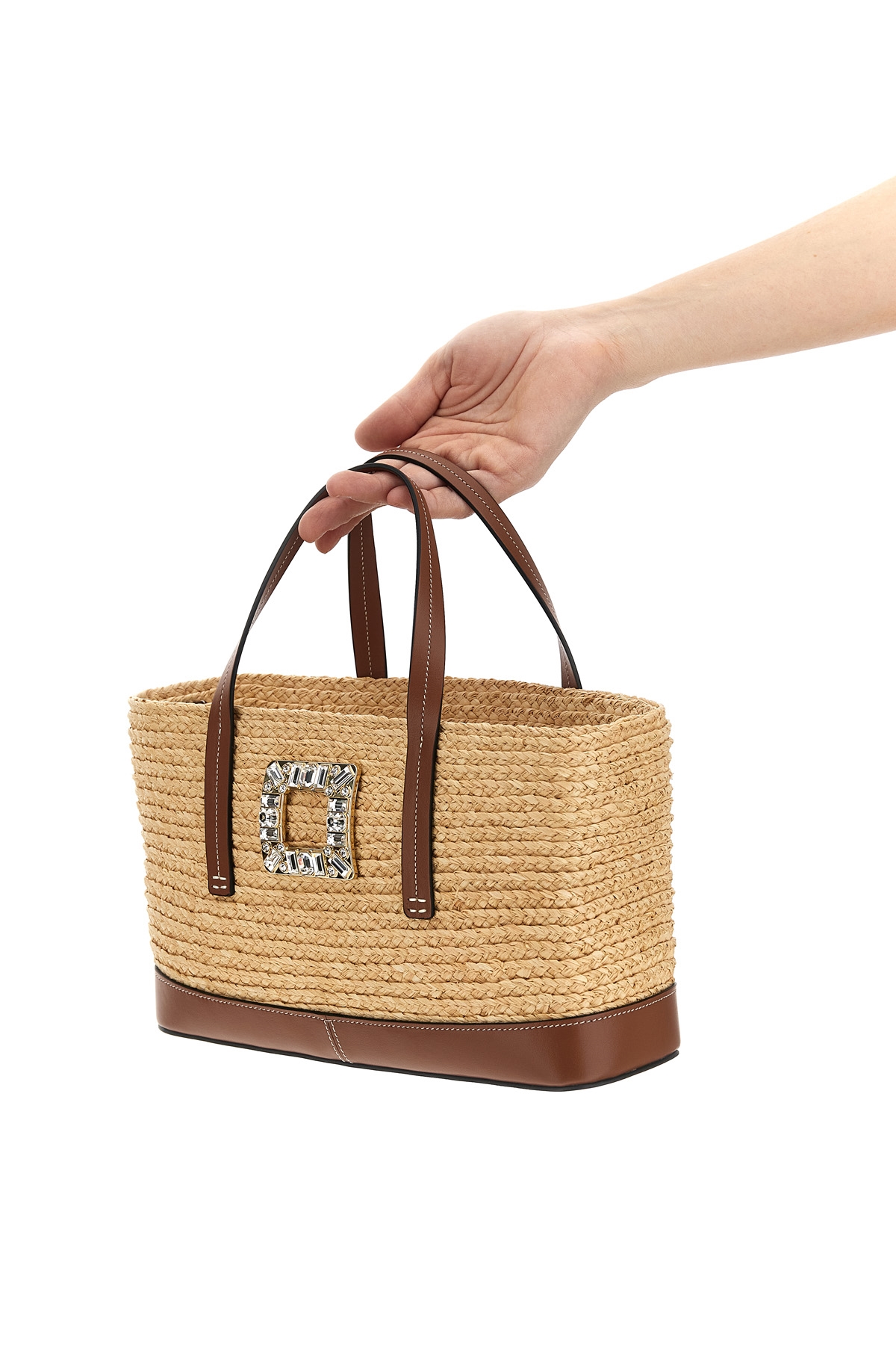Small 'Viv' Skate shopper in woven raffia with smooth leather details, front jewel buckle detail, double fixed handle, inner fabric insert with drawstring closure, adjustable and removable leather shoulder strap.