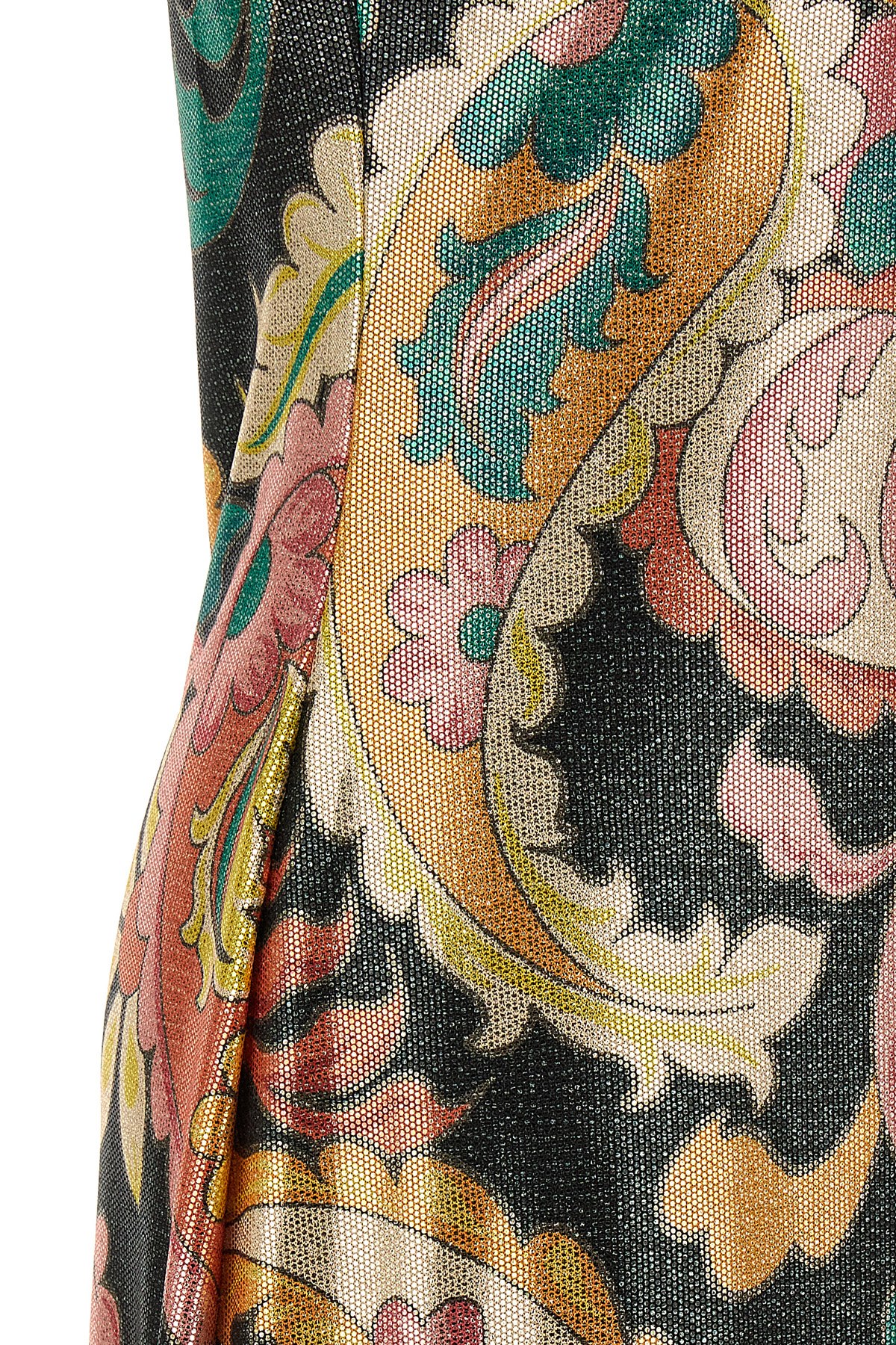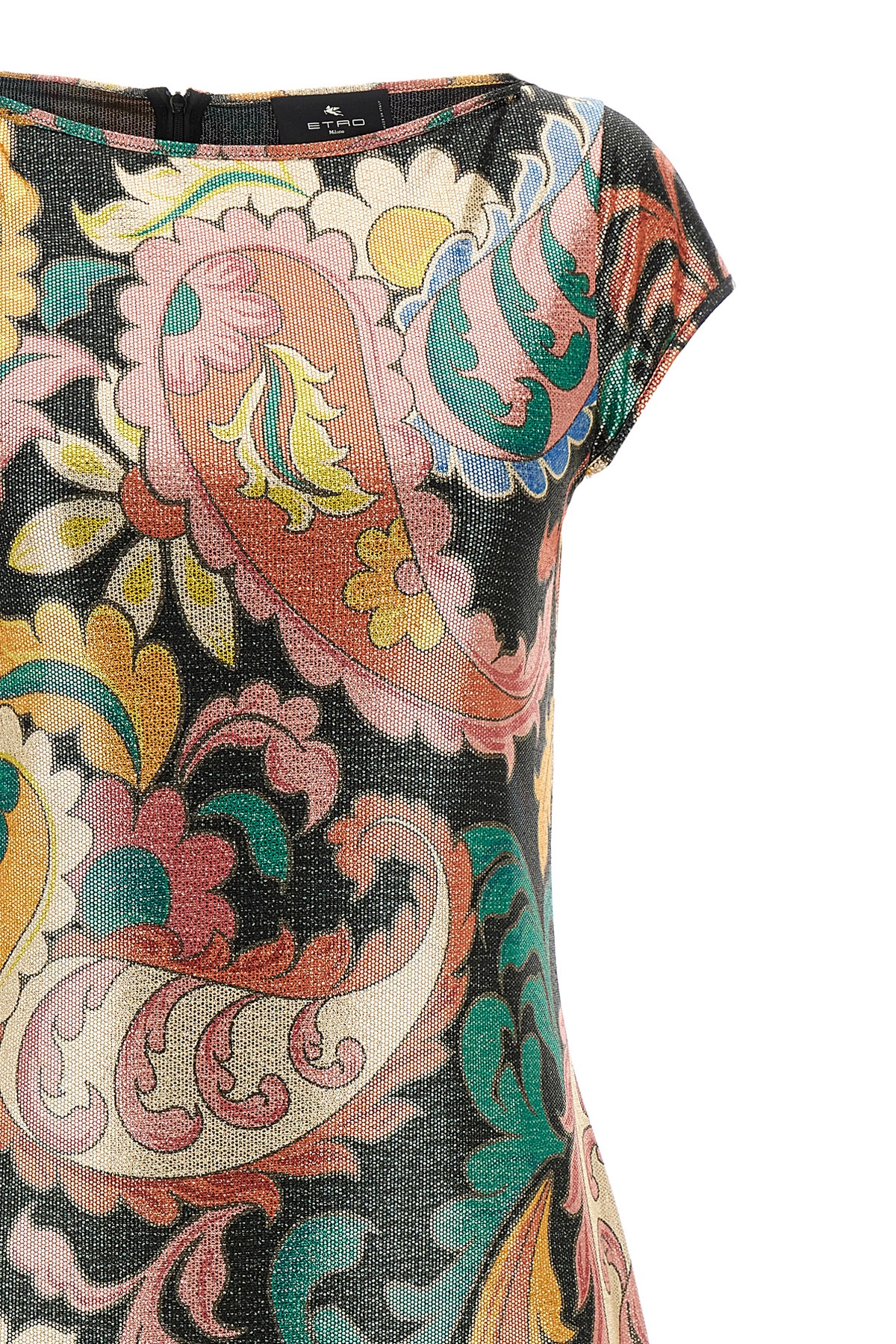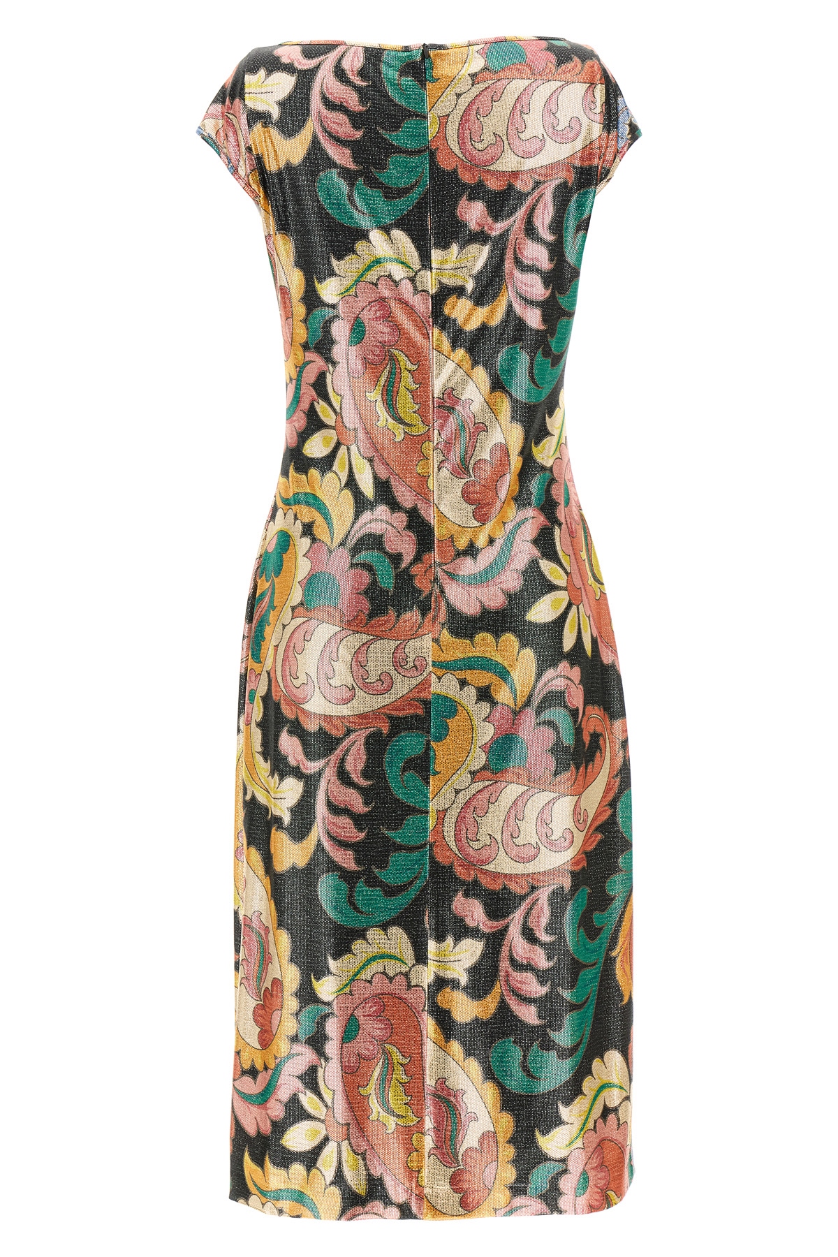 Paisley maxi print laminated jersey dress, crew neck, short sleeves, back zip closure, petticoat.