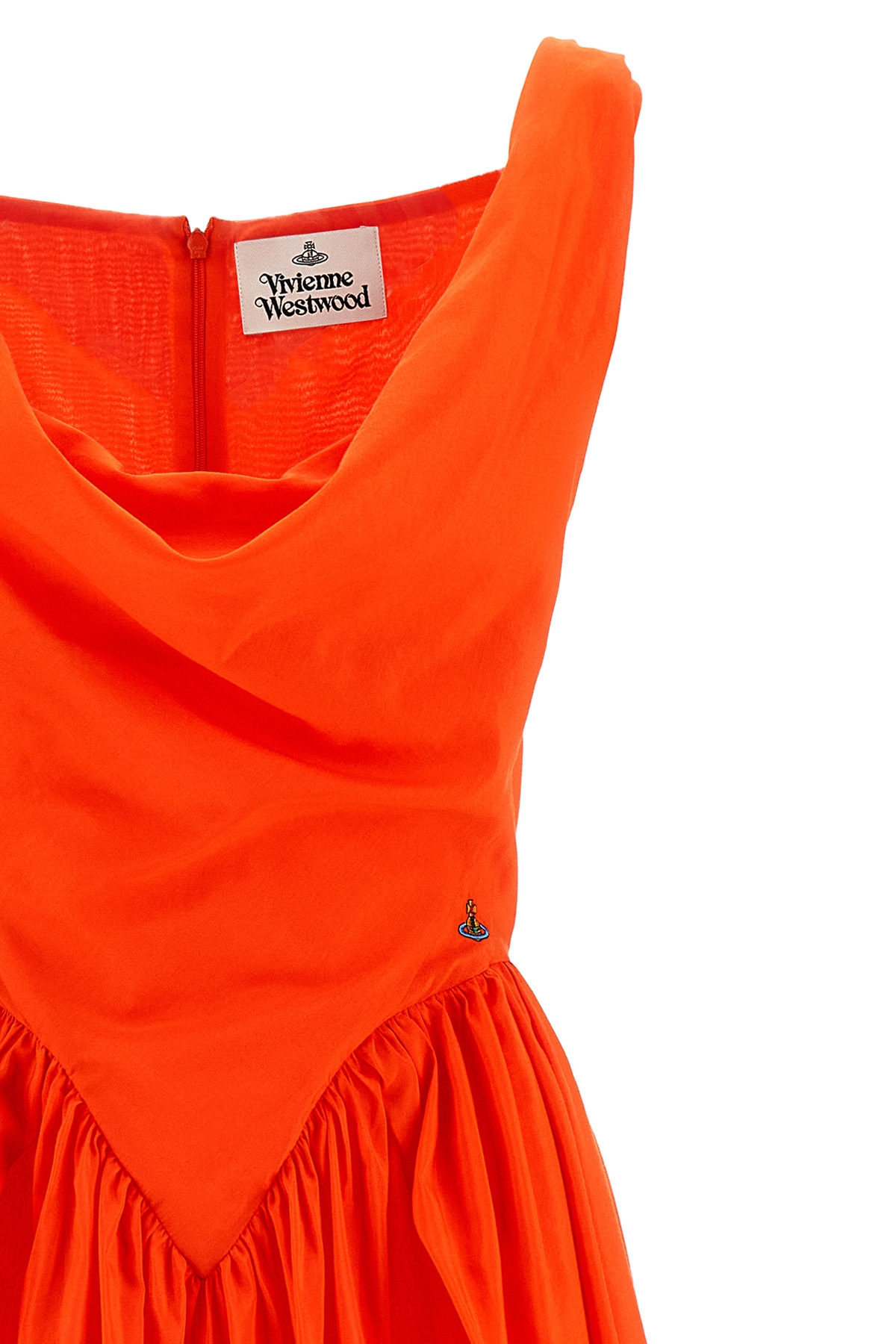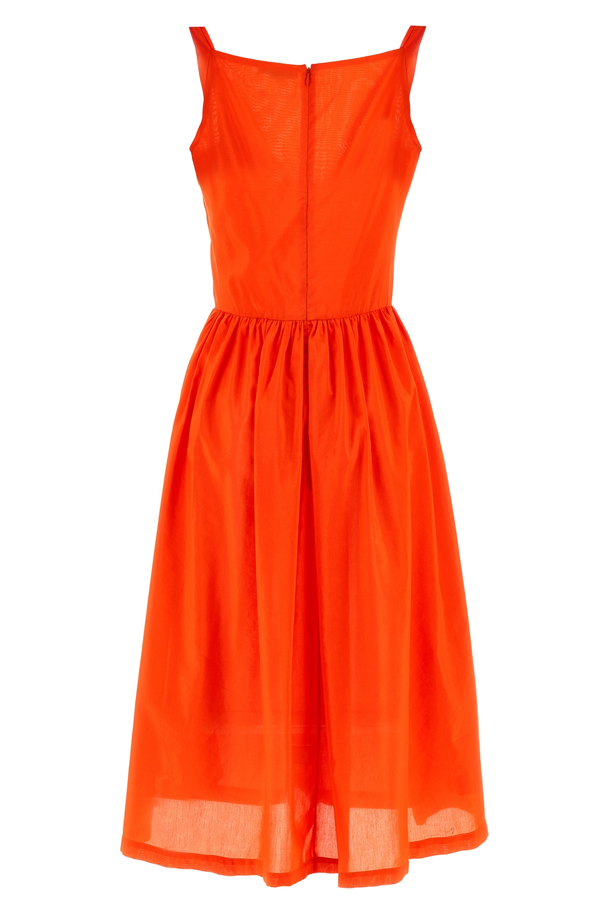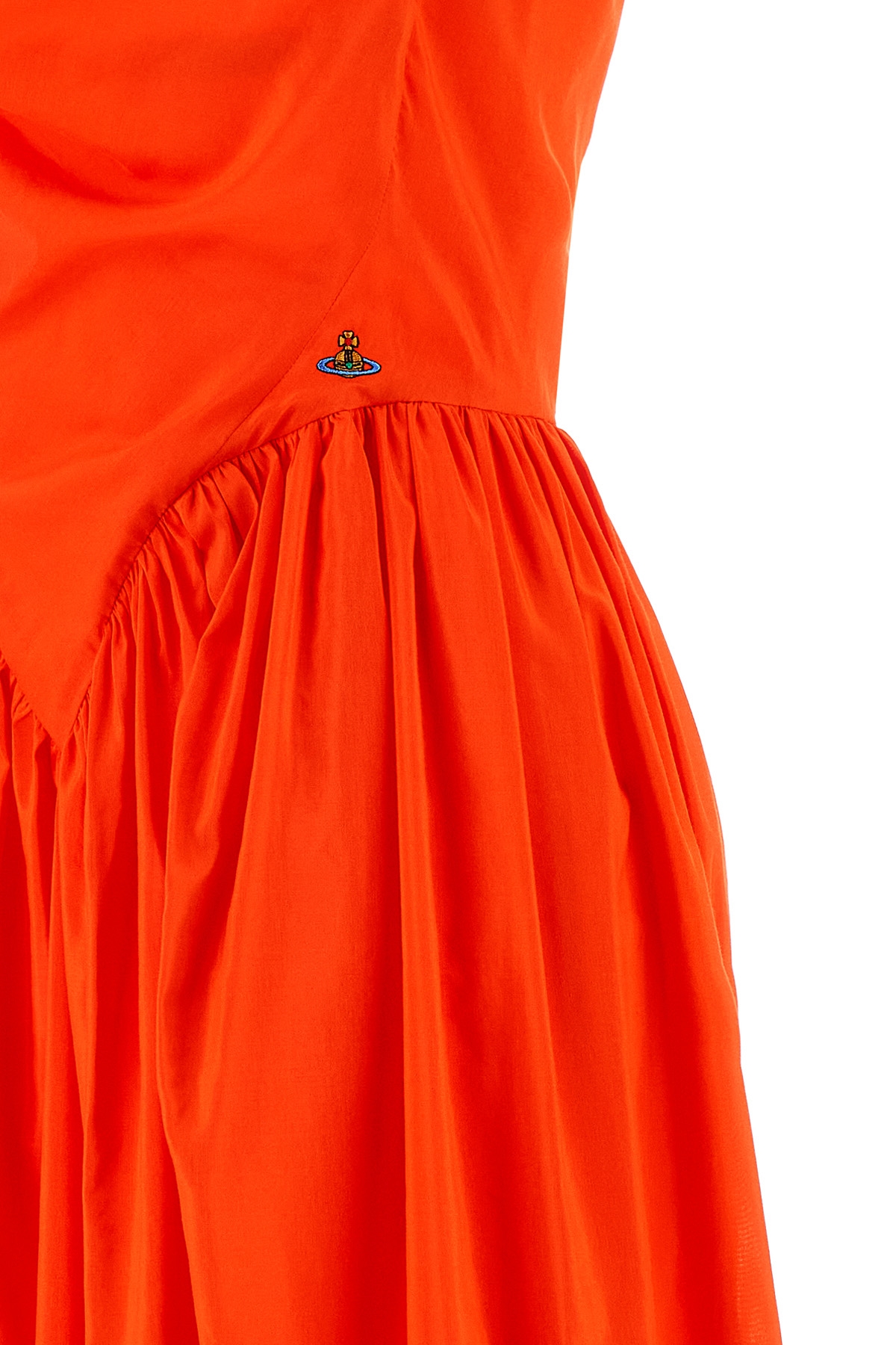 'Sunday' midi dress sculptural corset with draped neckline, front Orb logo embroidery, sleeveless, full skirt with pleats, back zip closure.