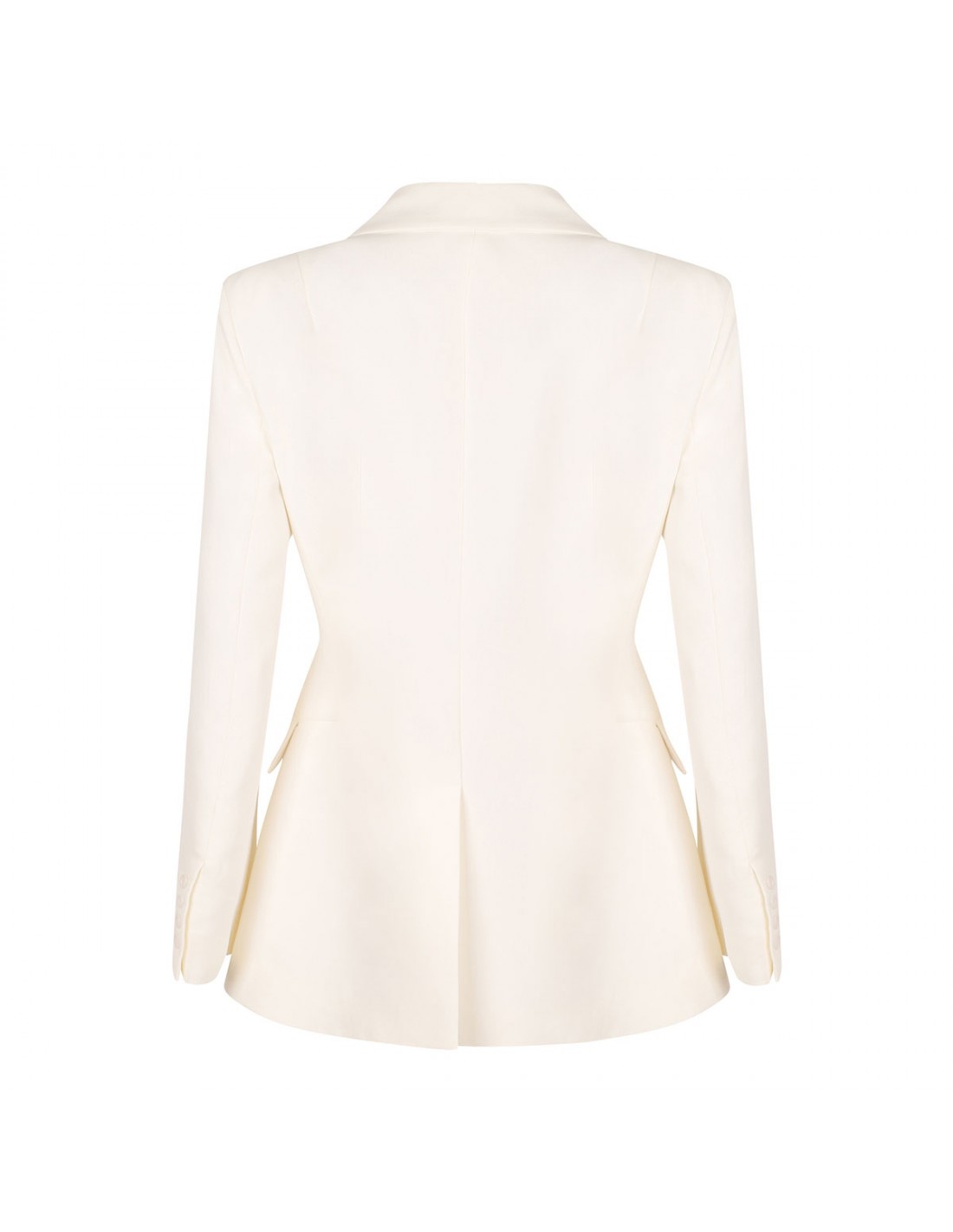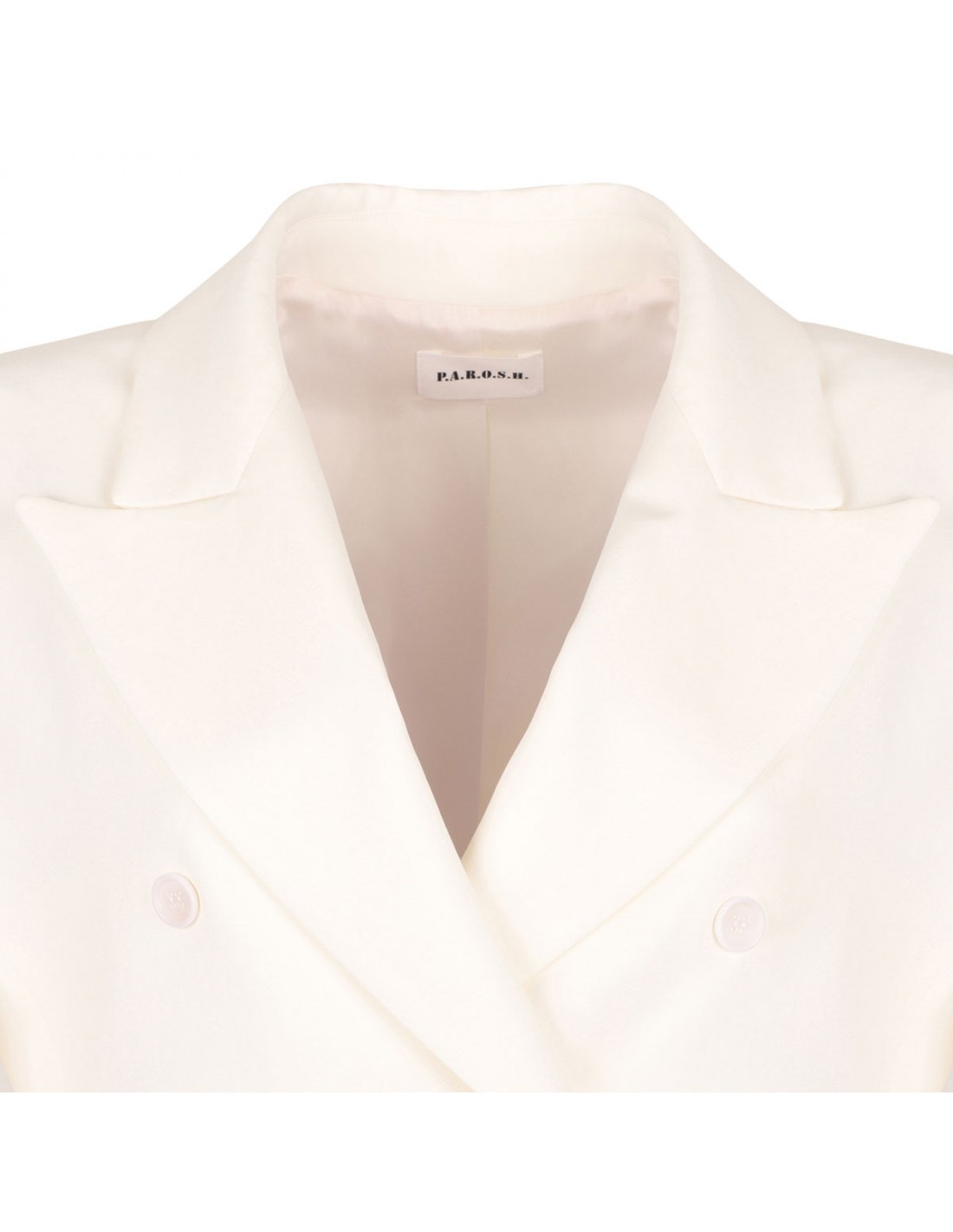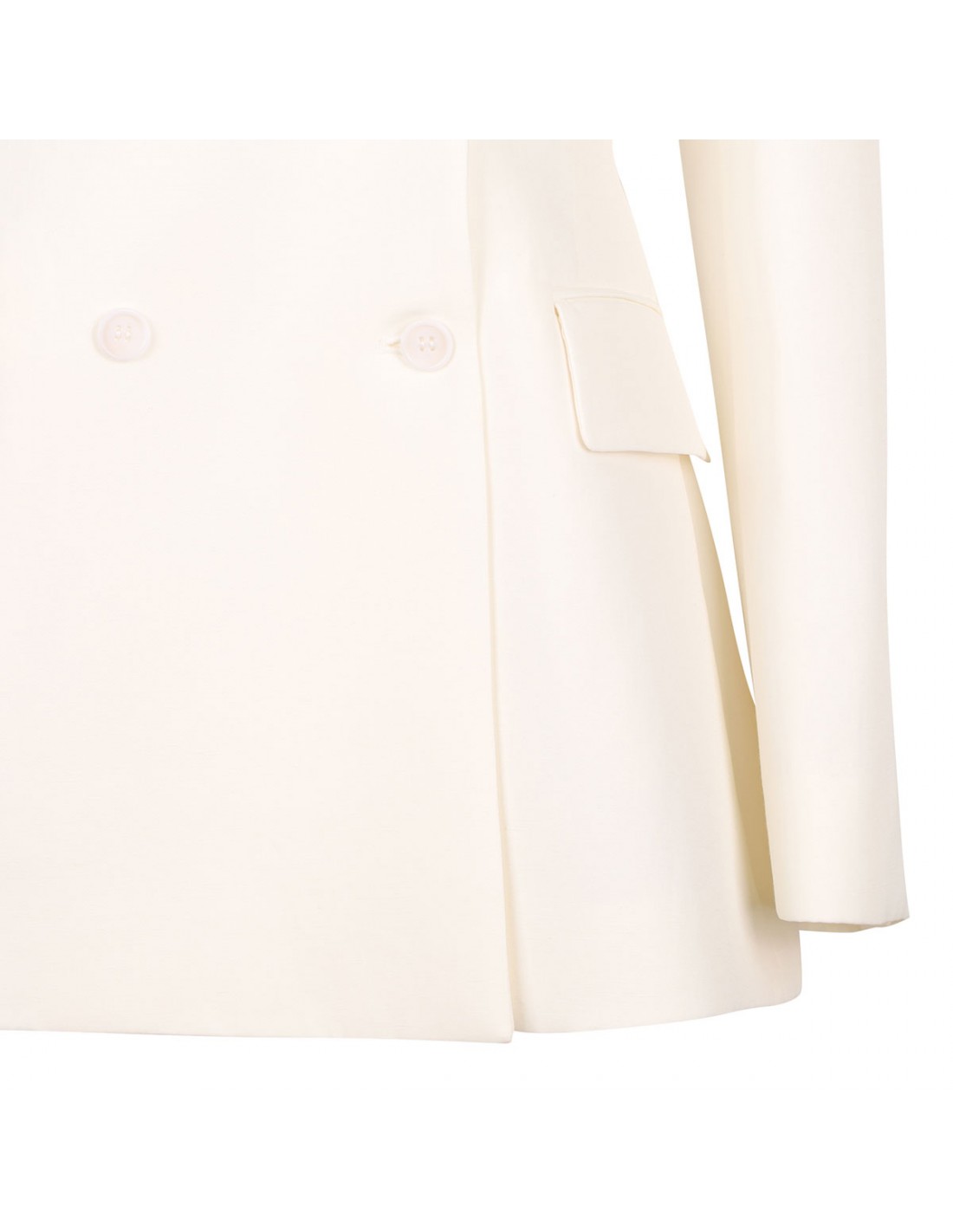 Cream hue viscose and linen blend blazer from PAROSH featuring double breasted style, button closure, peak lapels, side flap pockets, buttoned cuffs and back vent.