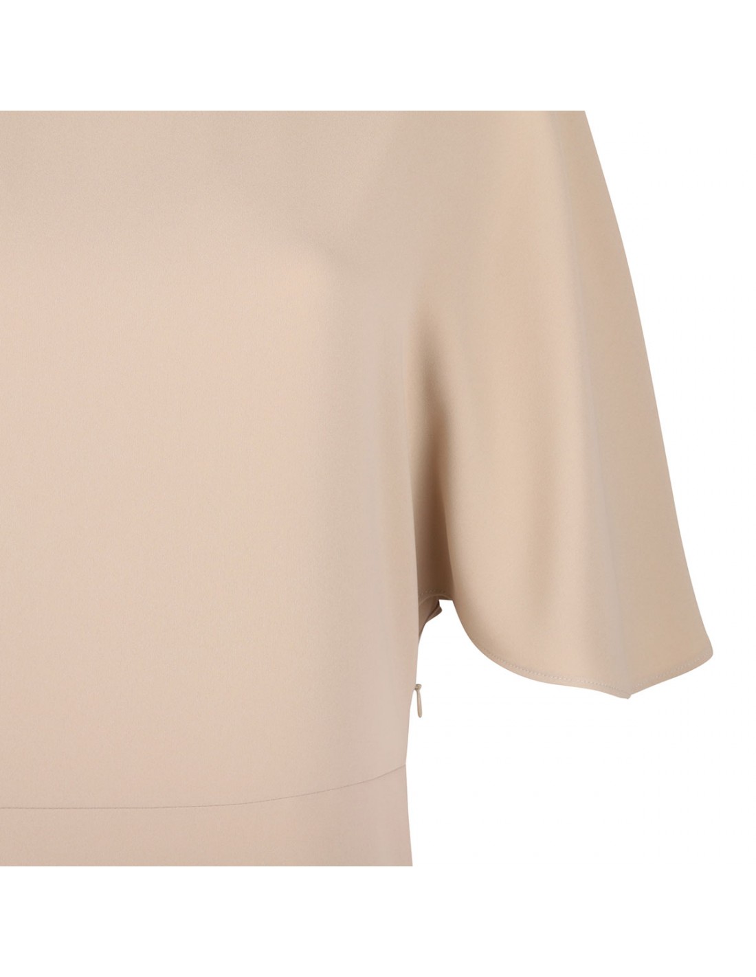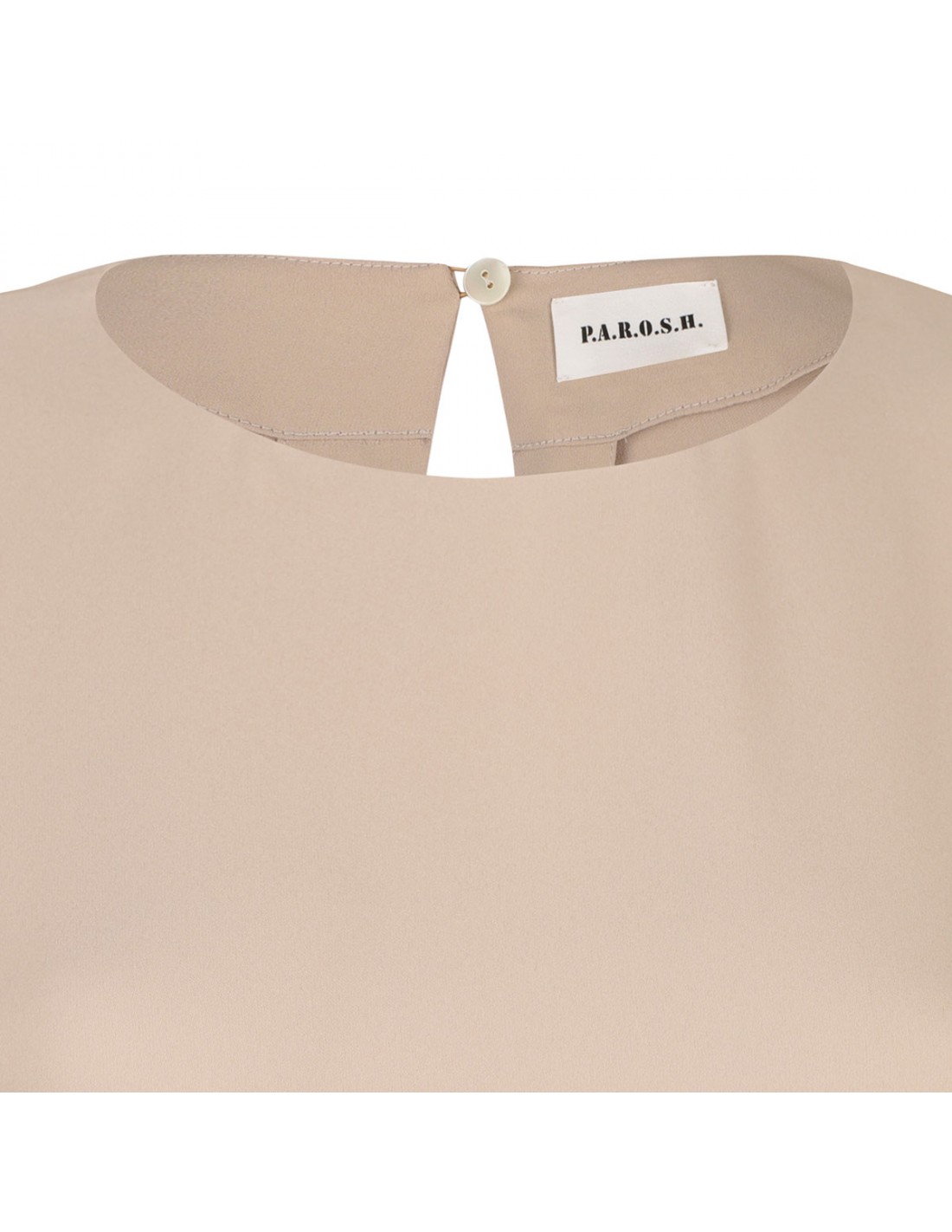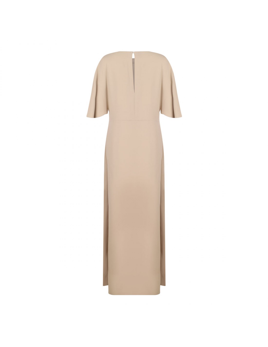 Sand hue cady long dress from PAROSH featuring crew neck, short sleeves, back key-hole with button fastening, deep split on front.