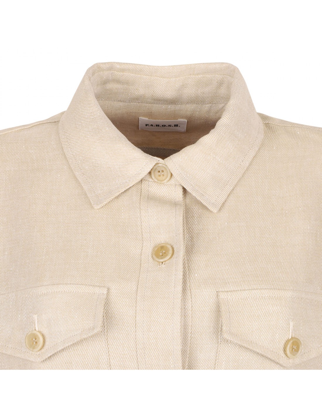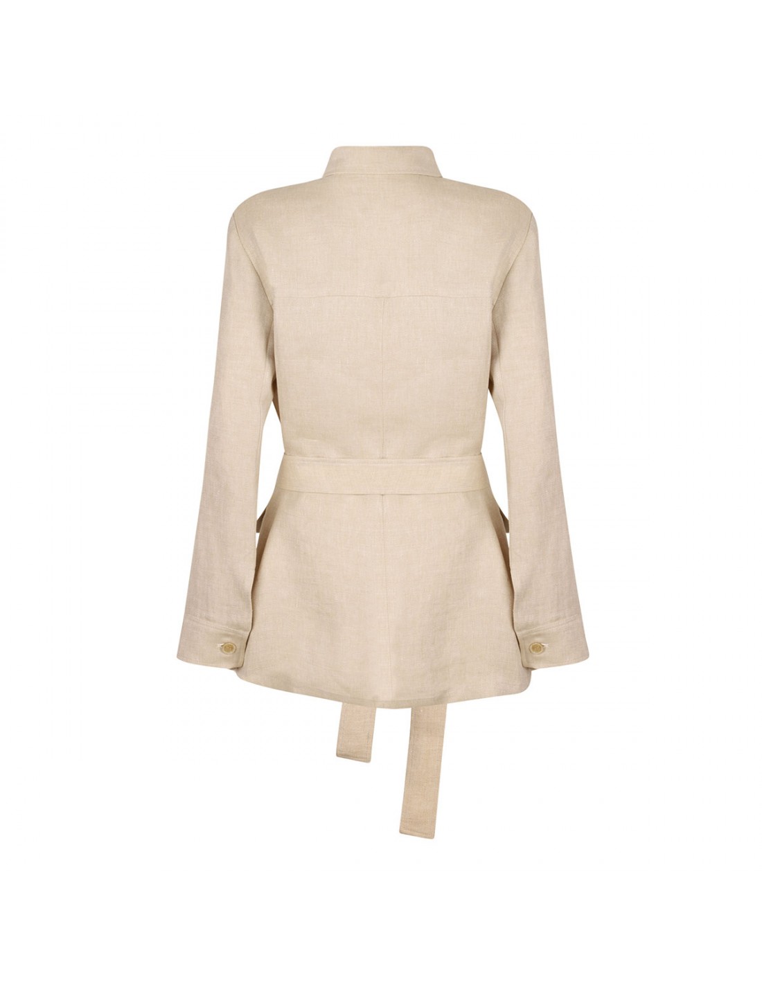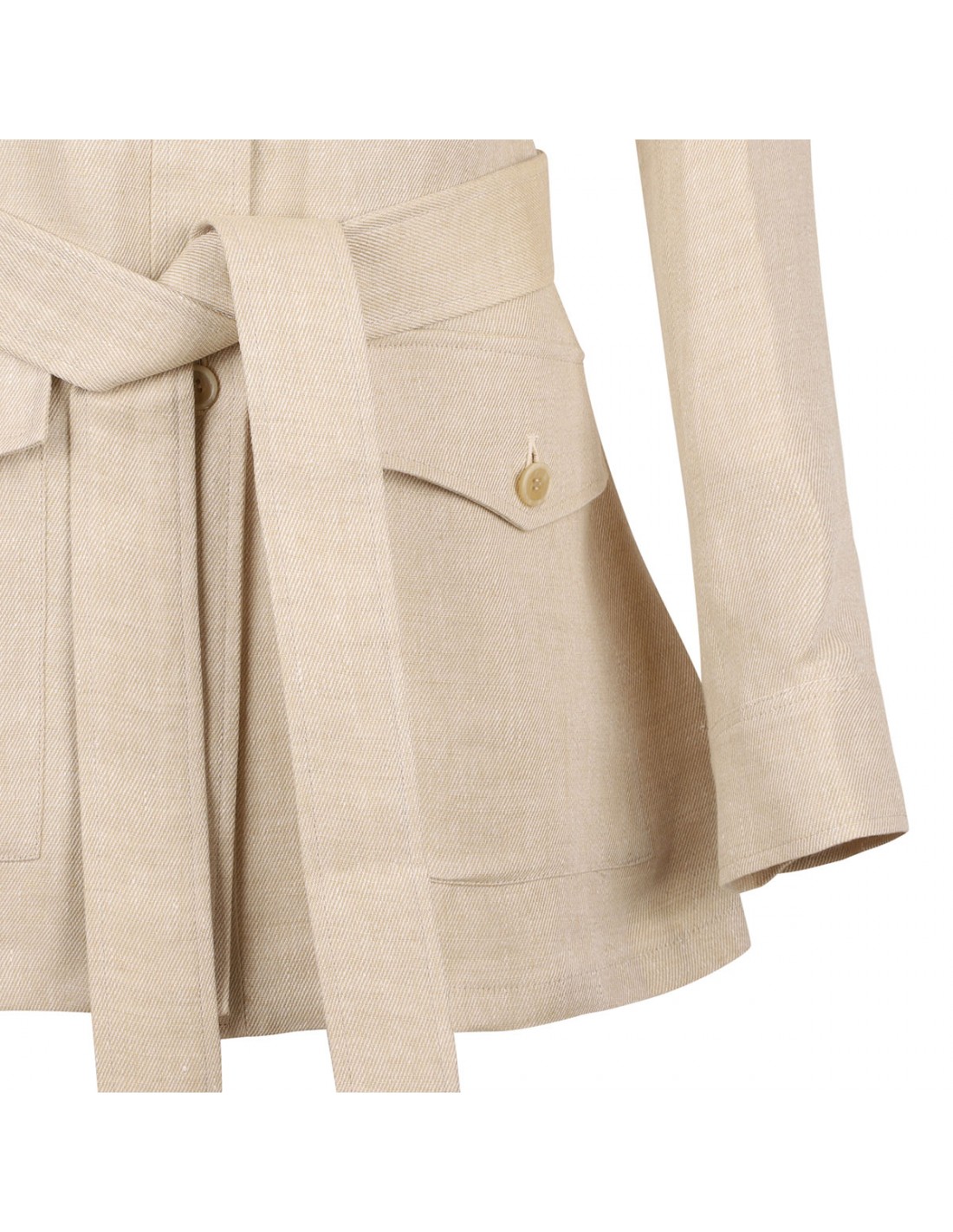 Beige linen sahariana jacket from PAROSH featuring self-tie belt at waist, pointed collar, four double buttoned flap pockets, long sleeves with tabs, button closure at front.