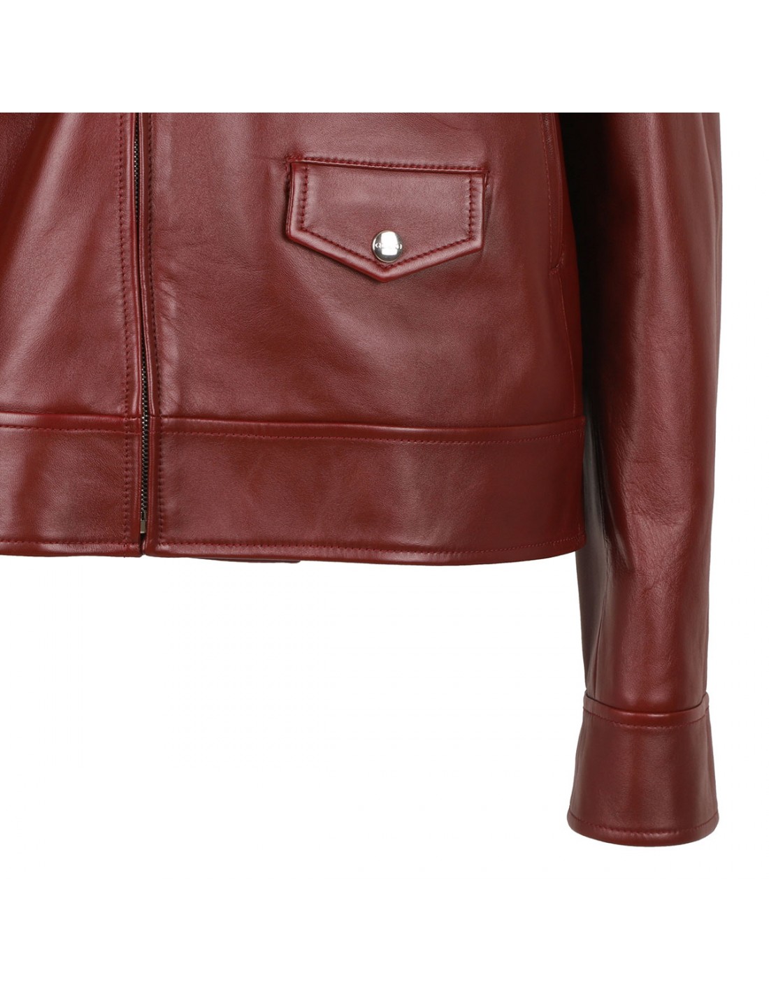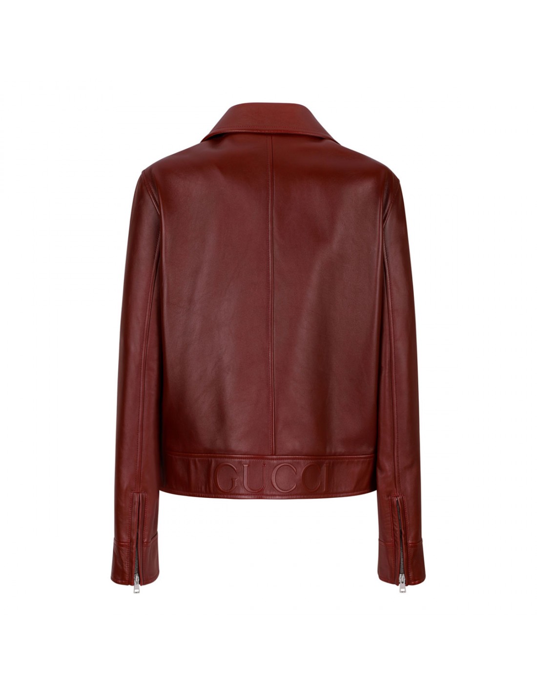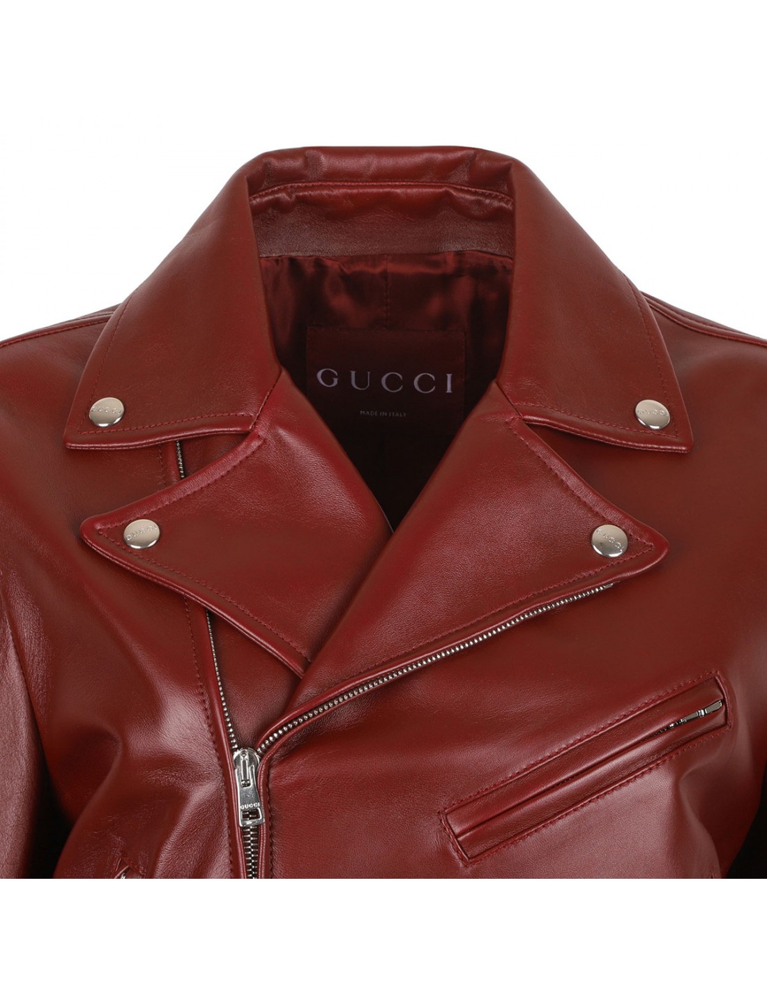 Rosso ancora red leather biker jacket from Gucci featuring metal snap button fastening, peak lapel, long sleeves with zipped cuffs, chest pocket with zip closure, side zipped pockets, one small buttoned flap pocket, asymmetric zip closure. Fully lined.