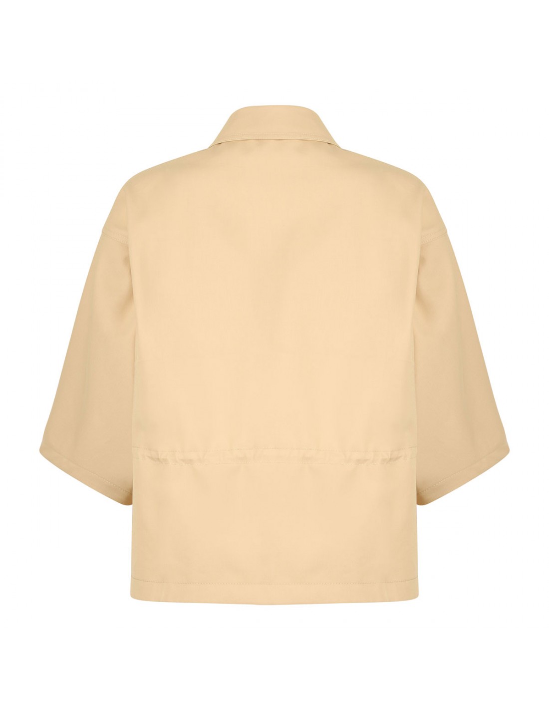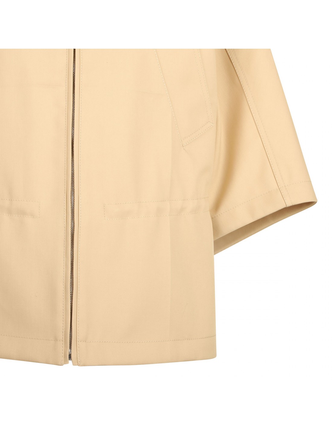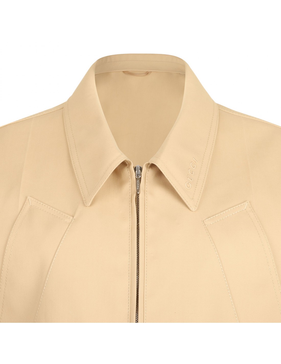 Warm beige hue cotton gabardine blend jacket from Gucci featuring drawstring waist, embossed logo, pointed collar, front zip fastening, short sleeves, two front pockets. Unlined.