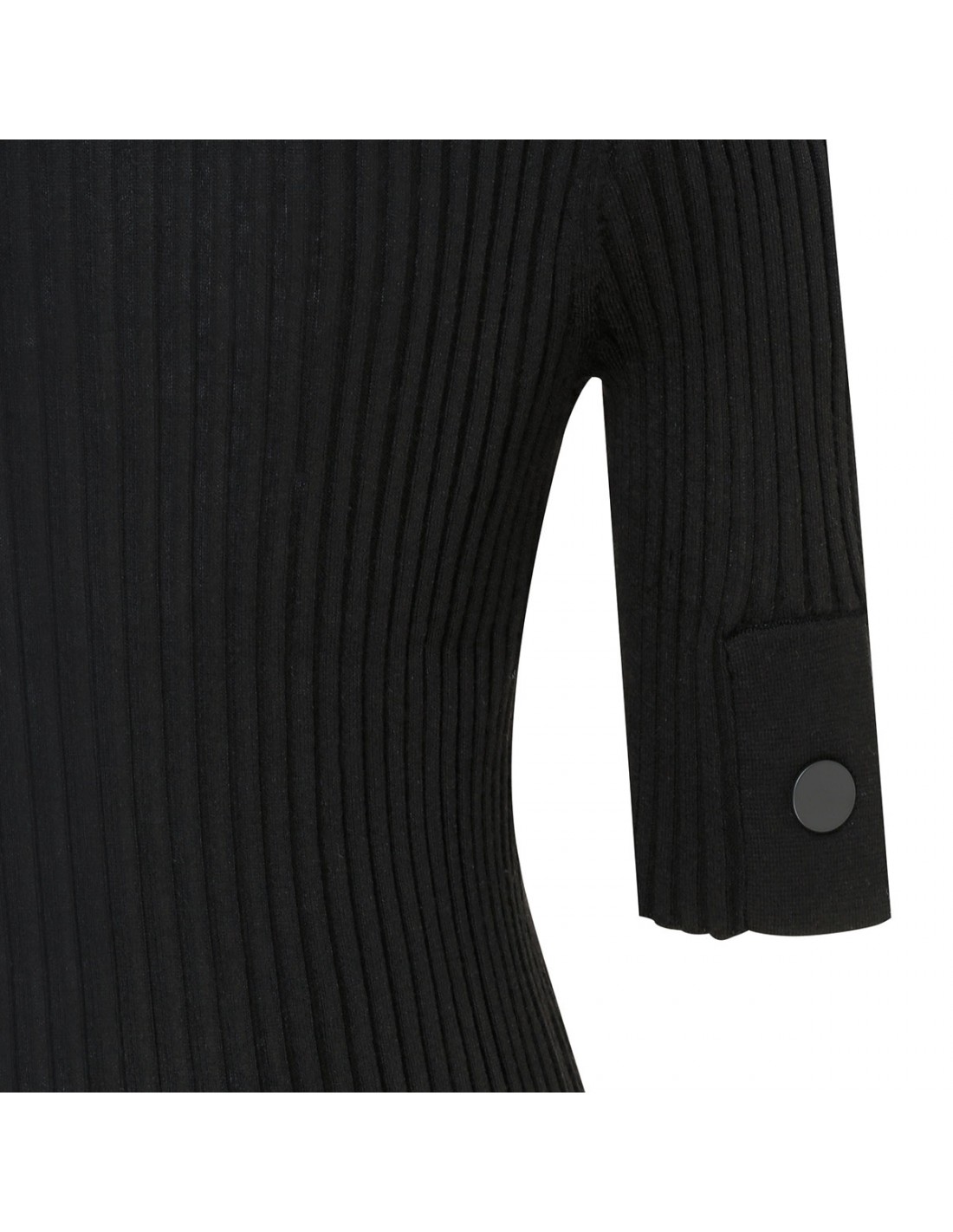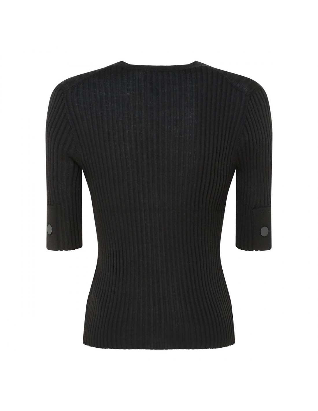 Black ribbed-knit wool and silk blend Snap sweater from Theory featuring crew collar, elbow length sleeves with snap-details, raw-cut hem.