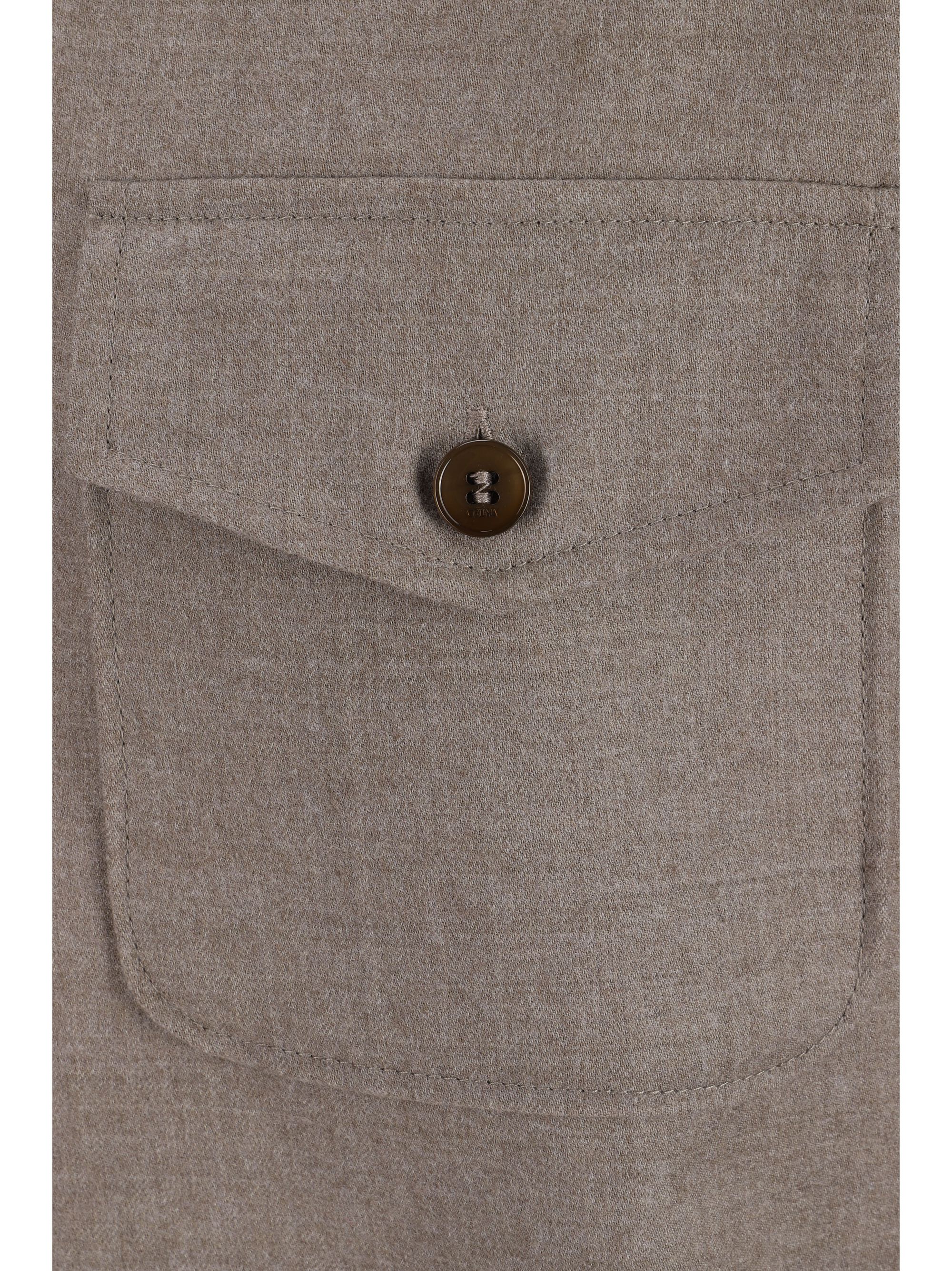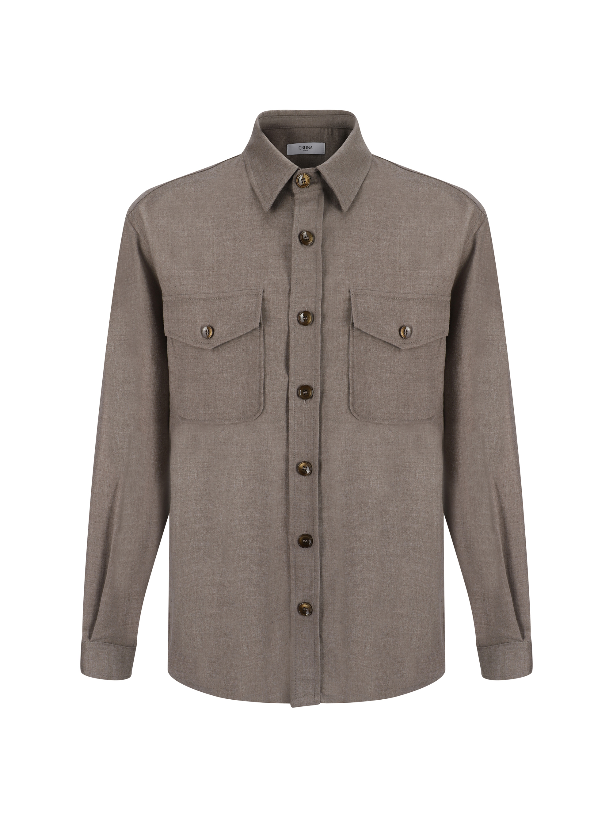 Wool Shirt by Cruna, classic collar, front button closure, two front patch pockets with flap for closure, adjustable button cuffs, monochrome pattern, regular fit
