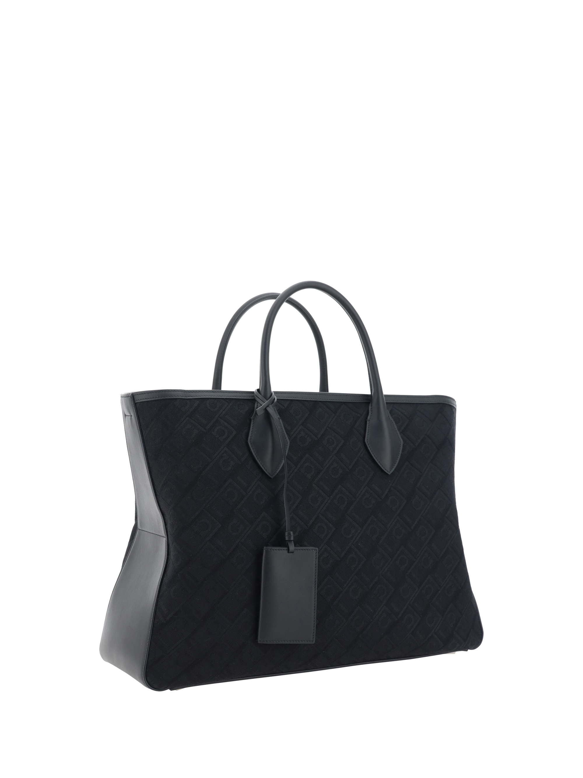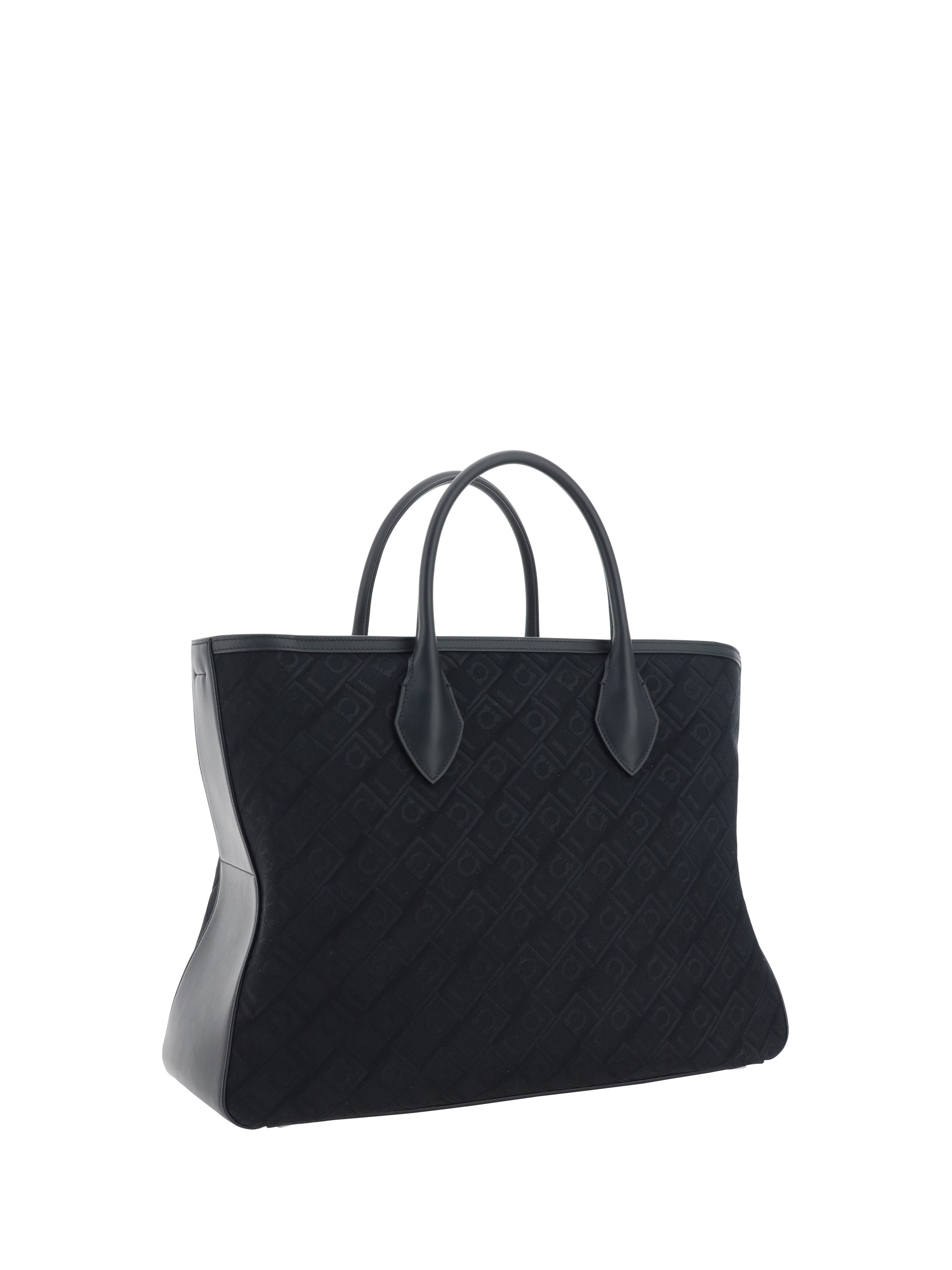 Tote Handbag by Ferragamo, soft jacquard fabric structure, folded sides that echo the star shape, calfskin leather details, metal zipper closure, large interior compartment, topstitched handles, adjustable and removable technical ribbon shoulder strap, badge holder charm attached to the base of the handles.