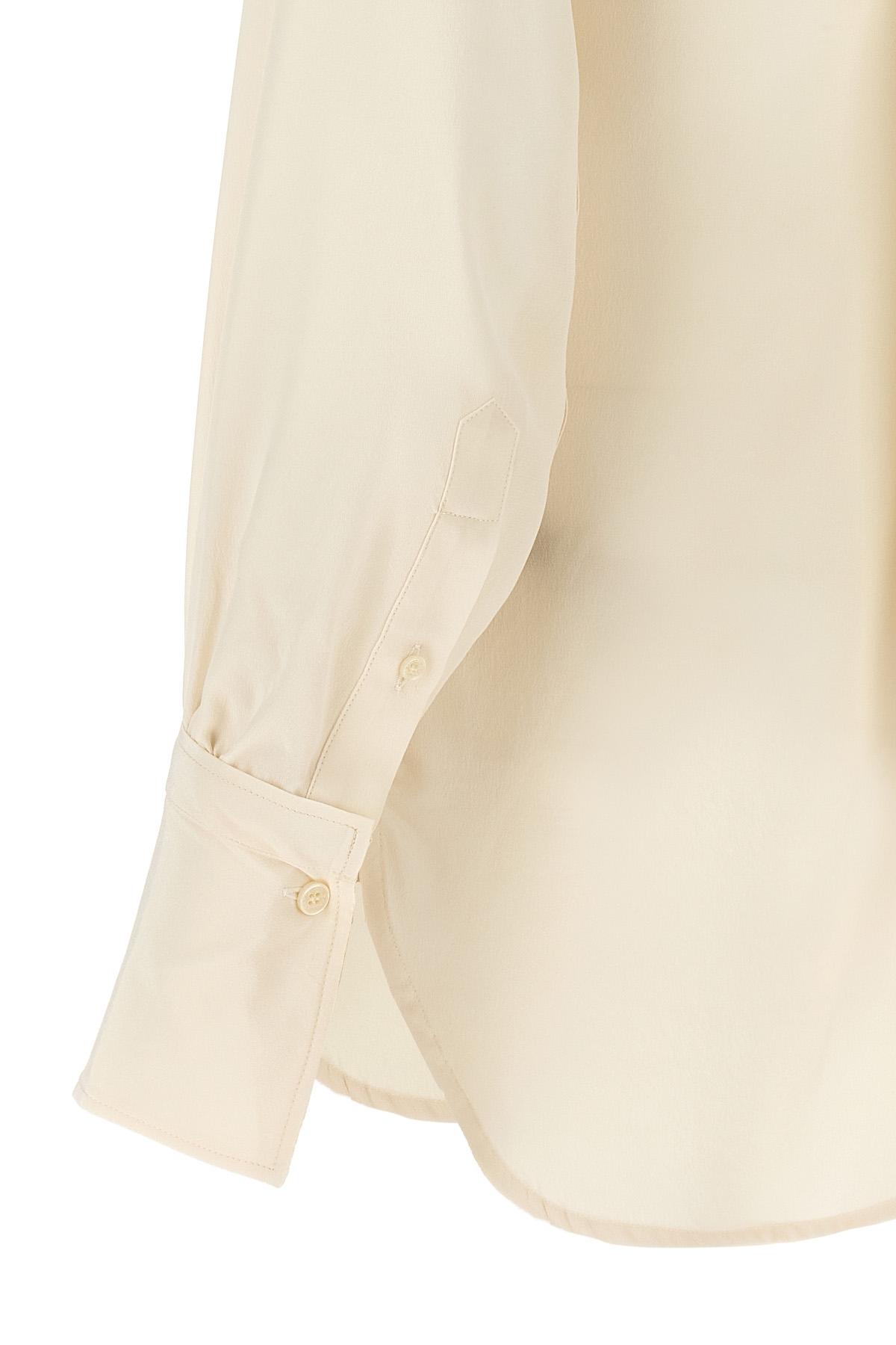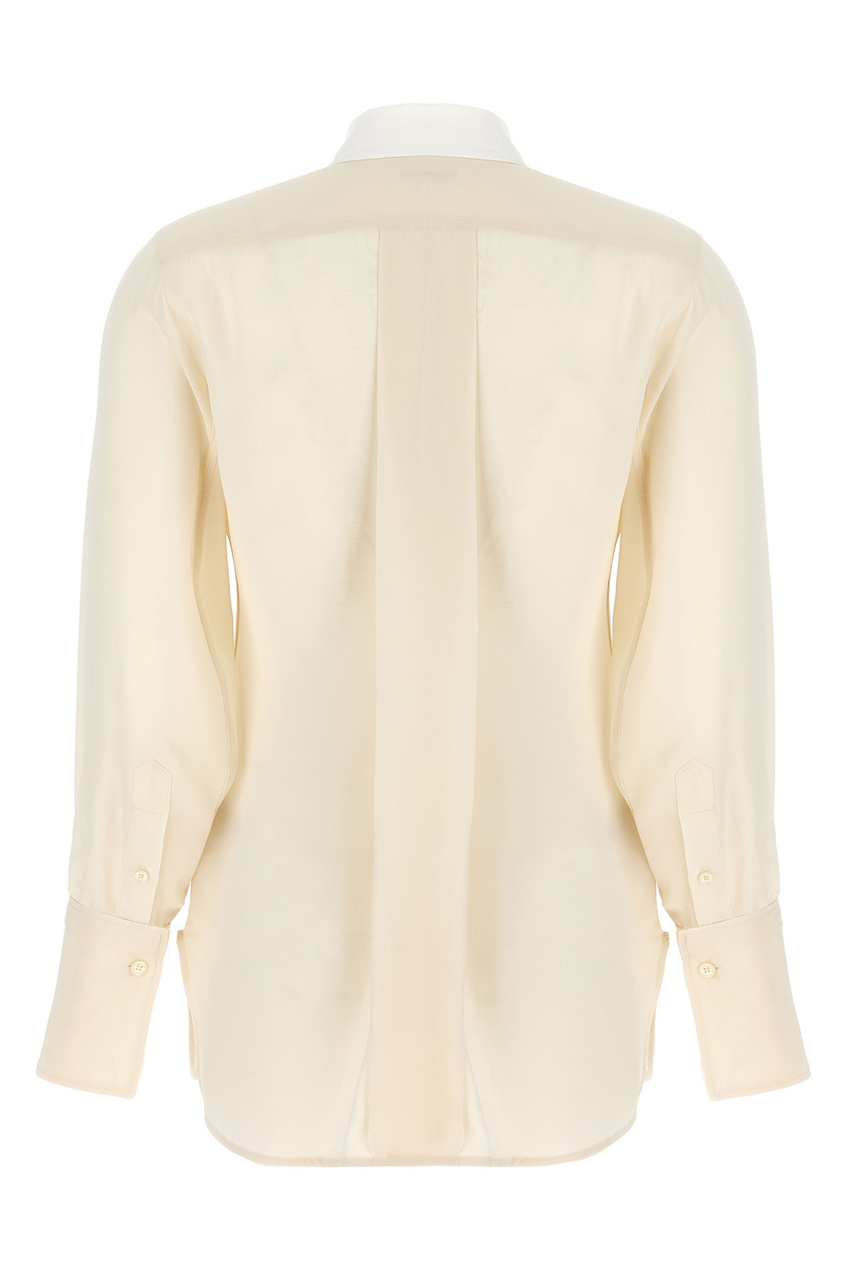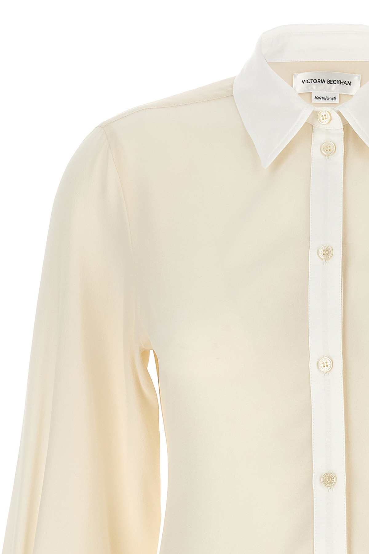 Silk shirt with contrast closure and collar details, buttons, long cuffed sleeves.