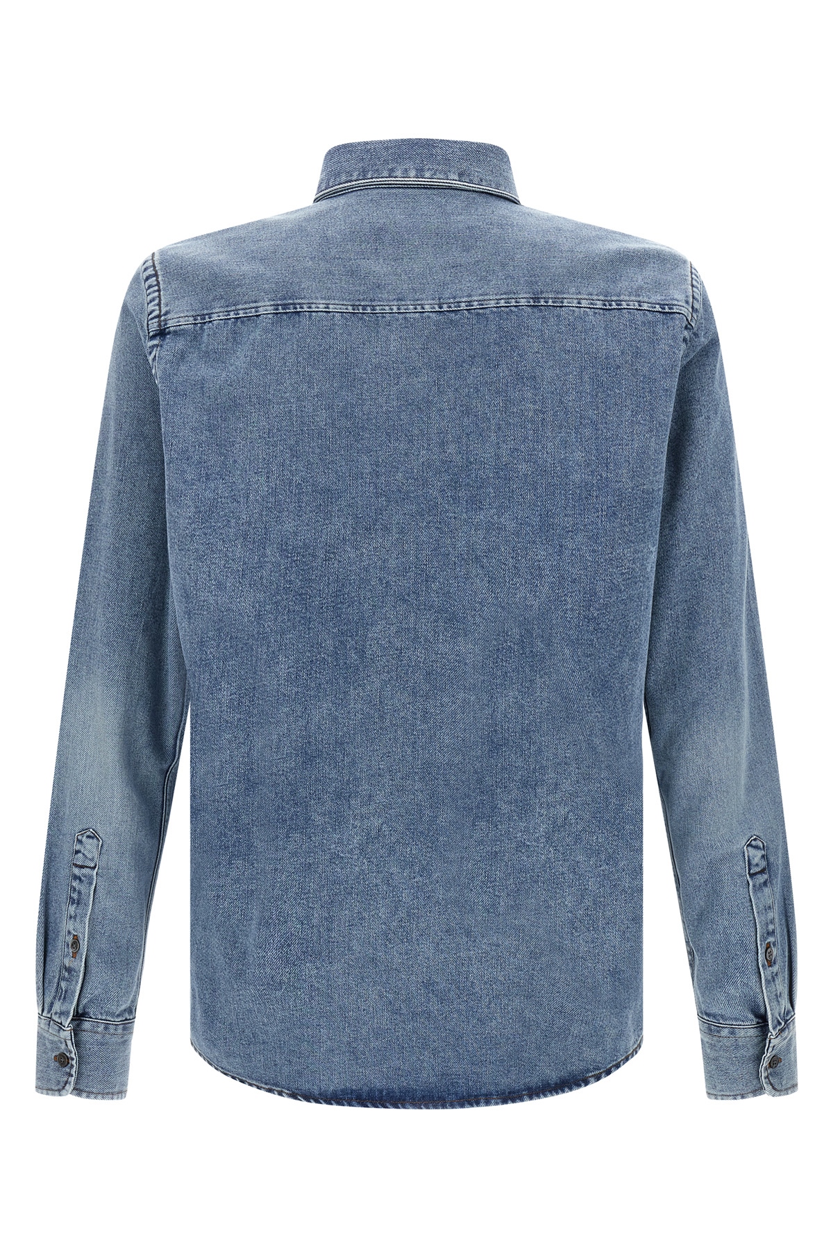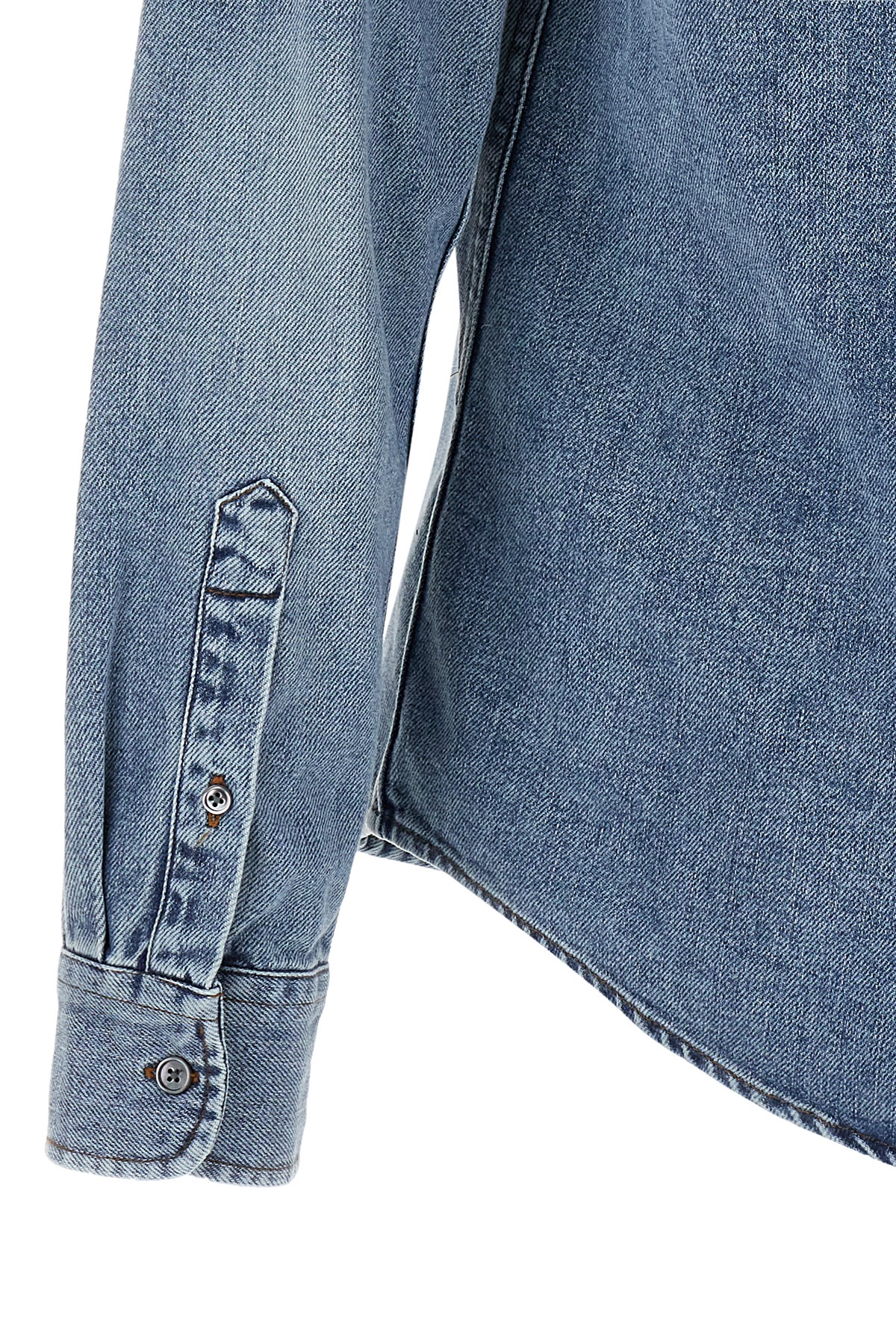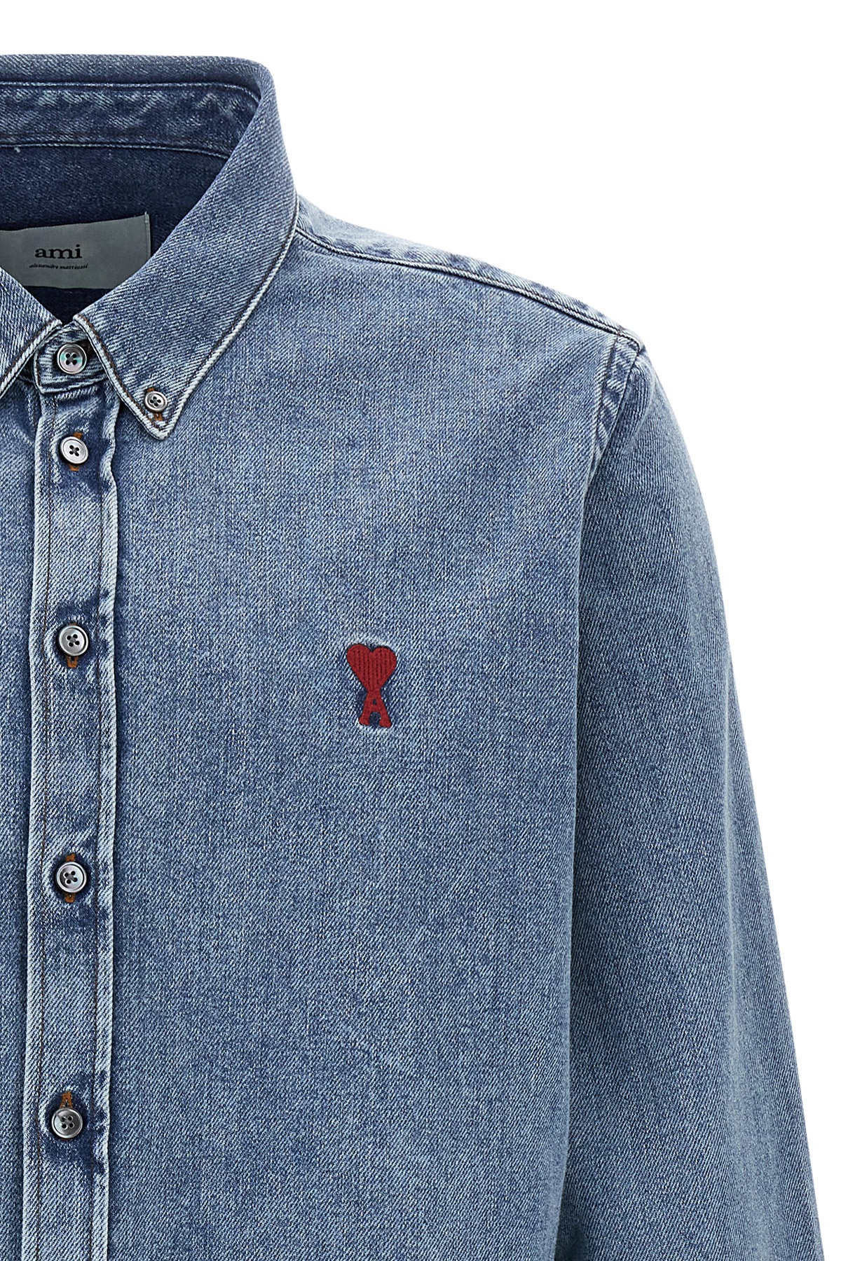 Cotton denim shirt with front 'Ami De Coeur' embroidery, button-down design, button closure, long cuffed sleeves.