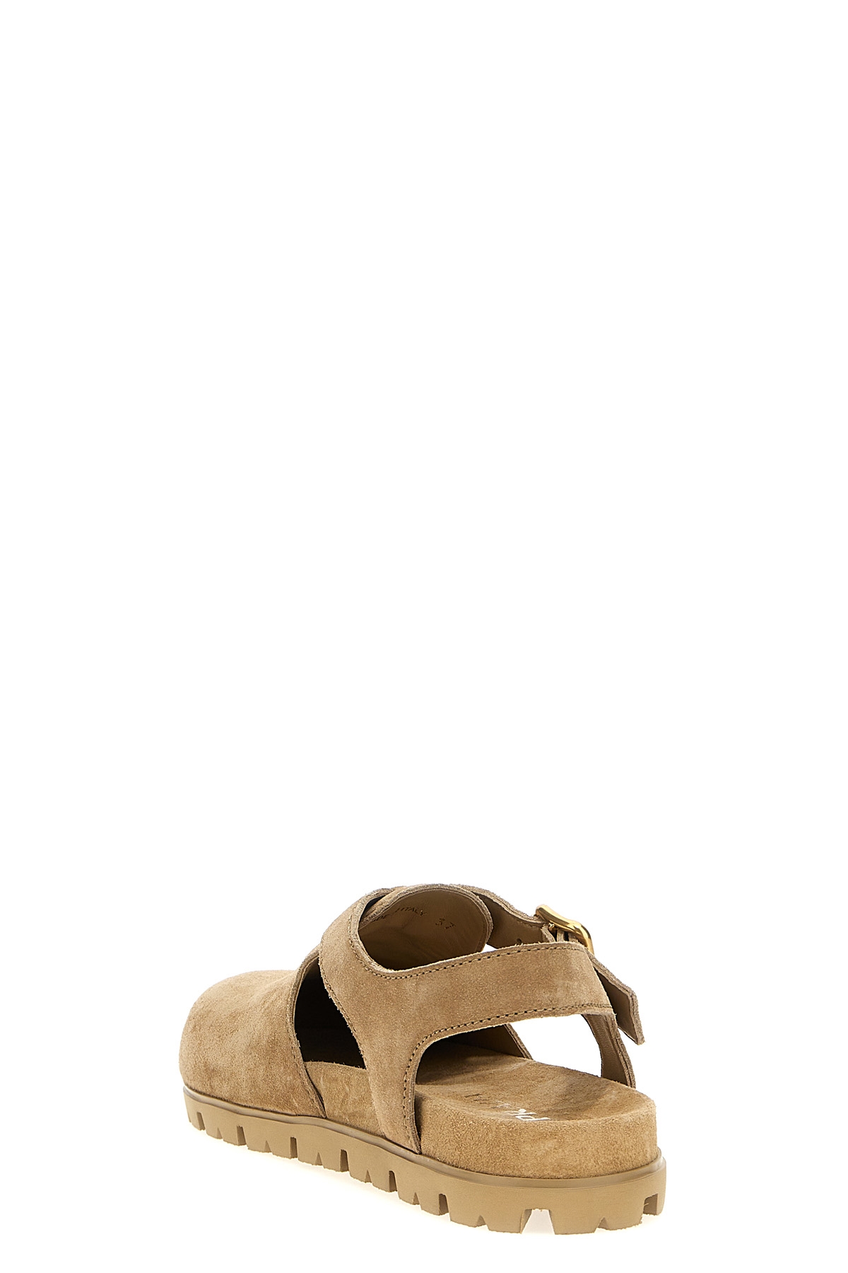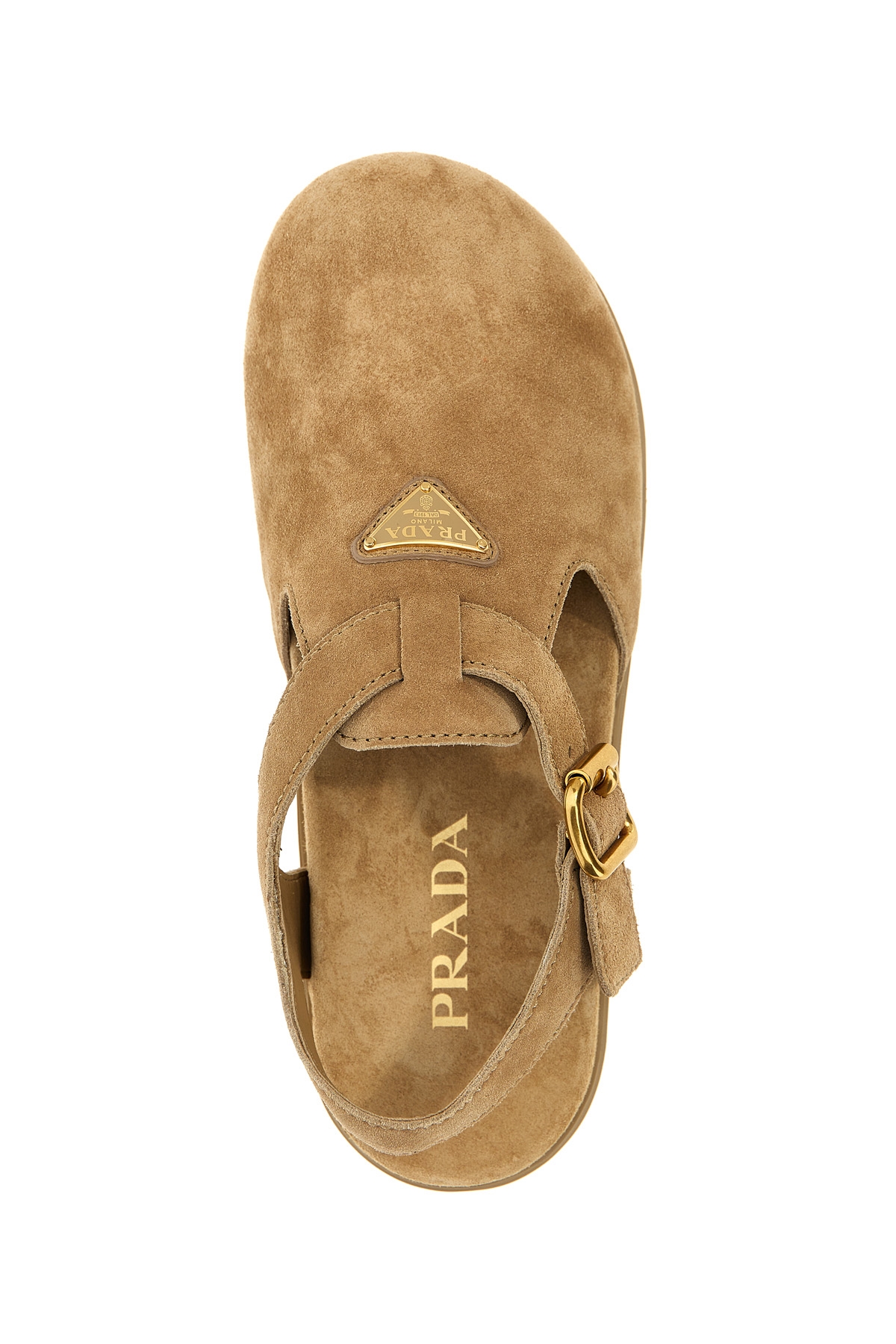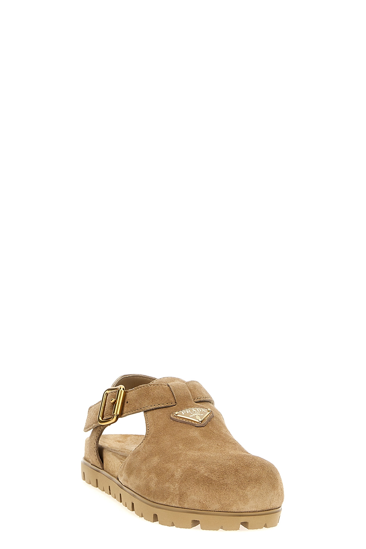 Suede sabots, front enameled metal triangle logo, adjustable strap, rubber sole.