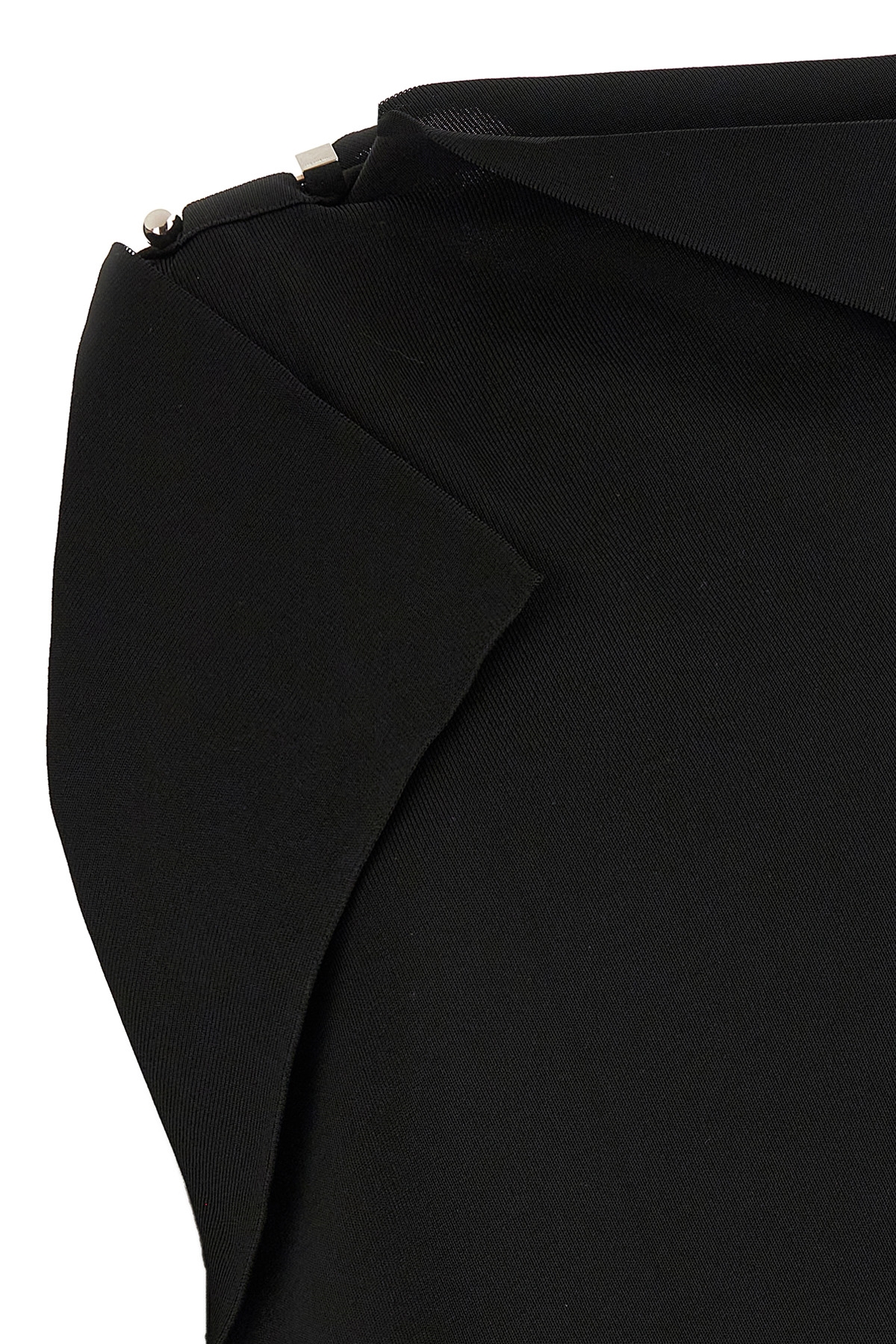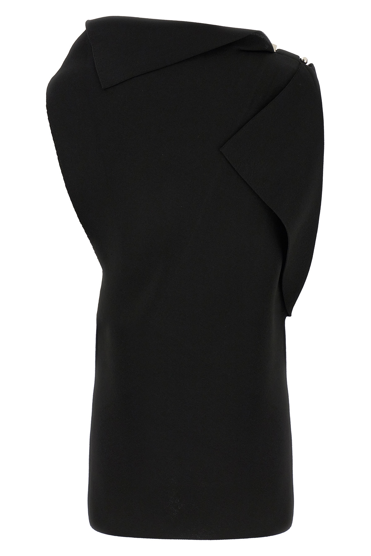 'La Mini Robe Trapeze' dress in 3D effect viscose knit, asymmetrical and draped shape, boat neck, sleeveless, metal Rond-Carre brooch on the shoulder.