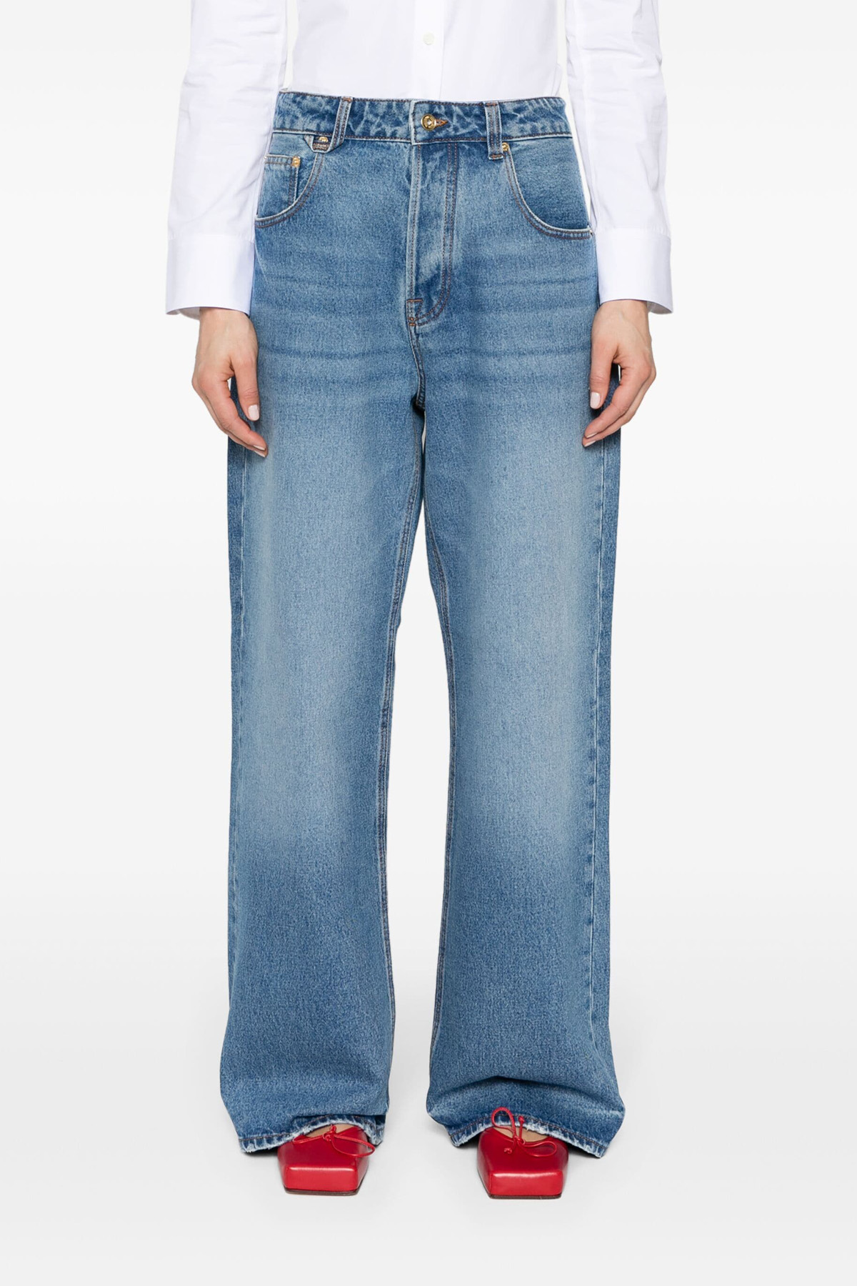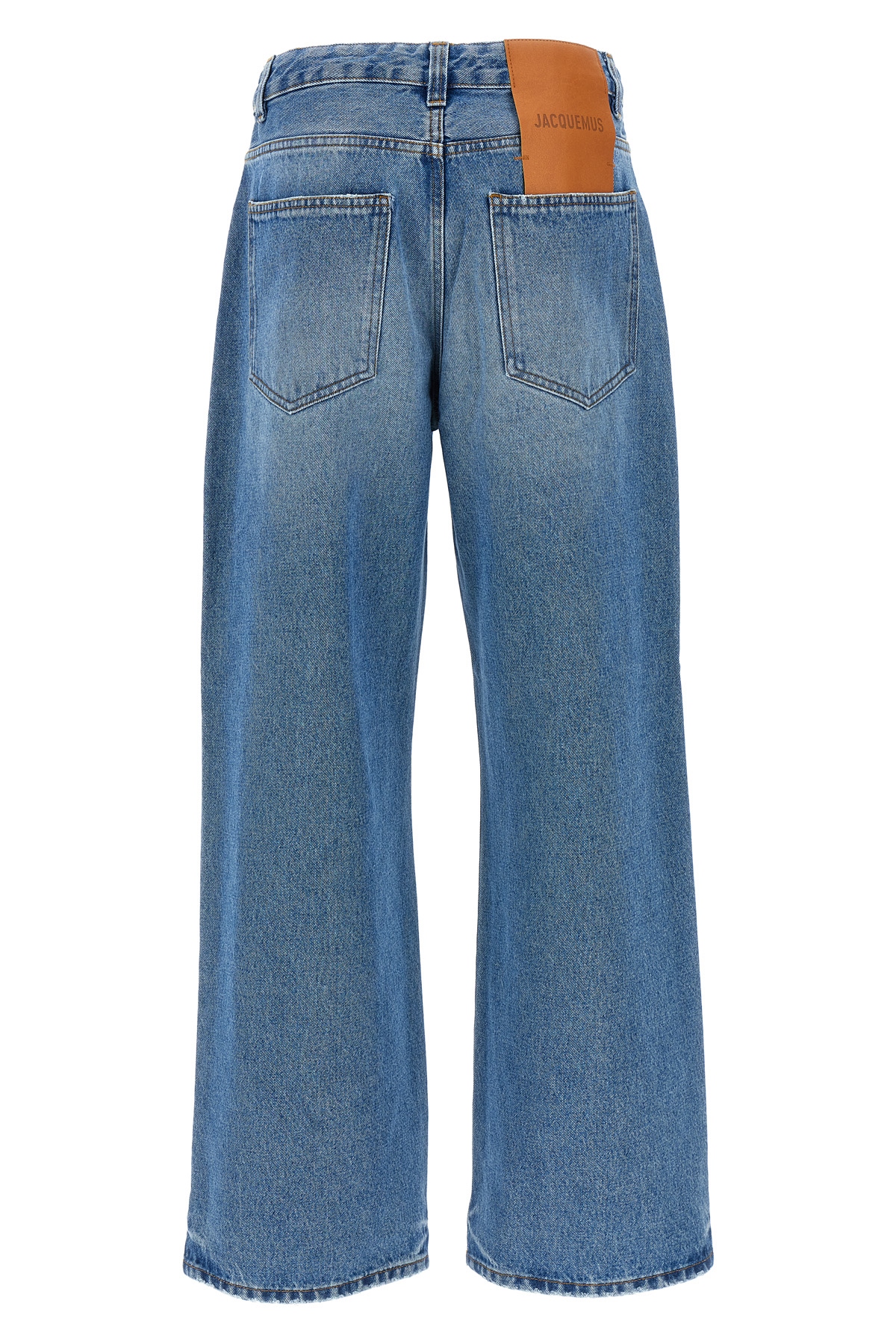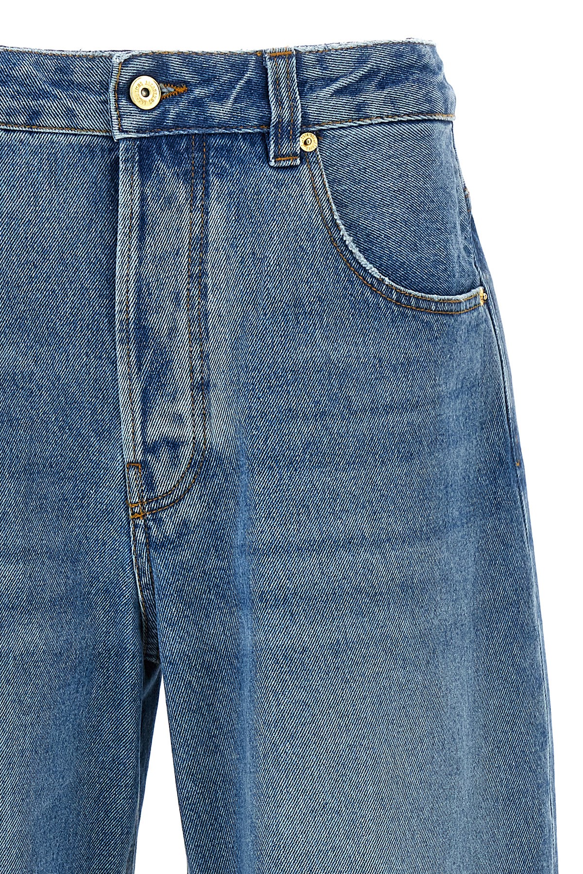 'Le de-Nimes Large' cotton denim jeans with used-effect details, button closure, five pockets, maxi leather logo label on the back.