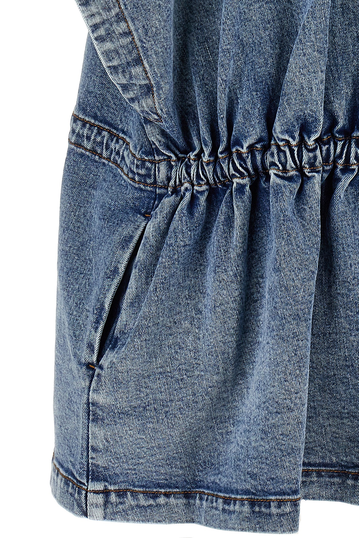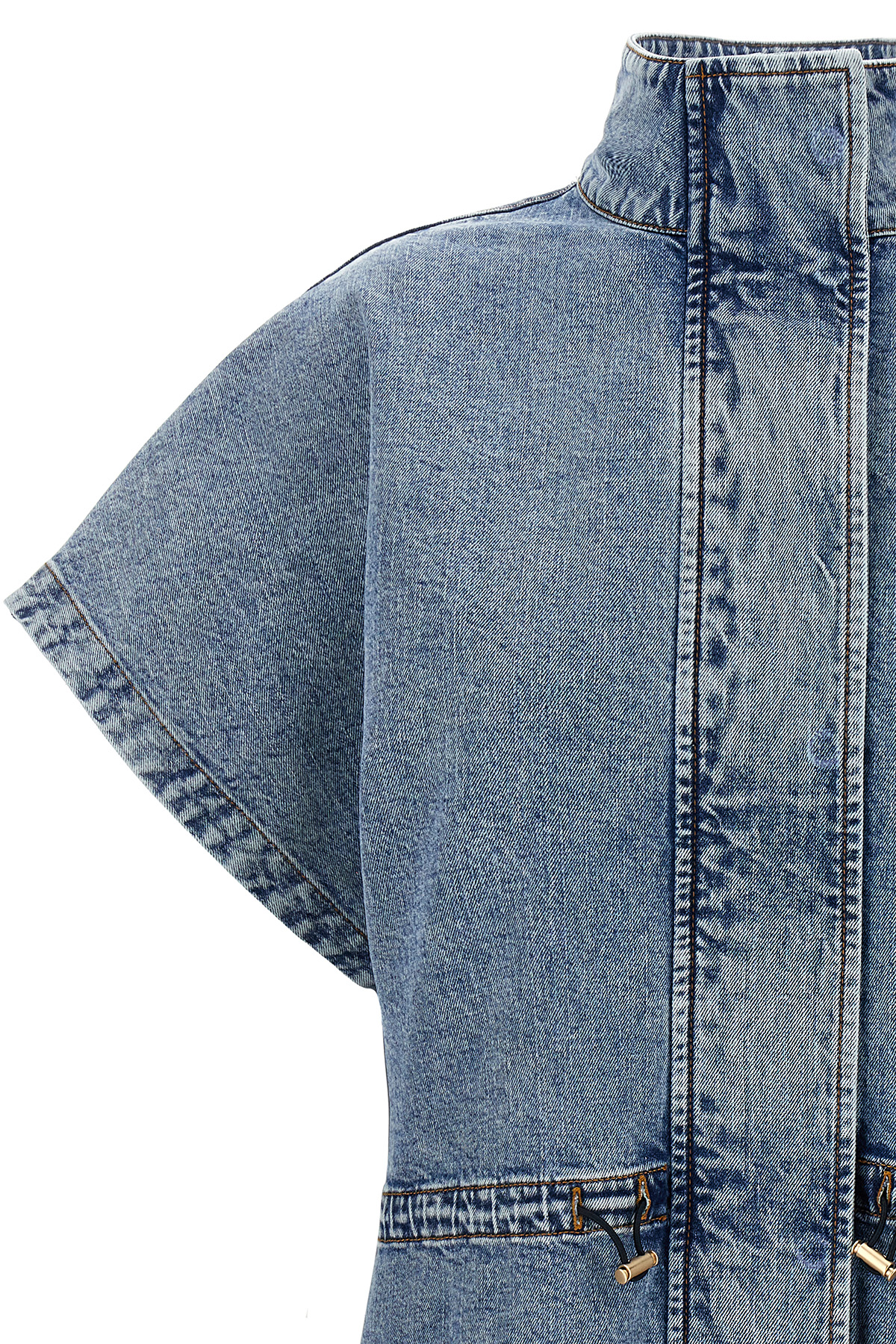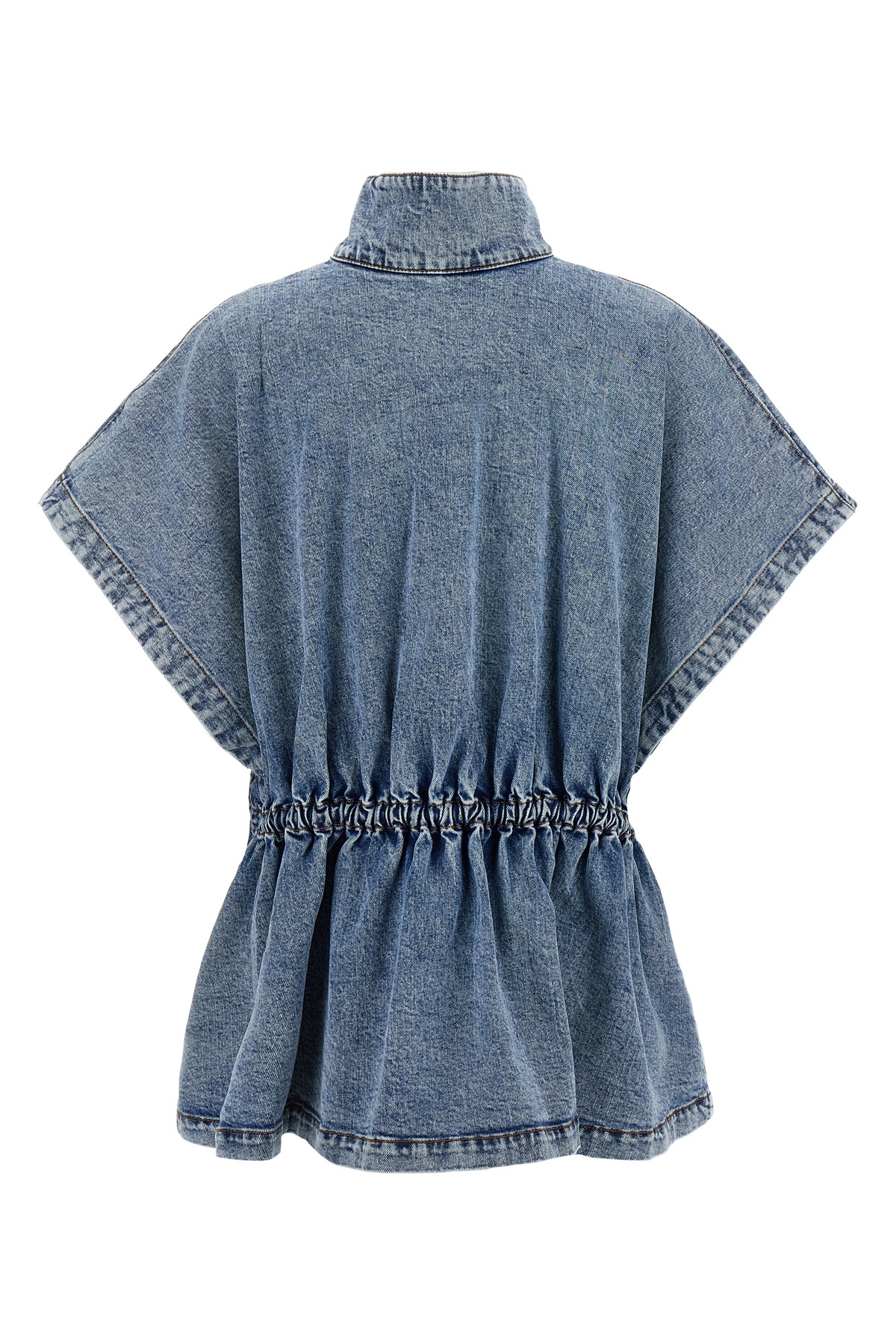 Marbled denim cape, diamond thread detail at the back, high neck, front zip and snap button closure, adjustable drawstring at the waist, and short sleeves.