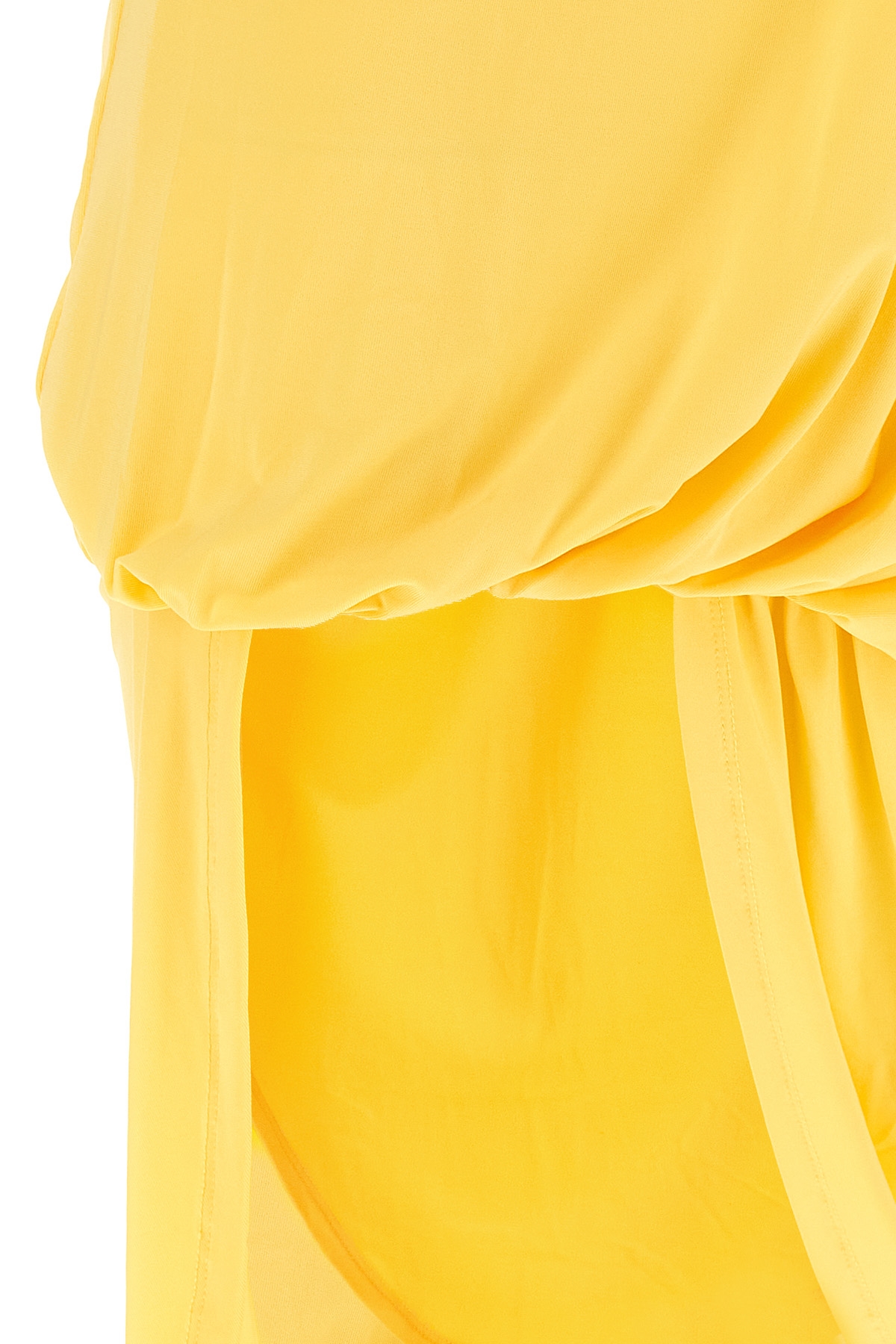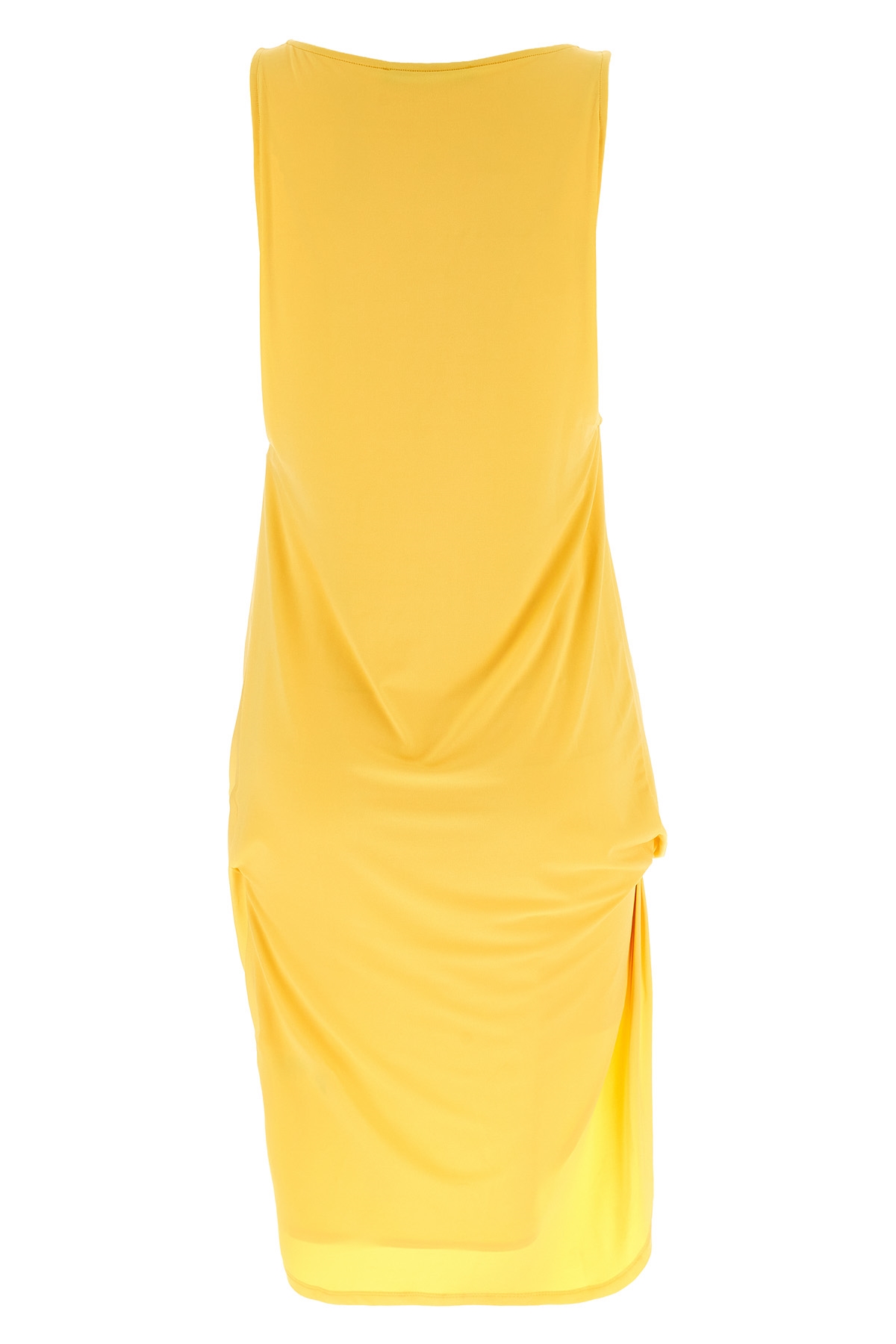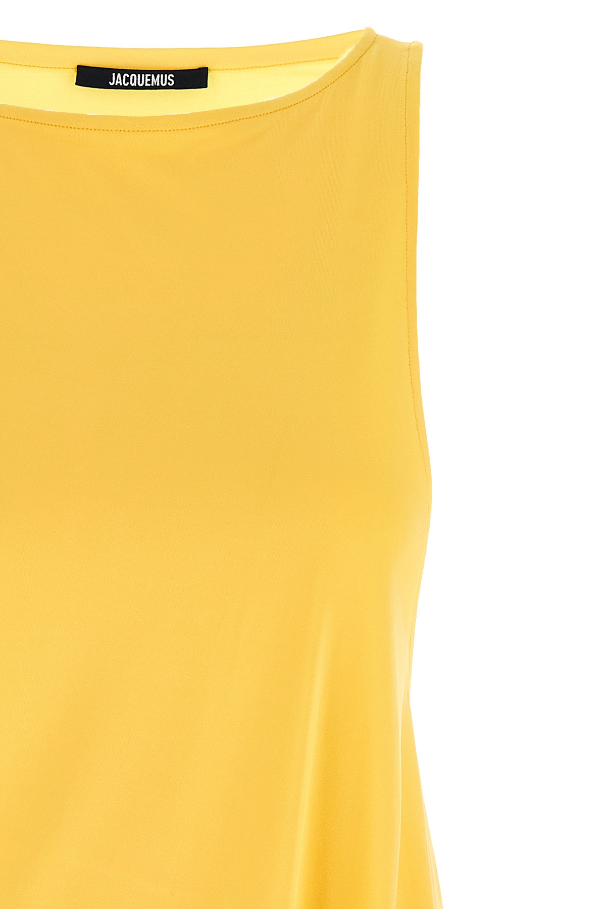 'La Robe Peplo Courte' fluid jersey dress with square neckline, sleeveless with wide armholes, elasticized hem with asymmetrical draping.